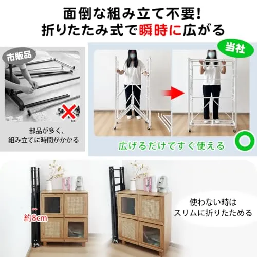 【組立簡単】この折り畳みラックは左右に開くだけで簡単に使用できます。手間がかからず女性でも簡単に組み立てられます。一人暮らしの方でも安心してご利用いただけます。