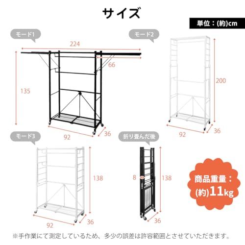 【折り畳み機能で省スペース】ハンガーラックには折り畳み機能がありますので、使用しない時は簡単に収納できます。収納後の幅は約9cmとコンパクトなので、ちょっとした隙間にも収納可能です。本体重量は約8.1 kgのため、軽量で引越しや移動も簡単です。