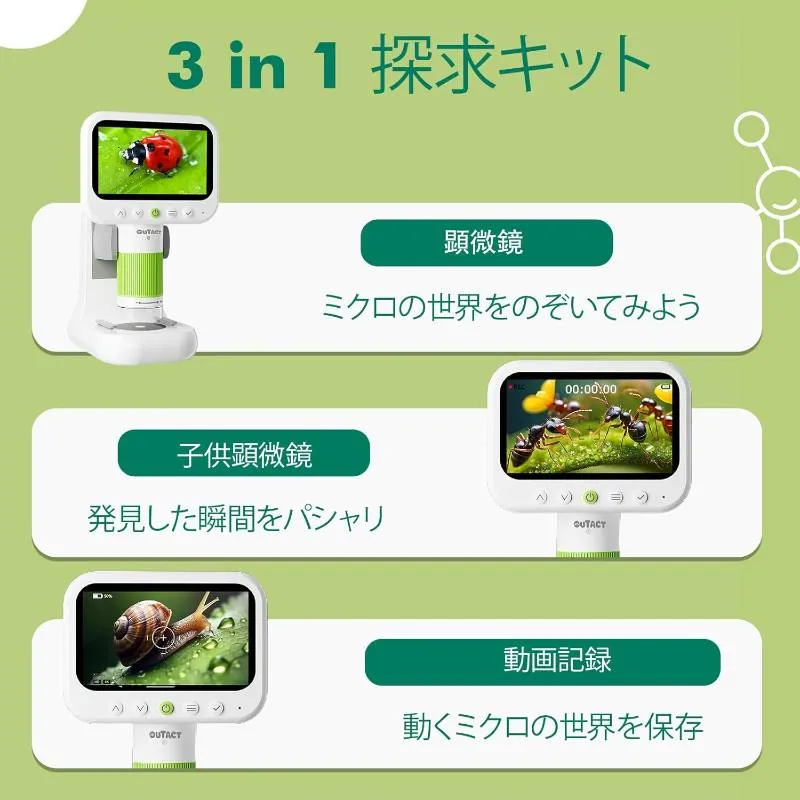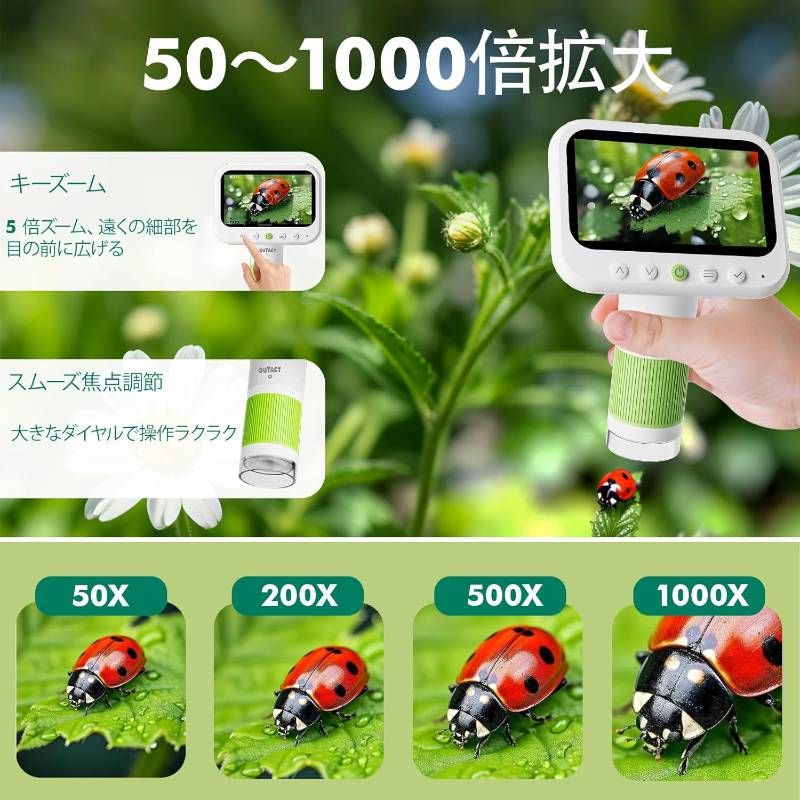 【おすすめポイント】 ✅ 驚異の1000倍拡大!植物の細胞や昆虫の細かな構造までリアルに再現します。 ✅ 撮影・録画機能搭載!観察した感動を写真や動画として8GBカードに保存可能です。 ✅ 長時間駆動の大容量バッテリー!USB-C充電対応で、屋外での探検にも最適です。 ✅ 充実の付属品セット!6枚のプレパラート付きで、すぐに本格的な観察が楽しめます。 ✅ パソコンシステム対応!大きな画面で共有したり、データの整理がスムーズに行えます。
