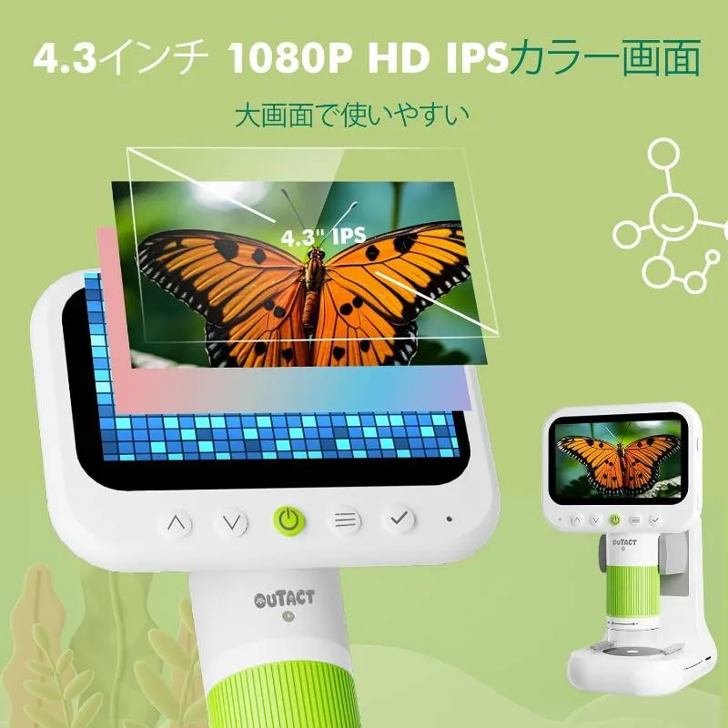 顕微鏡 小学生 デジタル顕微鏡 4.3インチ 1080p 50-1000倍 IPS液晶 PC接続 撮影 録画 USB-C充電 8GBメモリカード同梱 8個LEDライト 4段階調光 自由研究 生物観察 男の子 女の子 誕生日プレゼント 日本語説明書付