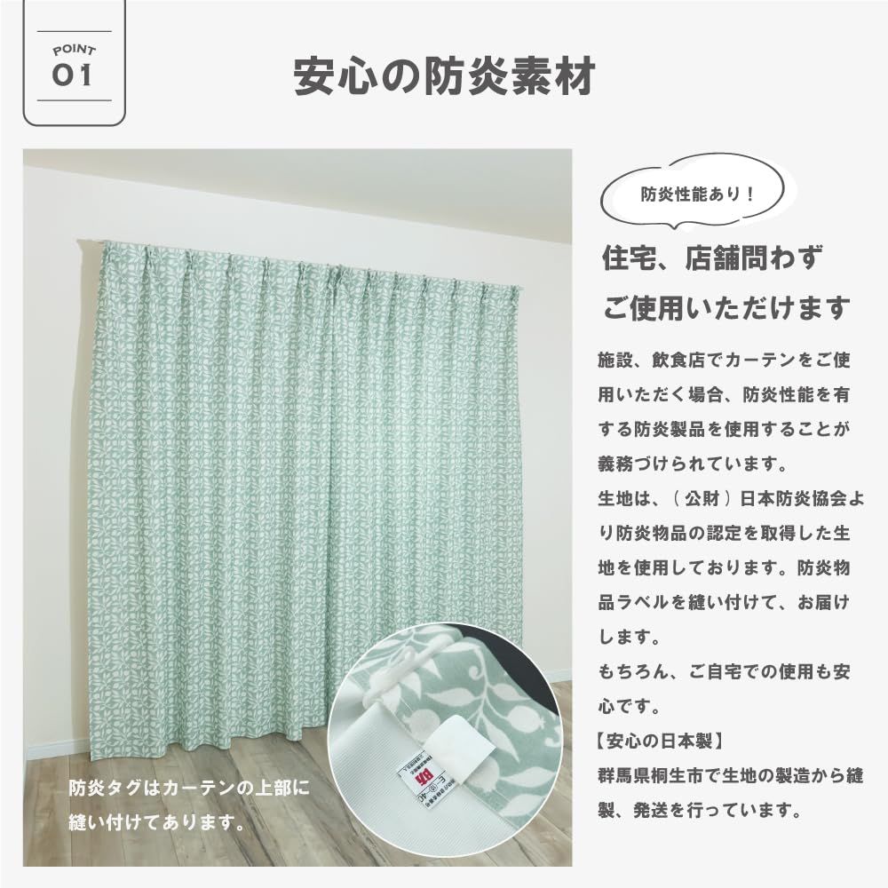 【仕様】1.5倍ヒダ 2つ山仕上げ 調節可能なアジャスターフック付き。 (Aフック) 共布タッセル2本付属。(200cm幅はタッセル1本付属)※130、150、200cm幅は、生地に継ぎ目が入ります。 3級遮光、防炎、断熱、保温、ウォッシャブルと多機能のカーテンです。群馬県桐生市で生地の製造から縫製、発送を行っております。 ウィリアム・モリスもしくはその友人、ウィリアム・ド・モーガンの作品であるタイルのデザインを受け継いだものです。モーガンは自らタイル製造企業の経営を始めるまで、モリスと共にステンドグラスのデザインにも従事していました。タイルに描かれたデザインをファブリック用に練り直したことで、より?み合った作品になりました。特殊な編み機で生地を製造しているので、サイドと裾は無縫製が可能になり、裾がだぶつかずに自然なドレープ感を生み出すことができました。 3級遮光、防炎、遮熱、保温はもちろん、ご家庭の洗濯機でお洗濯できる多機能なカーテンです。また、無縫製のサイドと裾はお洗濯してもほつれません。 生地の製造、染色加工、縫製と一貫した国内生産。安心安全なこだわりの製品です。 カーテンと同じ柄のタッセルと調節可能なアジャスターフックが付いています(洗濯の時はフックを外してください)。