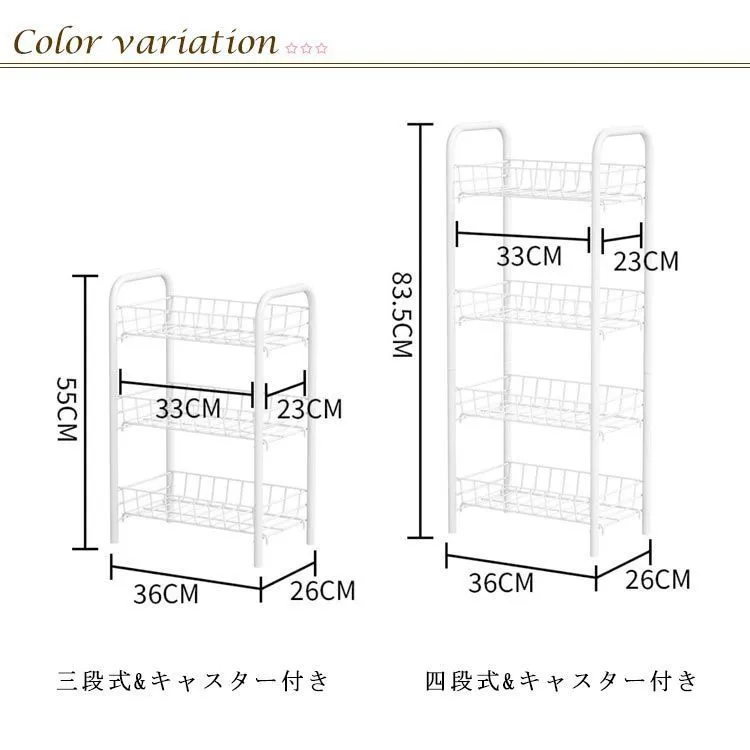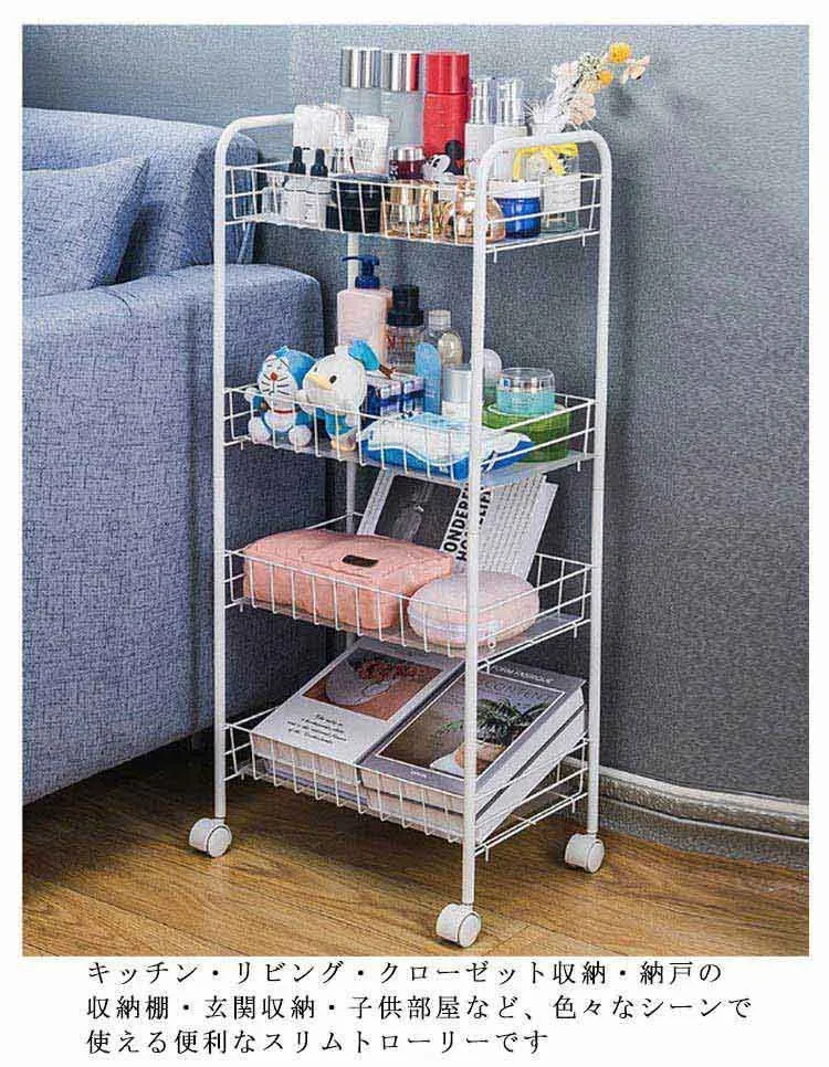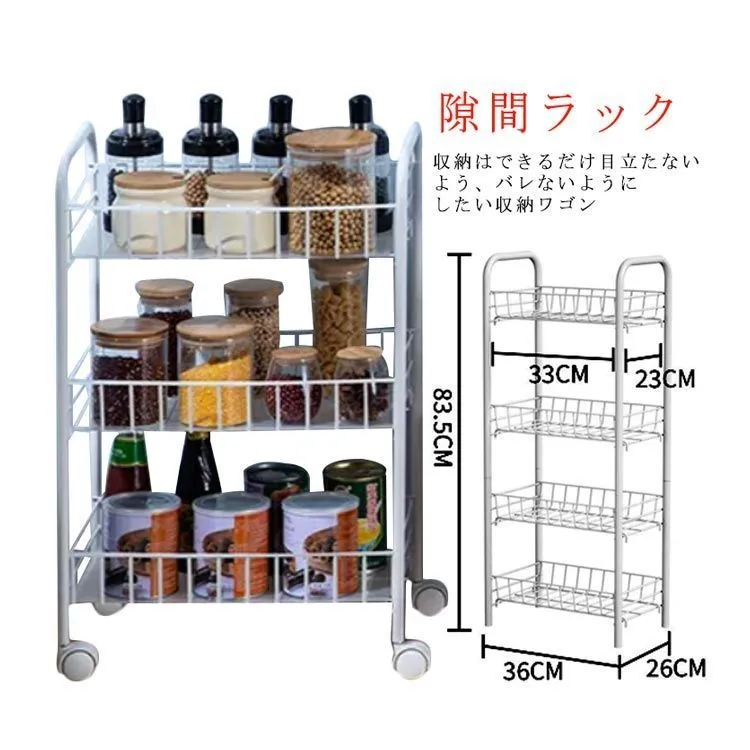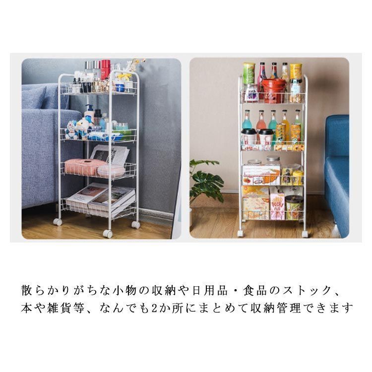 ■沖縄・離島は配送料が異なります。ご購入前にコメントをお願いいたします。 商品特徴 - 目立たず、バレない収納を実現するスリムデザイン - 最大4段の大容量で、キッチン以外の様々なシーンでも活躍 - キャスター付きで移動が楽。冷蔵庫横やデスク下などの隙間からも簡単に出し入れ可能 - 工具不要のはめ込み式。超簡単な組み立てで、届いてすぐ使用可能 - サランラップや調味料など、隙間を活用したスマートな収納が可能 - 散らかりがちな小物、日用品・食品ストック、本・雑貨など、あらゆるものを2か所にまとめて管理 - キッチン、リビング、クローゼット、納戸、玄関、子供部屋など、多様な場所で使用可能 - スタイリッシュでシンプルな見た目で、インテリアとしても優秀 仕様・サイズ