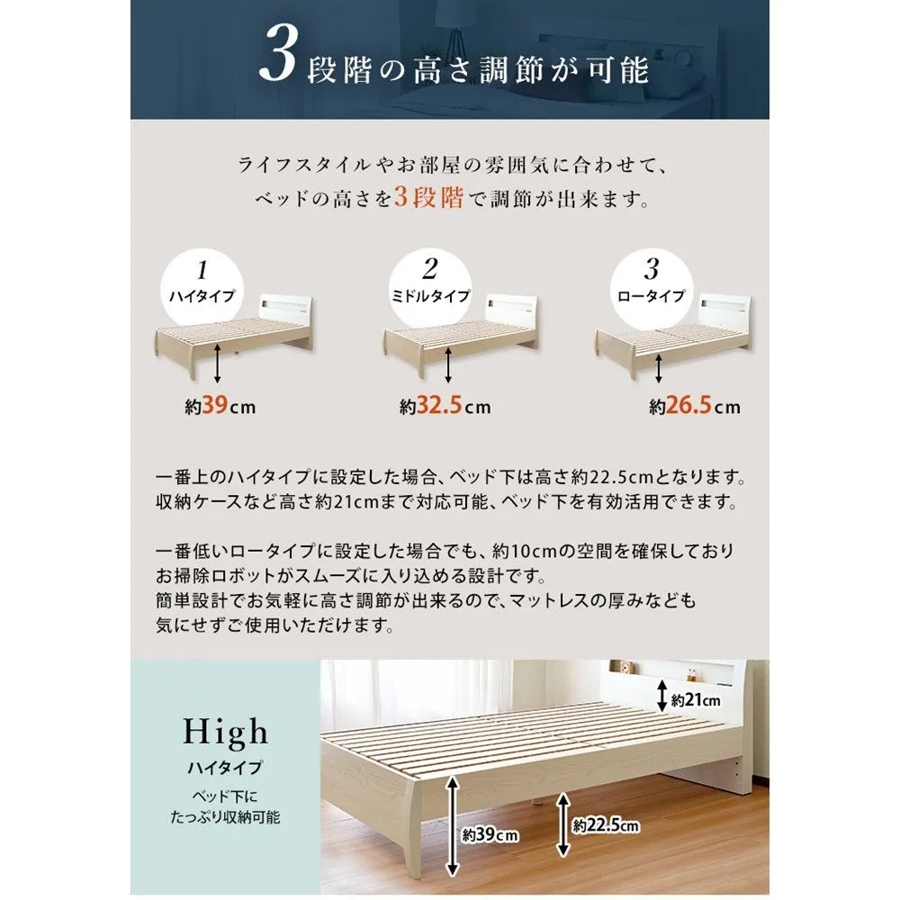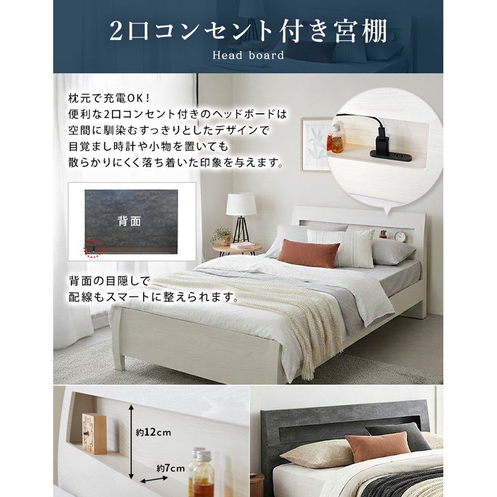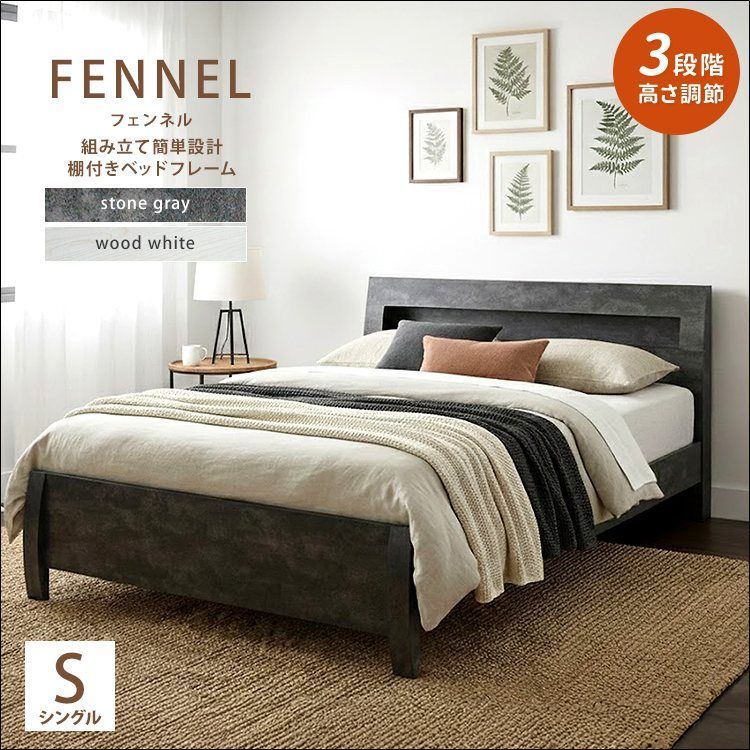 FENNEL【フェンネル】ベッドフレーム シングルサイズ jx44733 ベッド 棚付きベッド ホテルライク 組立簡単 3段階高さ調節 宮棚 2口コンセント付き すのこ ストーングレー ウッドホワイト 送料無料 【全2色】[8096]