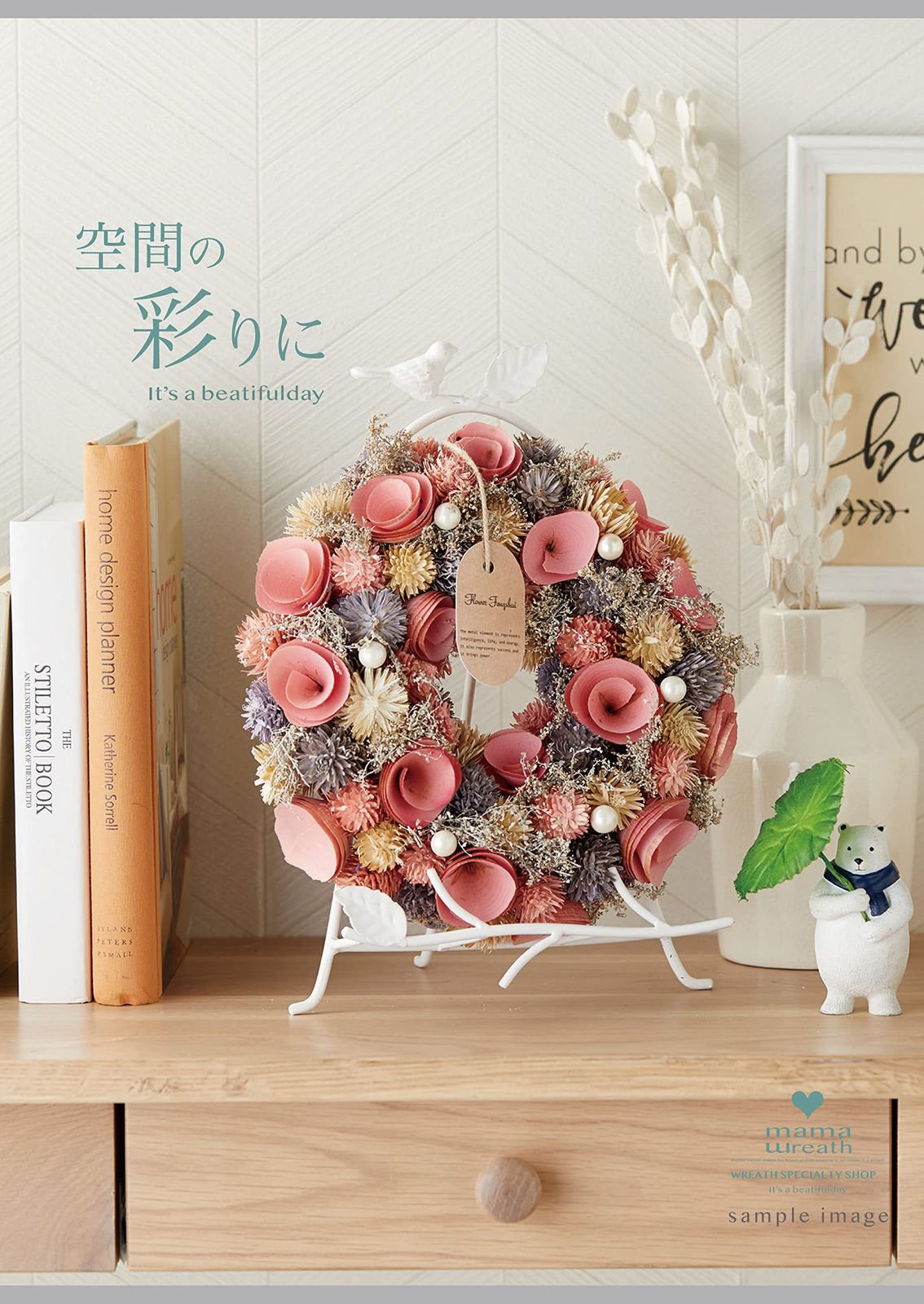 空間の彩りに - - - リースはお家やお部屋のアクセントとして彩りを加えてくれます。 スタンドを使うことによって飾れる場所も増え、下駄箱・テーブル・棚などにも立て掛けて飾れます。お部屋のテーマやコンセプト・インテリアに合わせて飾ったり、あえて調和させずに差し色として飾るのも良いかもしれません。 キレイや可愛いはプラスαの力を与えてくるもの、空間に彩りを加えてみて下さい。