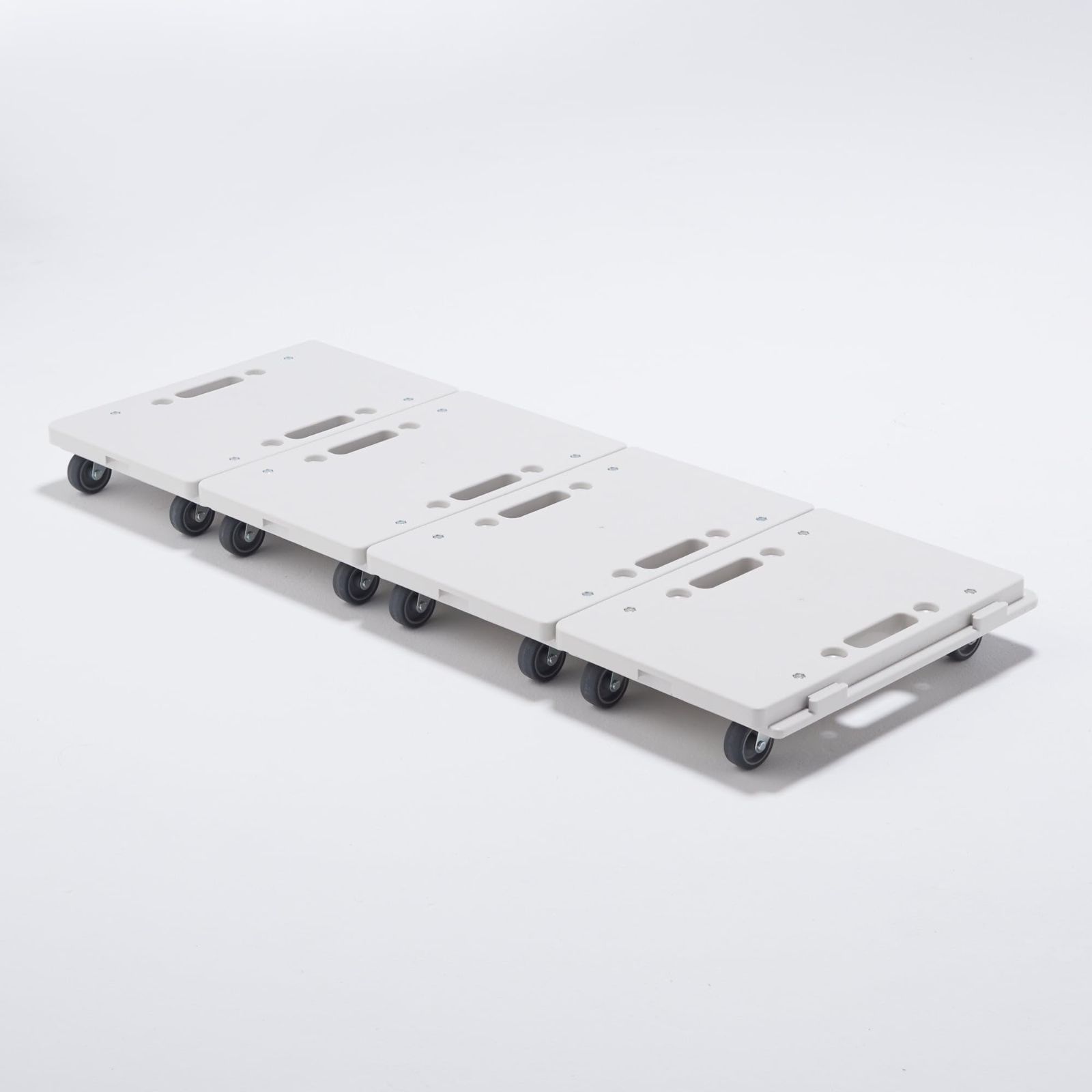 【おすすめポイント】 ・縦にも横にも連結できるので、載せるものの大きさに合わせて組み合わせができます。 ・耐荷重が80kgなので、お米や水など重量があるものを載せれます。 普段は押し入れの中などにストック品を載せてしまっておき、使用するときに簡単に出し入れができます。 ・床に傷がつきにくいキャスターを使用しています。 ※キャスター部分はクッション性のある材質の為、耐荷重以下の重量でも長時間動かさずに放置すると変形が起こる場合があります。 定期的に台車を動かしていただく事をおすすめしております。