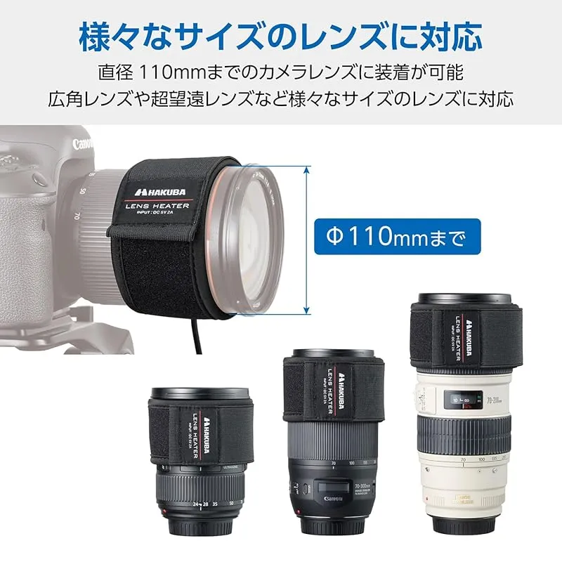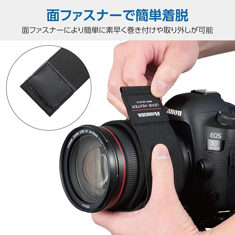 【商品概要】 レンズに巻き付けて温めることで、低温下での長時間の野外撮影や、急激な温度変化で発生する結露を抑え、レンズの曇りを防ぐUSB給電式のレンズヒーターです。 星空や夜景など、特に冬の夜間や早朝の長時間撮影で発生しやすい結露によるレンズの曇りを防ぎ、クリアな撮影を可能にします。 面ファスナーで簡単に素早く巻き付け、取り外しができます。ズームリングやピントリングの操作に影響を与えにくい約55mmのスリムな幅です。 直径110mmまでのカメラレンズに装着が可能です。広角レンズや超望遠レンズなど、様々なサイズのレンズに対応します。撮影中はもちろん、オフィスやご家庭でペットボトルやカップのウォーマーとしても便利に使用できます。