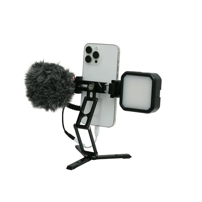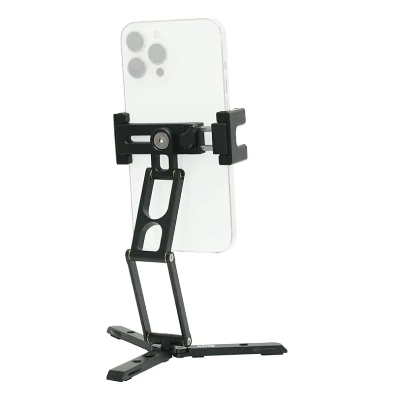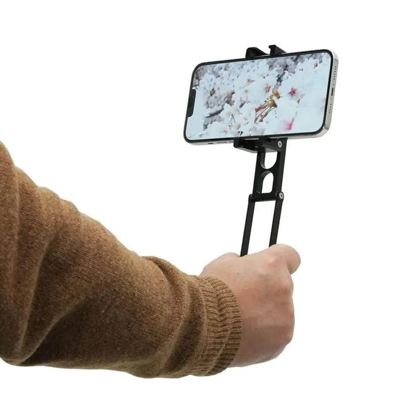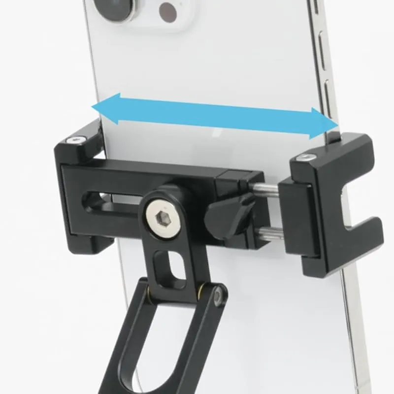 【商品概要】 脚部を展開して卓上で使用、脚部を閉じた状態で掴み簡易グリップとしてのしようなど、多用途にお使いいただけます。アルカスイス対応の三脚に直接取り付け可能です。 スマートフォンを挟んで使用するグリップ式 アクセサリーポート:3/8インチネジ穴×1、1/4インチネジ穴×3、アクセサリーシュー×2 本体サイズ:約W38×D28×H80mm(折りたたんだ状態の時)・重量:約150g 材質:アルミ合金・対応機種:約7.3cm~10.3cm幅
