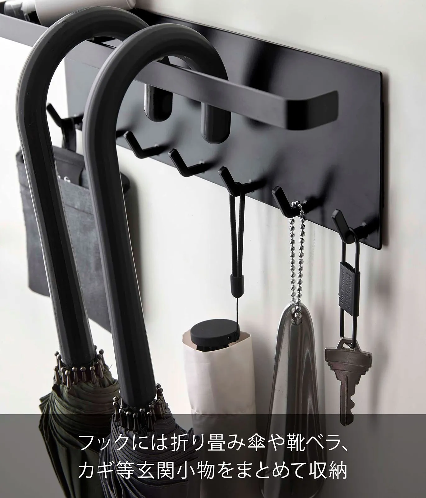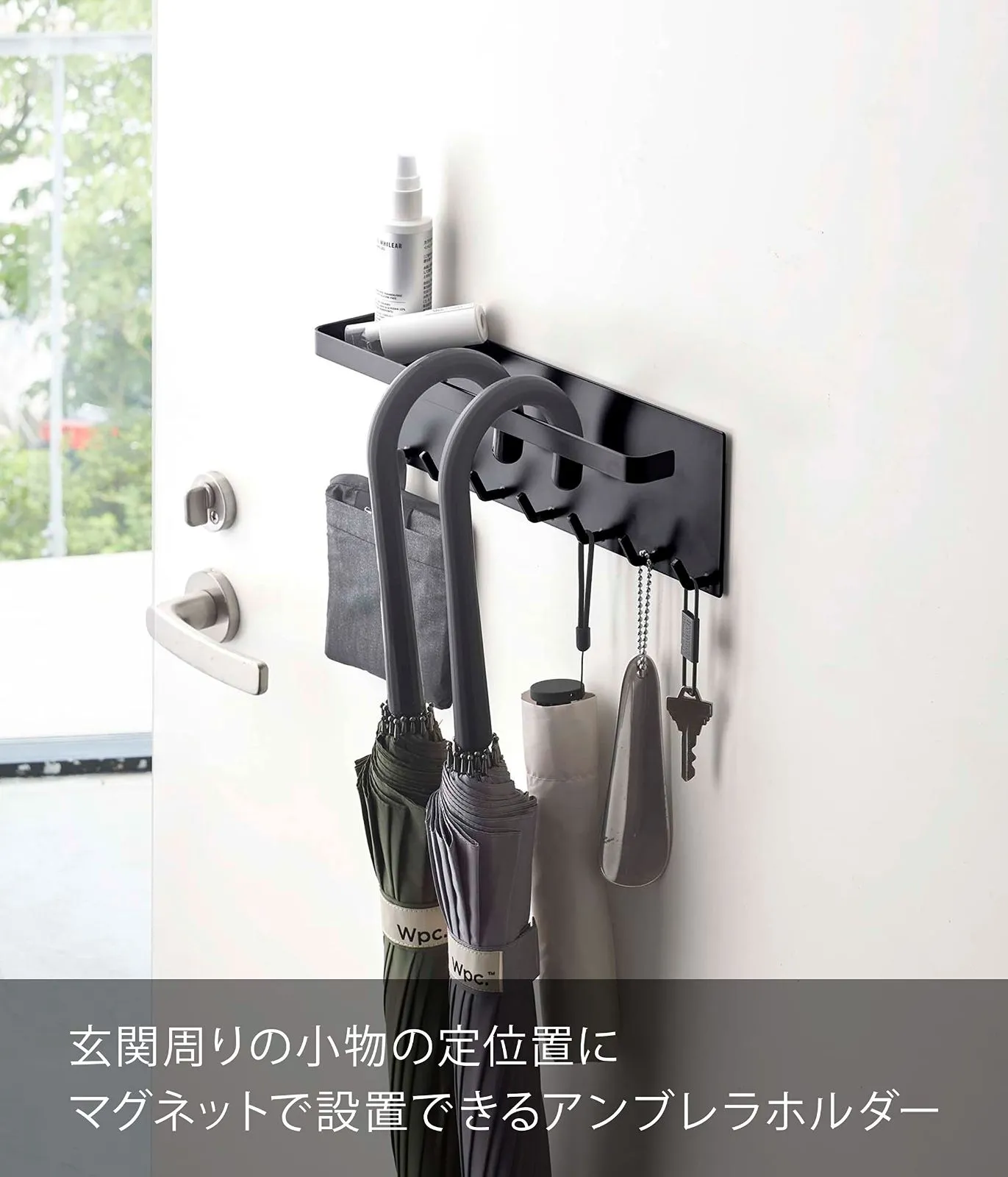 玄関扉に貼り付けて長傘をコンパクトに収納。
