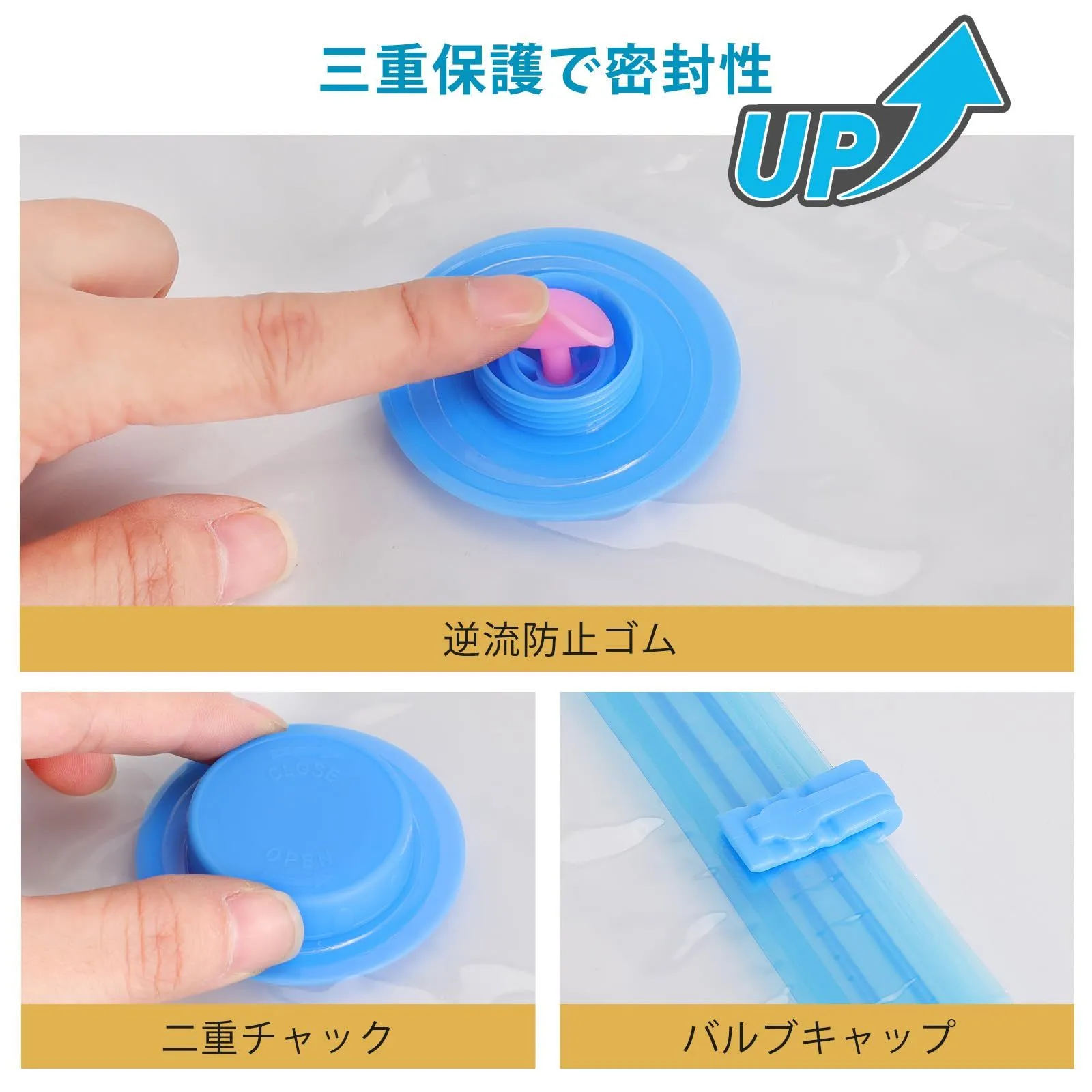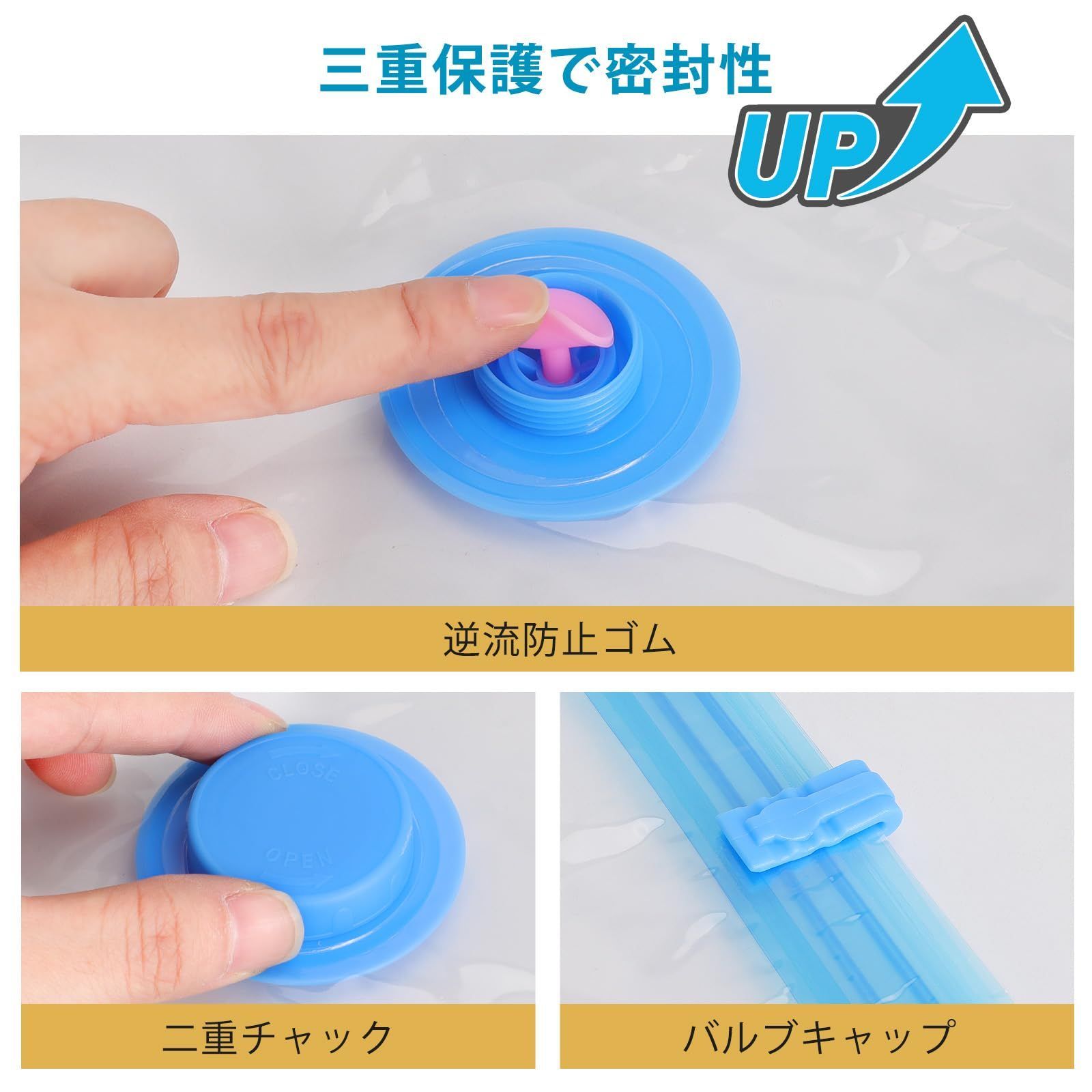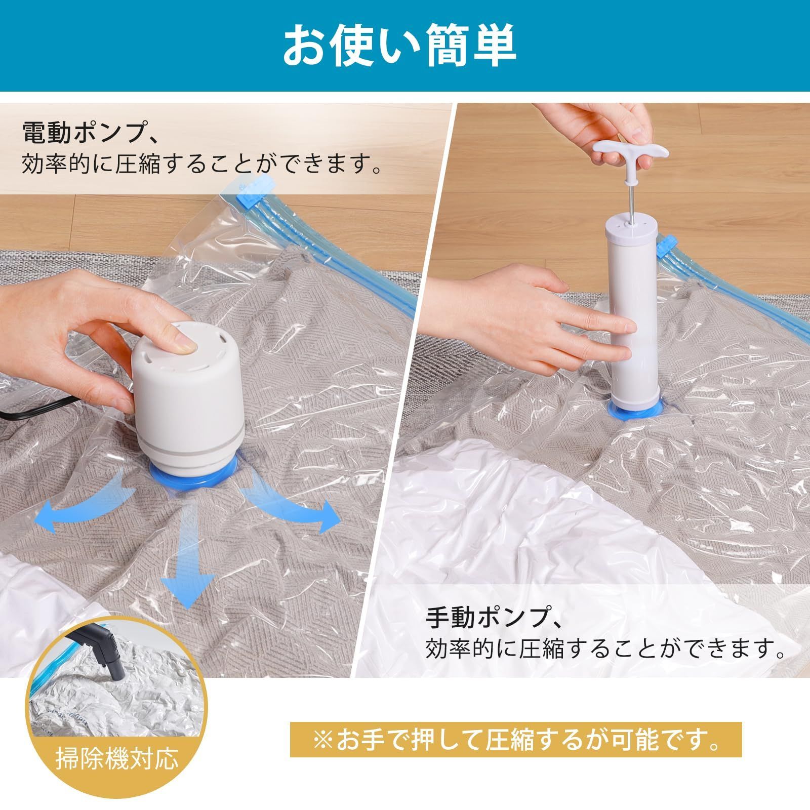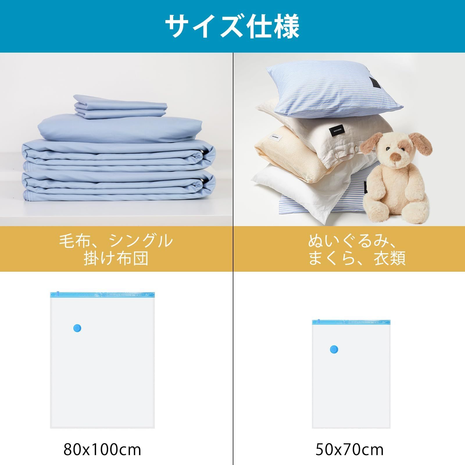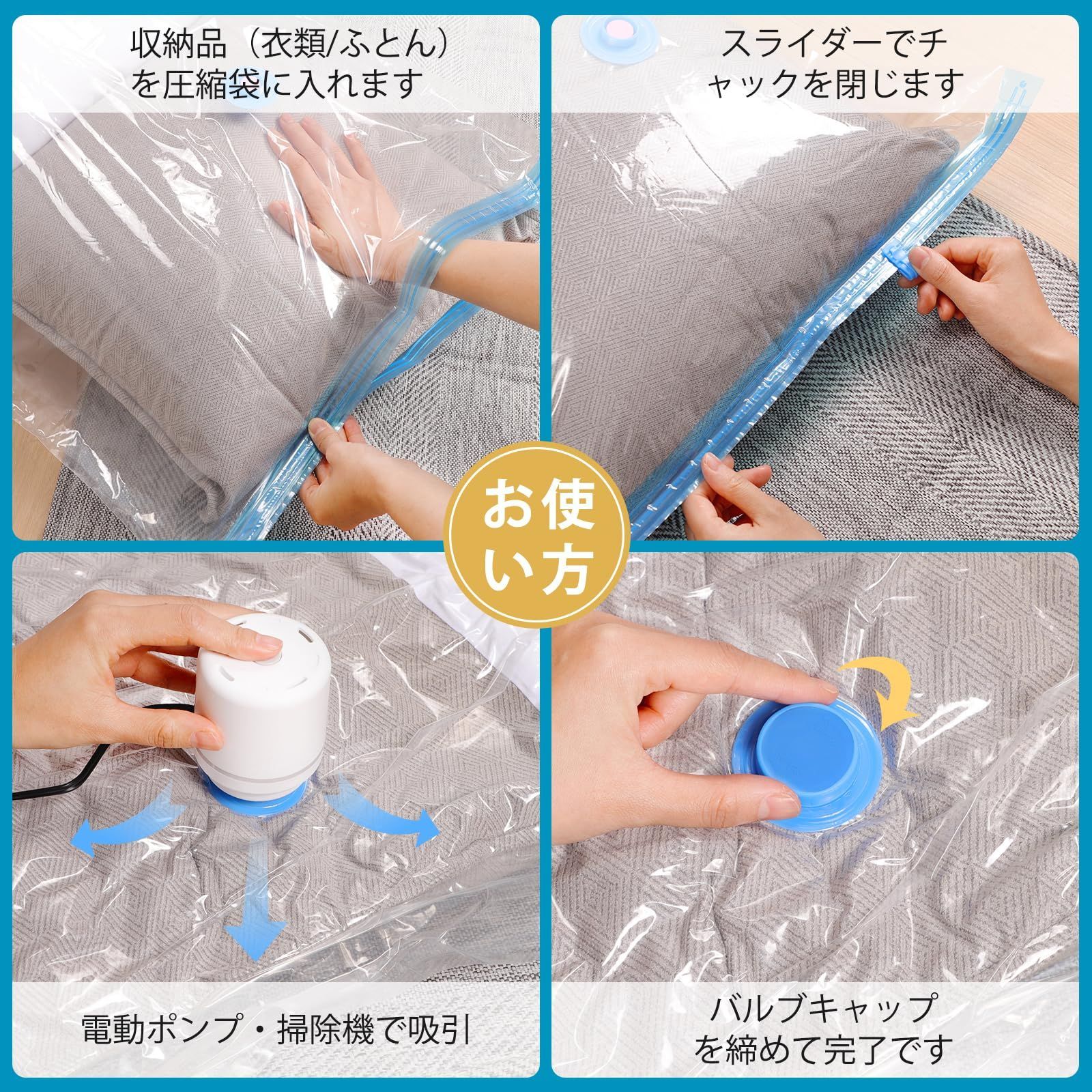 【圧縮袋セット8枚入】あっしゅく袋 衣類圧縮袋 真空パック 収納袋 小物収納 省スペース 掃除機対応 防塵防湿 防虫防カビ 家庭用 引越し 出張 旅行用 80*100cm(4枚)+50*70cm(4枚) サイズ: 8枚セット 収納スペースを有効に活用:サイズ:80*100cm四枚入り+50*70cm四枚入り。収納の目安:セーター・フリース・パジャマなど合計12枚、バスタオル*4、ぬいぐるみ*3(80*100cm一枚あたり)。まくら*1(長さ70cm以内)、Tシャツ*8、トレーナー・パジャマ:各3枚、バスタオル*2(80*100cm一枚あたり)。衣類もたくさんまとめて収納して、空いたスペースは他の物を入れたり、空間を最大限に活用できます。季節変わり目、コートやセーターなど厚みのあるものが多いので、使わない季節は圧縮して保管出来たら助かります。 製品仕様:高品質のPAとPE材質で作られ、丈夫で長持ちます。優れた防水性と密封性、柔らかで破れにくく、衣類を湿気やほこりからお守り、長時間無臭に保ちます。透明で、中に入れた収納物も良く見えますので、探す手間を省くこともできます。三重保護で密封性アップ、逆流防止ゴム、二重チャックとバルブキャップ、空気が漏れません。バルブ口径2.5㎝。 多くの目的に合う:旅行や出張時に、数日分の衣類をまとめて、スーツケースやバッグに、省スペースで入れられます。衣替えや引っ越しなど、複数の衣類を収納できるうえ、厚手のコートなどもコンパクトに収納できます。仕分けや荷解きの手間を軽減できます。クローゼットにまとめて収納、複数の衣類をまとめて圧縮し、クローゼット内をすっきりできます。 お使い方:収納品(衣類/ふとん)を圧縮袋に入れます。スライダーでチャックを閉じます。 電動・手動ポンプで吸引(掃除機/電動バルブ可)。バルブキャップを締めて完了です。ご注意:保存期間は約6ヵ月です。6ヵ月を過ぎても圧縮状態に異常がなければ、そのまま保存できます。但しその場合は回復率が多少悪くなります。収納物のためには、6ヵ月に1度圧縮袋から出し天日干しをして再度圧縮し直してください。 サポートについて:TIXPOLの商品は全て2年間の期間が付きます。商品の品質には自信を持っていますが、万が一商品不具合である場合、交換または返品返金に対応させていただきます。ご利用中に何かご問題がございましたら、いつでもご気軽にお問い合わせください。 ブランド TIXPOL 色 青色 商品の寸法 130長さ x 100幅 x 0.1高さ cm 留め具タイプ ファスナー サイズ 8枚セット 最後までご確認頂き誠にありがとうございました。 上記をご確認頂き、ご購入いただけましたら幸いです。 何かご不明な点がございましたらお気軽にメッセージからお問い合わせ下さい。