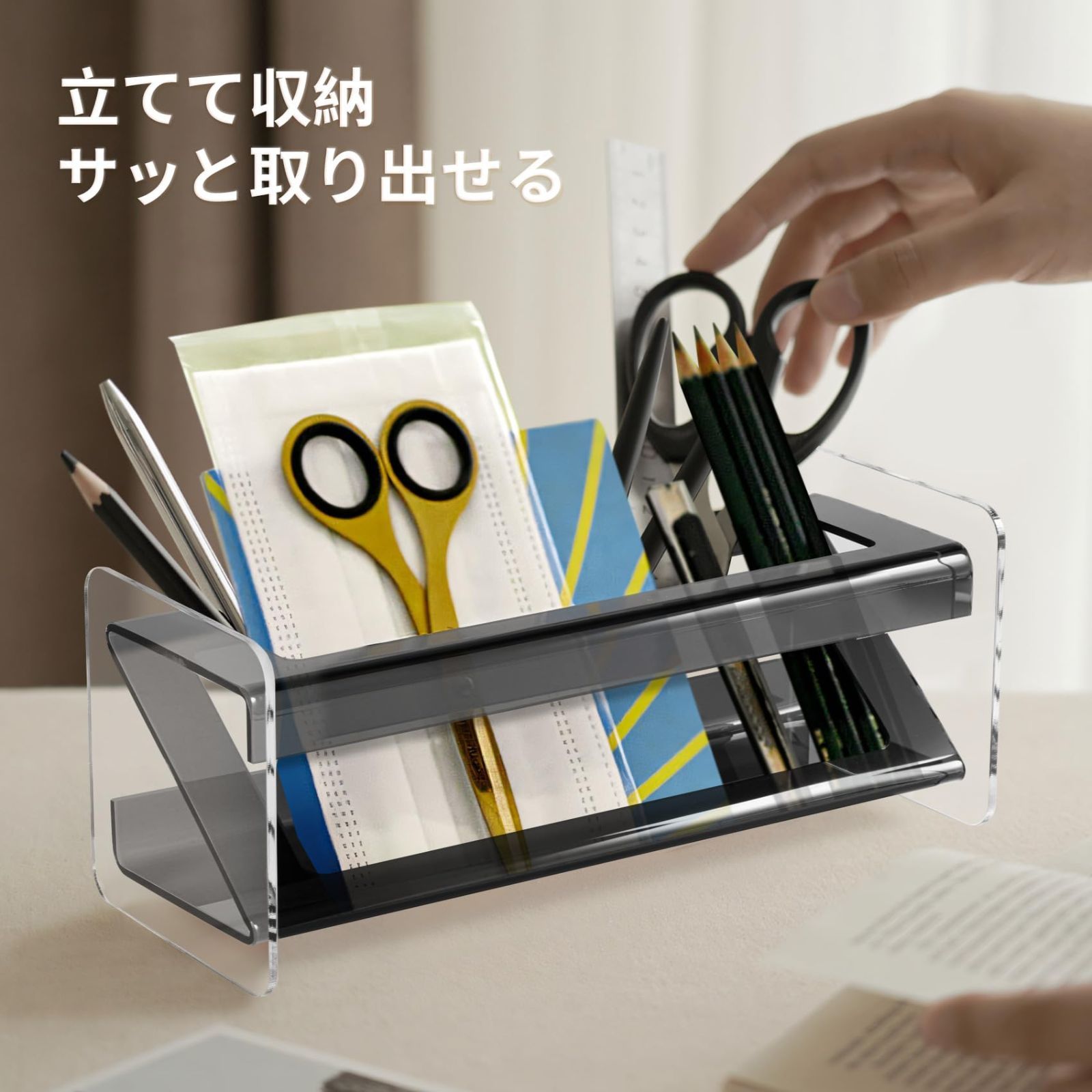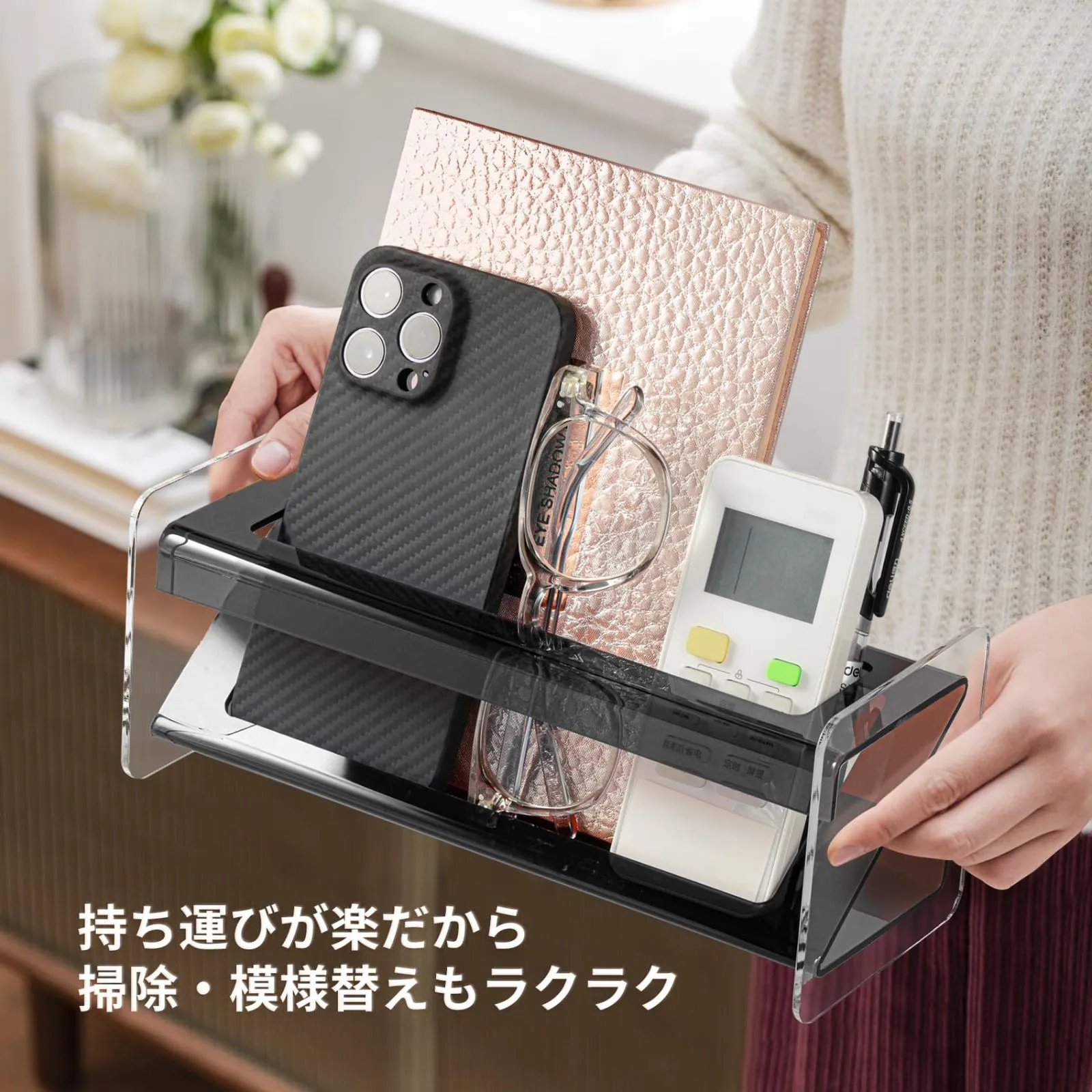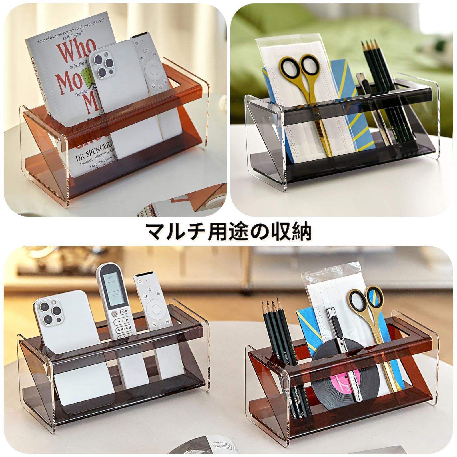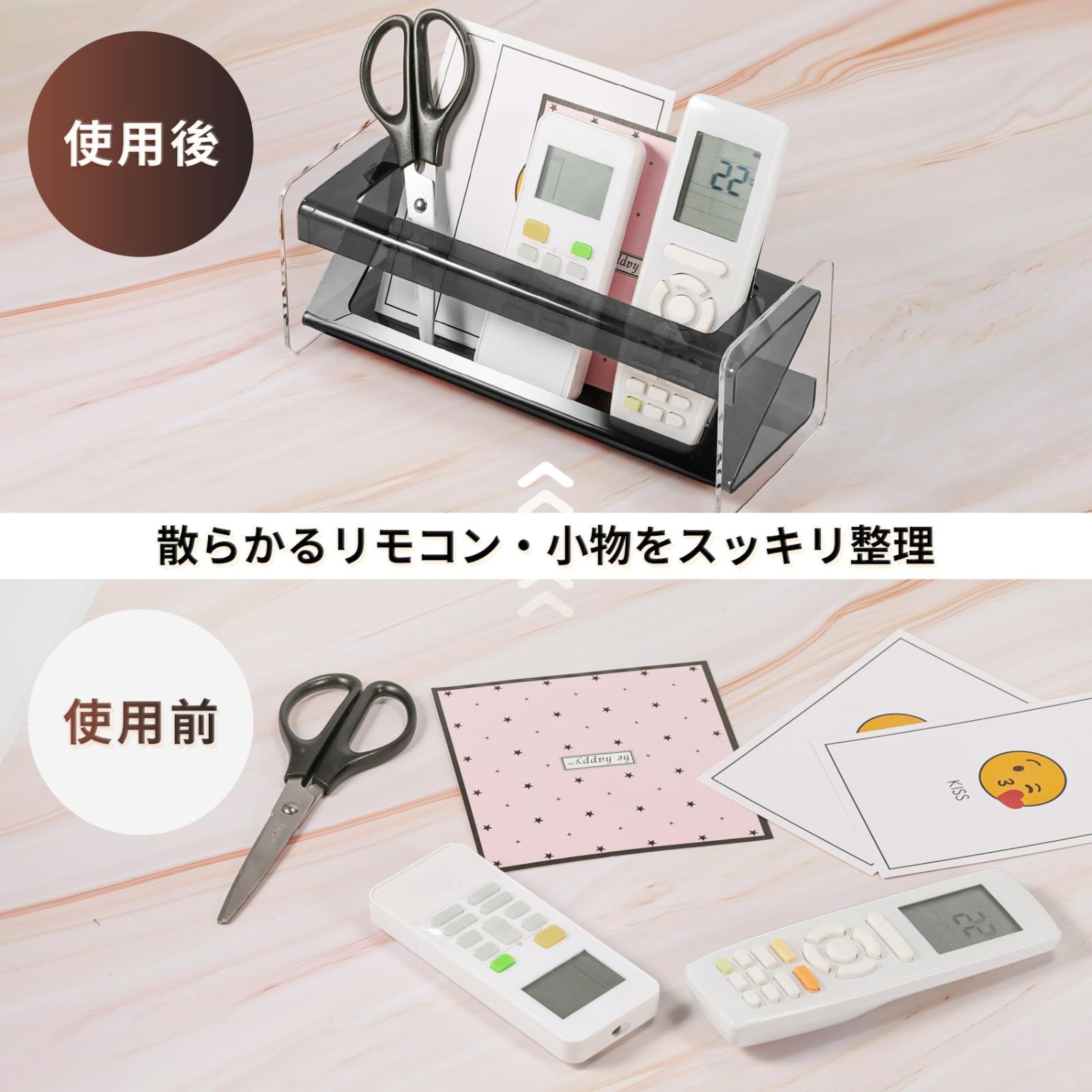 見せる収納:シンプルで開放感のあるデザインが特徴のリモコンケースです。机の上を美しく整理整頓できるだけでなく、高い透明性により収納物が一目でわかります。探す手間を省き、リモコンや小物をすぐに見つけて取り出せます