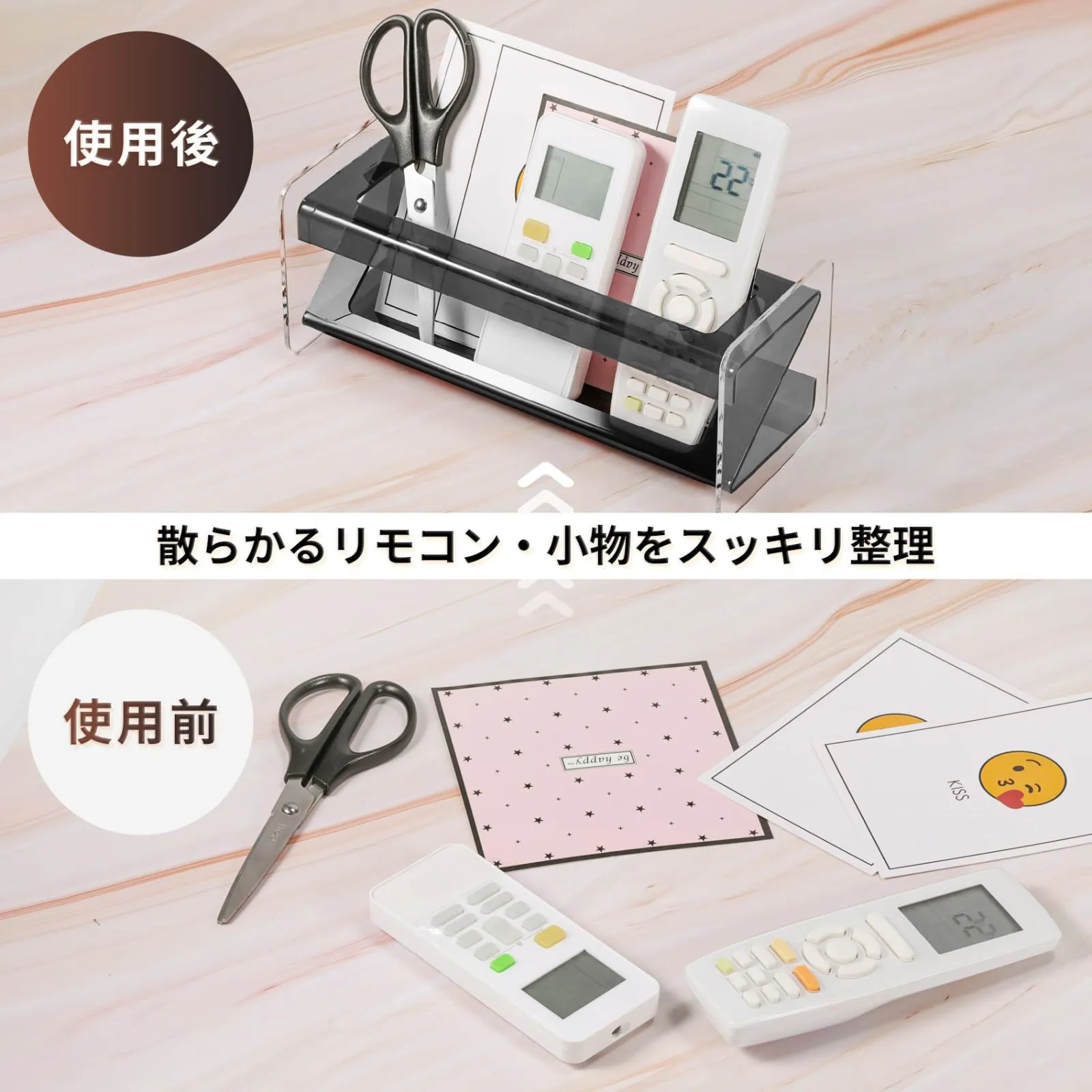 すっきり整理:散らかりがちなリモコンや小物を簡単に整理整頓できる卓上リモコンホルダーです。リモコンの紛失を防ぎながら、きれいに収まり、必要なときにサッと取り出せる便利さが魅力です