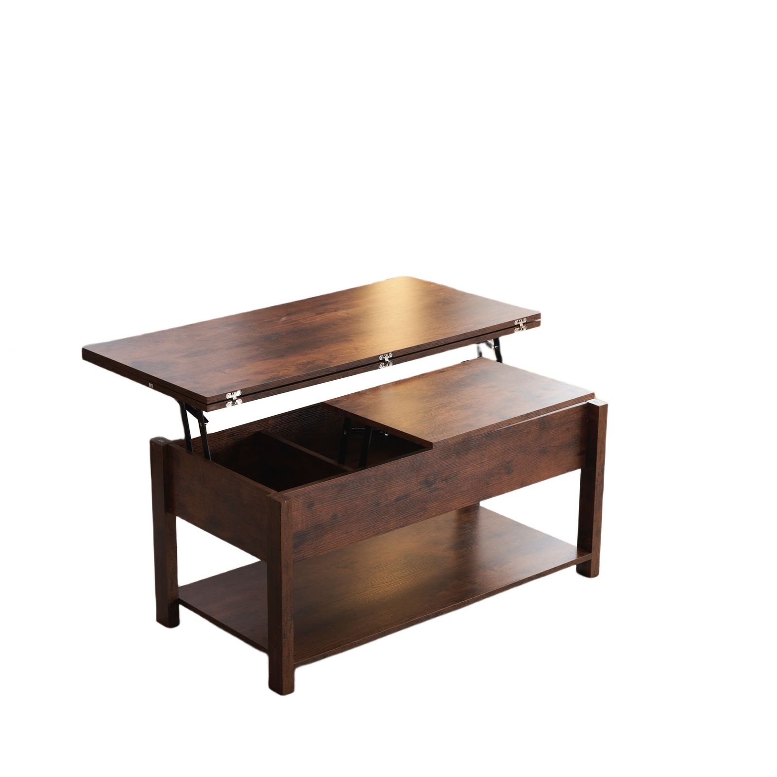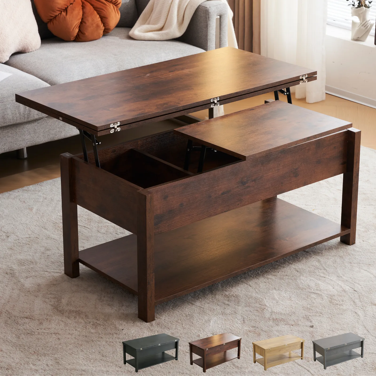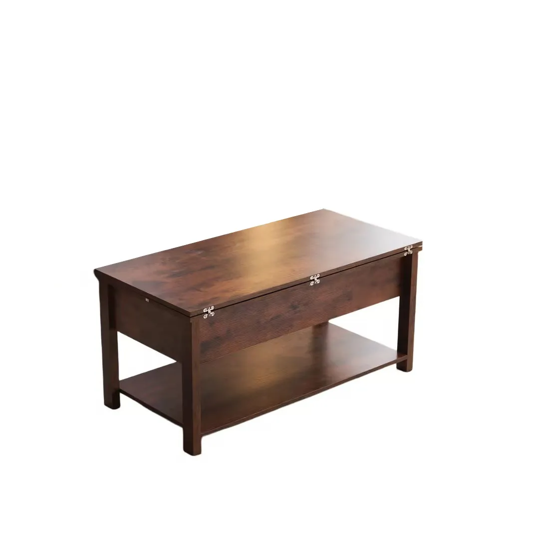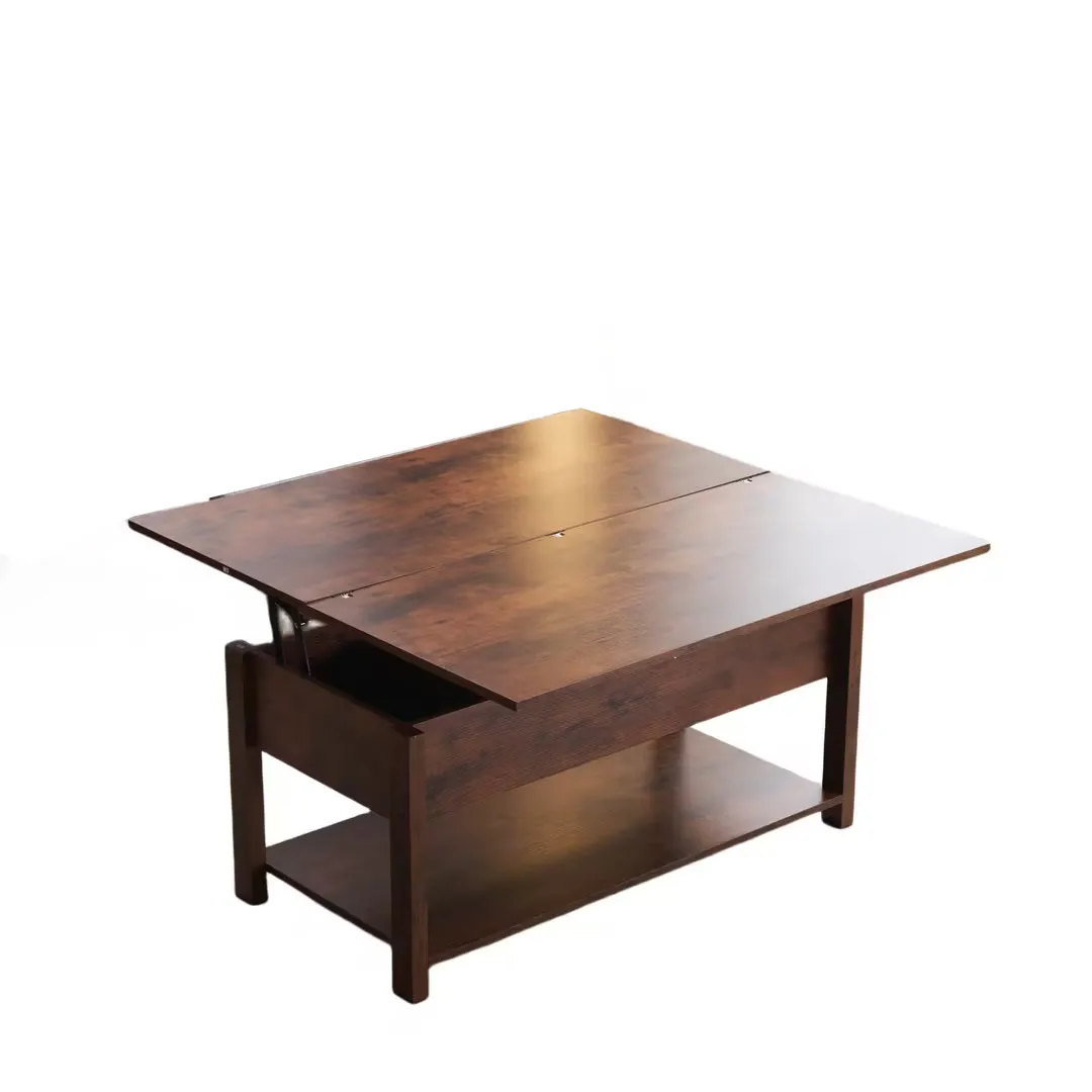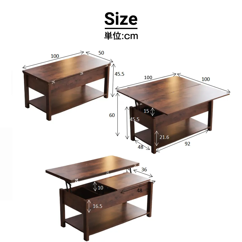 【3WAYモード調節と収納可能】 コーヒーテーブルは、3WAYモード調節機能により、天板が前後に分かれて昇降機能とディスプレイシェルフの組み合わせを特徴とします。天板の高さを調節できるガス圧昇降式。女性でもスムーズにお好みの高さに変更できるペダル式で、約45~60cmの間で無段階調節が可能です。天板を広げて100 × 100cmの大きなスペースにすることができ、3 ~ 4人で利用可能です。コンパクトで使いやすいサイズ感のテーブル。2人暮らしや、小さいお子様がいるご家庭にもオススメです