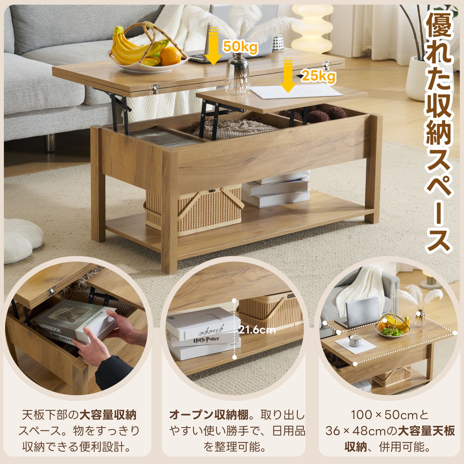 【3WAYモード調節と収納可能】 コーヒーテーブルは、3WAYモード調節機能により、天板が前後に分かれて昇降機能とディスプレイシェルフの組み合わせを特徴とします。天板の高さを調節できるガス圧昇降式。女性でもスムーズにお好みの高さに変更できるペダル式で、約45~60cmの間で無段階調節が可能です。天板を広げて100 × 100cmの大きなスペースにすることができ、3 ~ 4人で利用可能です。コンパクトで使いやすいサイズ感のテーブル。2人暮らしや、小さいお子様がいるご家庭にもオススメです