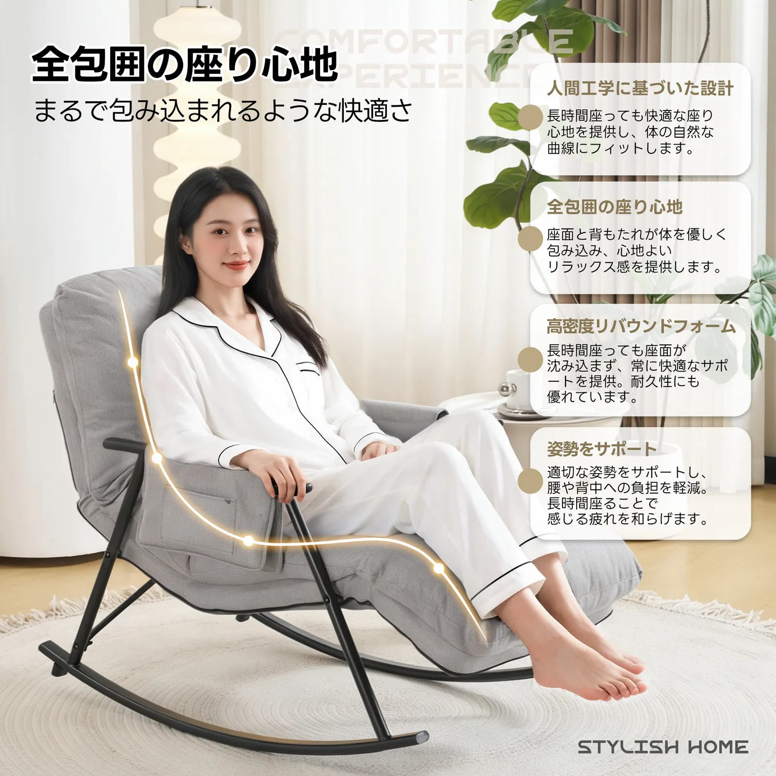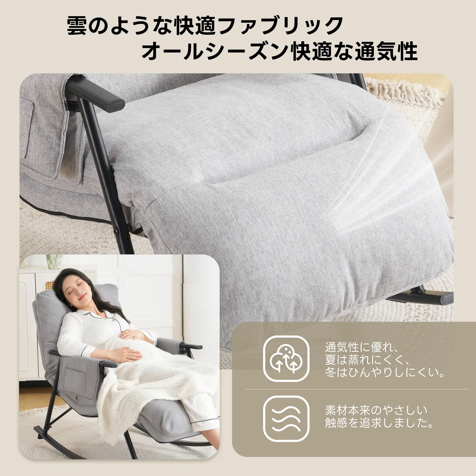 【体感で伝わる快適さ(使用感)】柔らかな布張り:肌触りが良く通気性に優れた布素材を使用。秋・冬は冷たくなく、春・夏はべたつかない、四季を通じて快適な座り心地。人体工学に基づいたカーブ:背もたれと座面の詰め物の厚みが適度で、腰や背中をしっかりサポート。ゆれる弧度も緩やかで、めまいを起こすことなくリラックスできる。