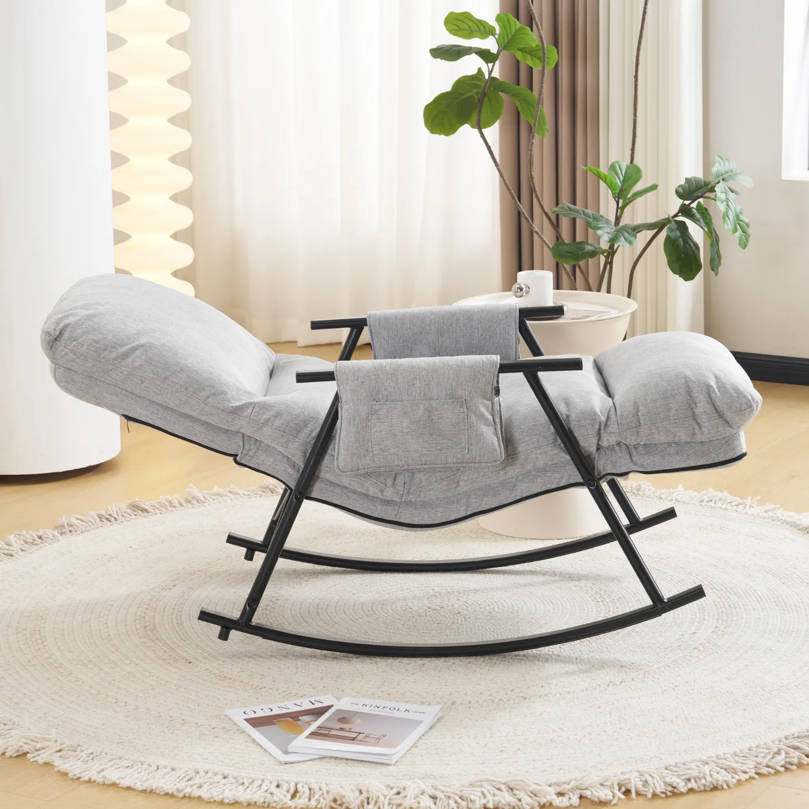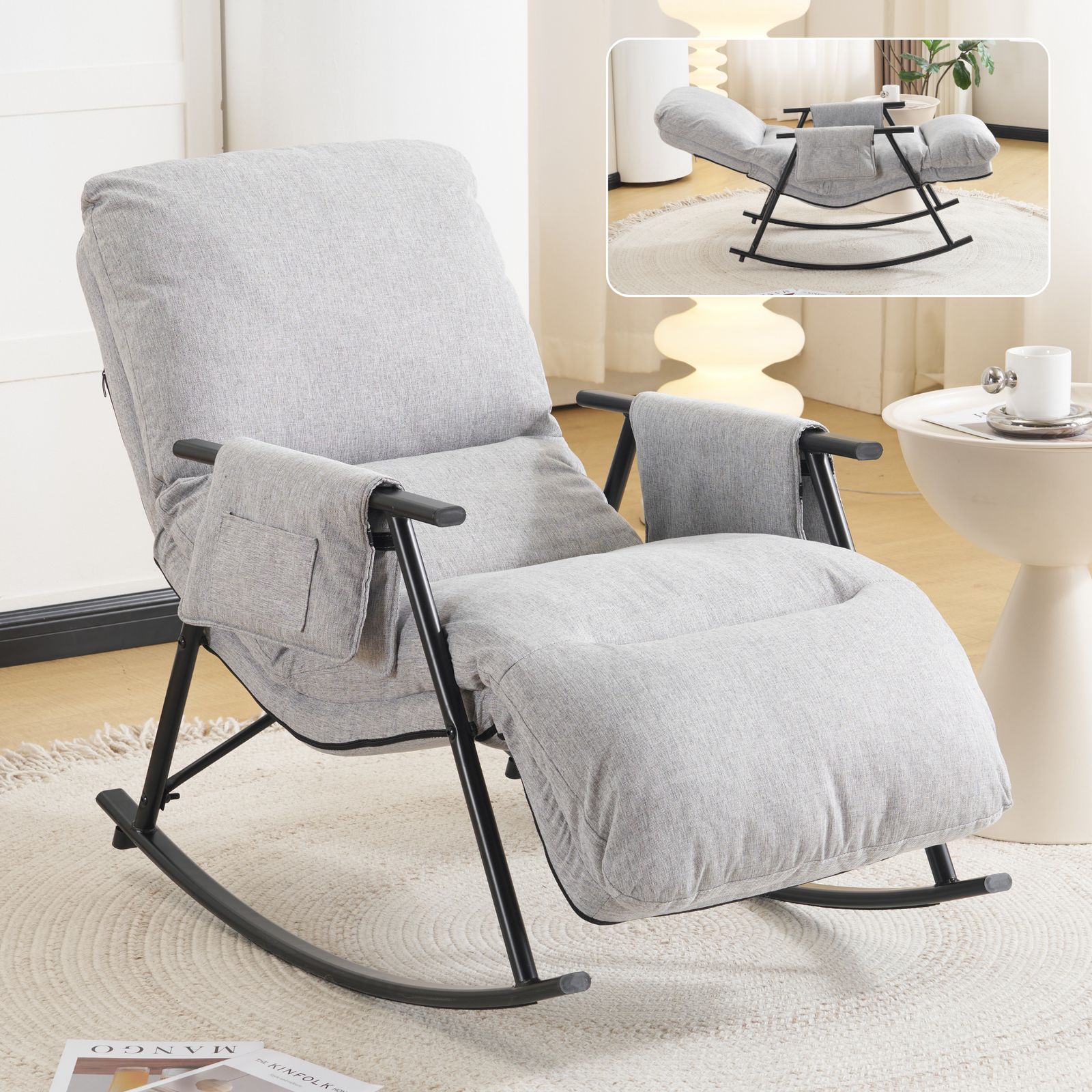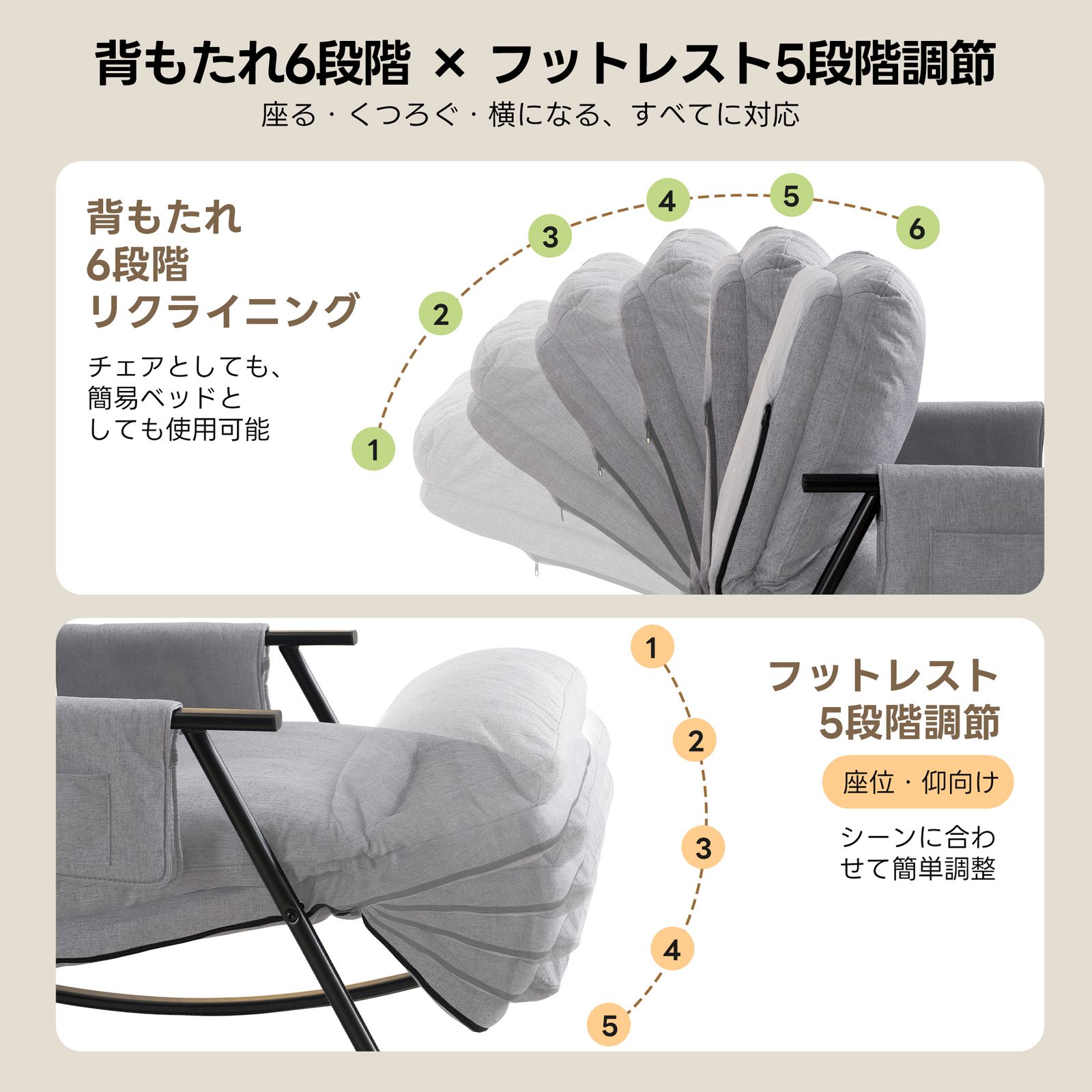【多シーンでの快適さ(機能性)】角度調整可能:ロッキングチェア / リクライニングチェアの多段階切り替えに対応,「ゆっくりゆれる」「半横になってリラックス」「ドラマ観賞用の座り」など、さまざまな自宅でのシーンに対応可能。フットレスト一体型デザイン:別途フットレストを用意する必要がなく、座ったら自然に足を置ける。足元がしっかりサポートされ、長時間座っても疲れにくい。