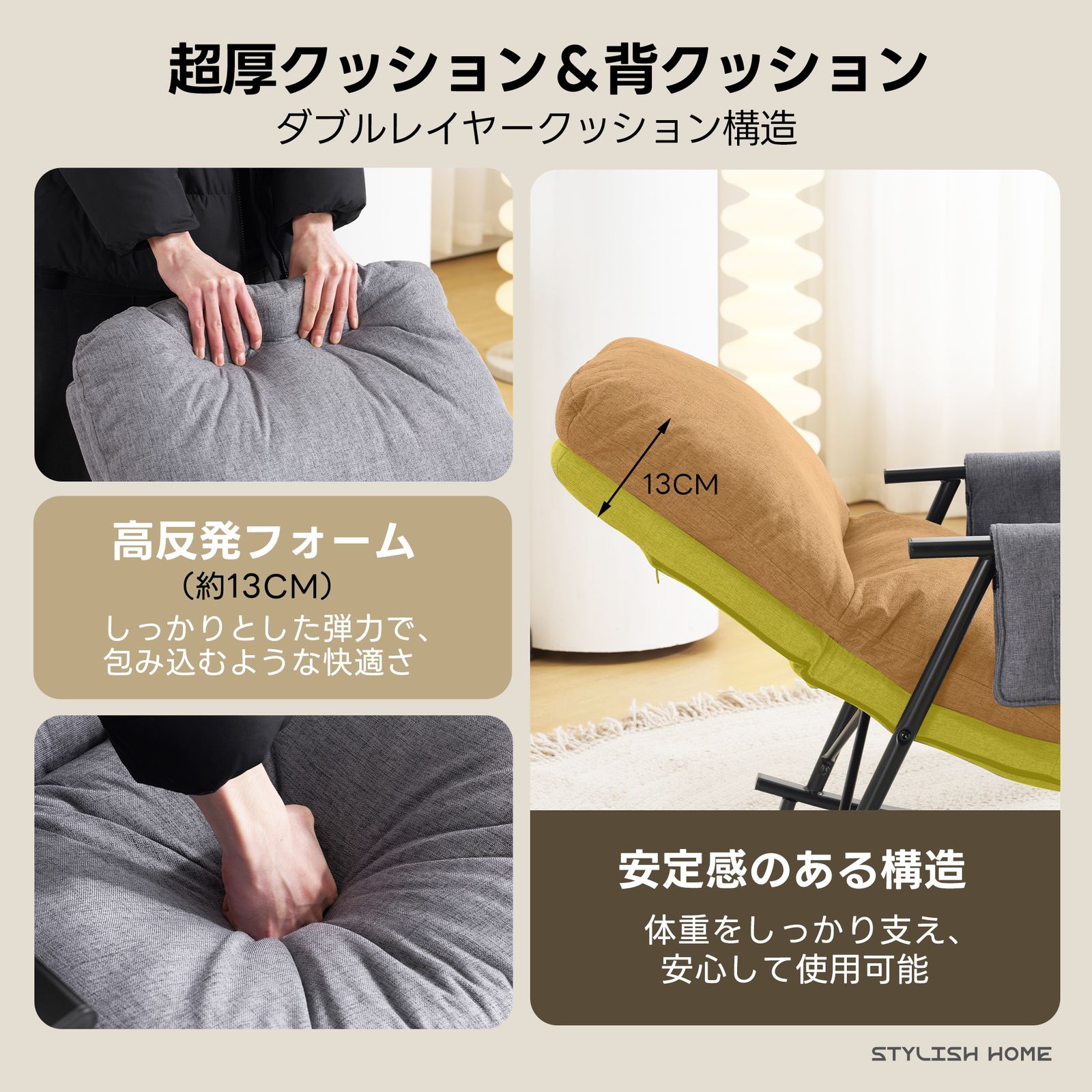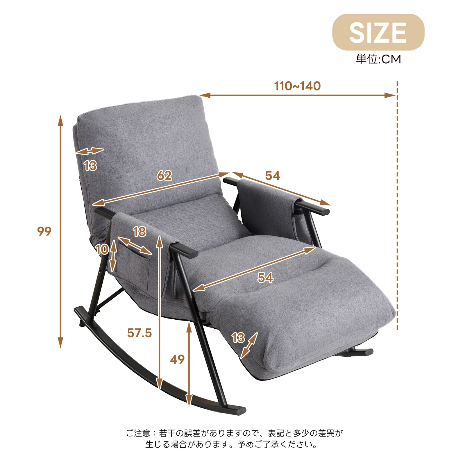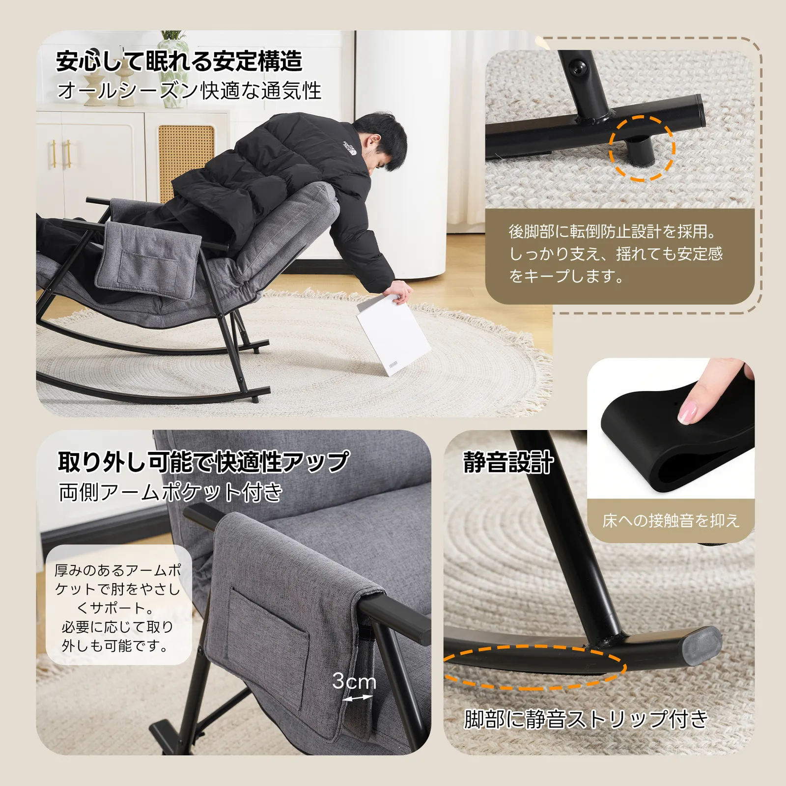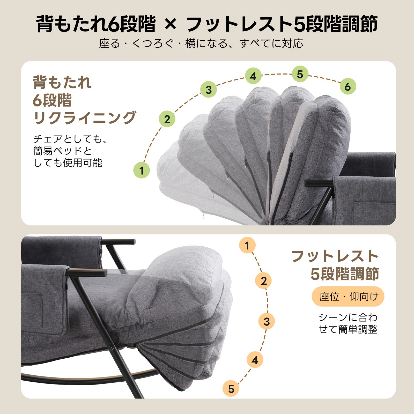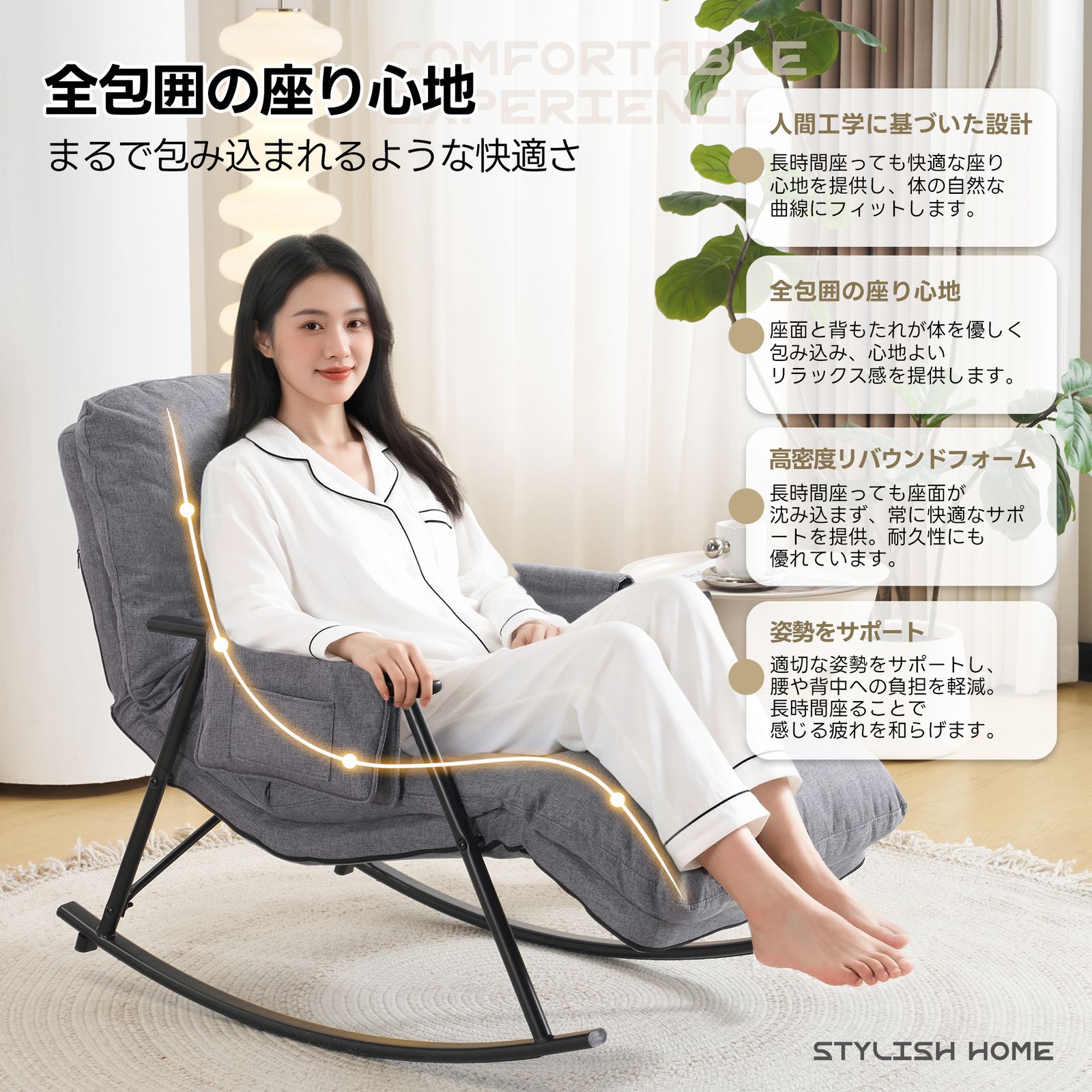 【多シーンでの快適さ(機能性)】角度調整可能:ロッキングチェア / リクライニングチェアの多段階切り替えに対応,「ゆっくりゆれる」「半横になってリラックス」「ドラマ観賞用の座り」など、さまざまな自宅でのシーンに対応可能。フットレスト一体型デザイン:別途フットレストを用意する必要がなく、座ったら自然に足を置ける。足元がしっかりサポートされ、長時間座っても疲れにくい。
