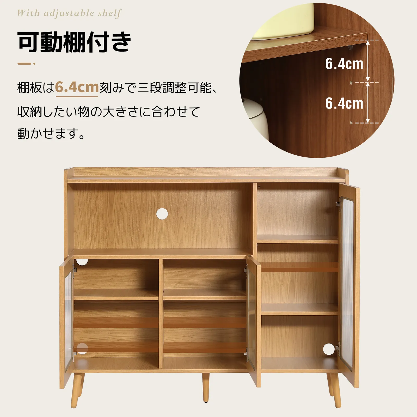 【可動棚付き】棚板は三段調整可能、収納したい物の大きさに合わせて動かせます。