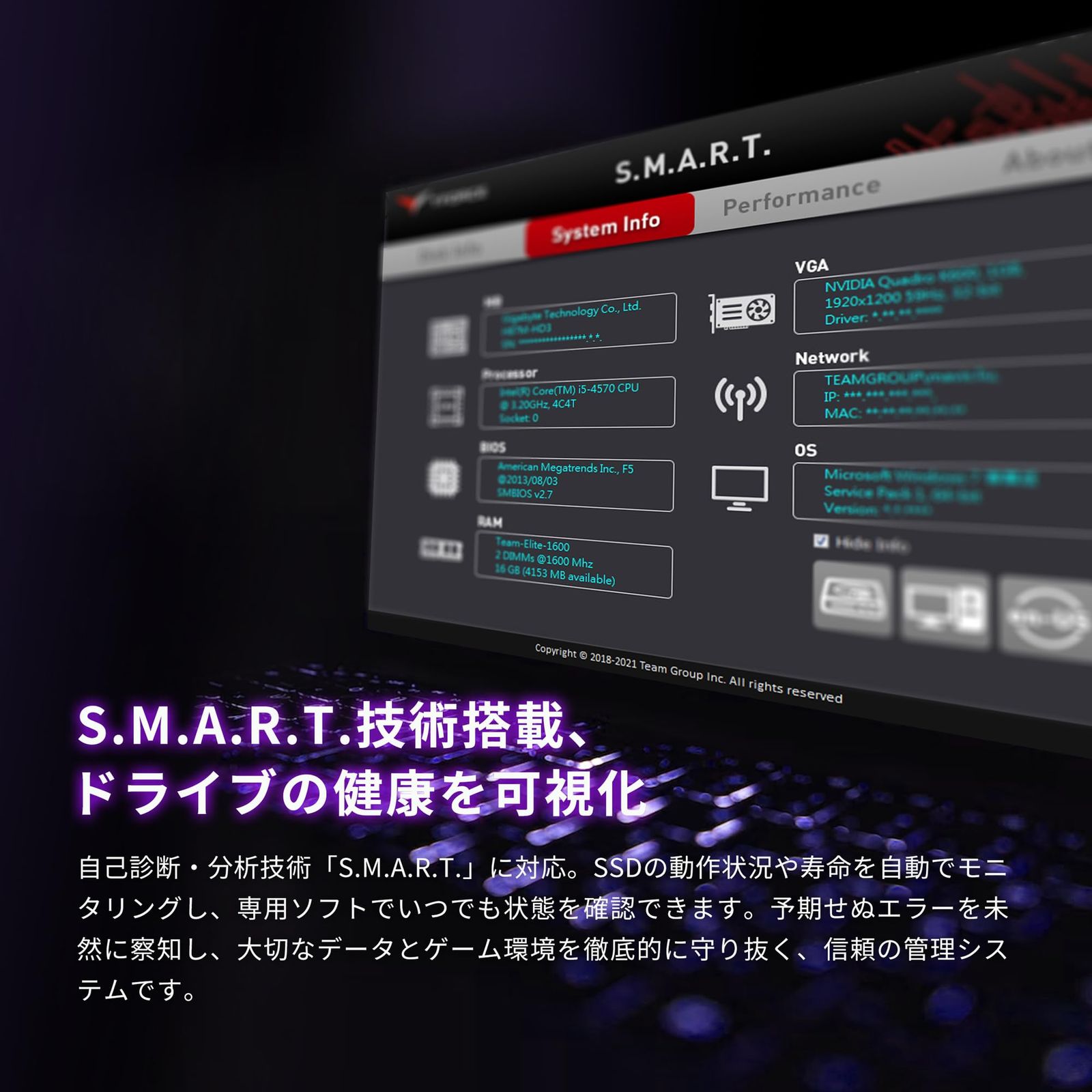【スマート最適化技術搭載】 Windows TRIM最適化コマンドとS.M.A.R.T技術をサポート。SSDの状態を常に安定させ、長時間のゲームプレイでもパフォーマンスを維持します。