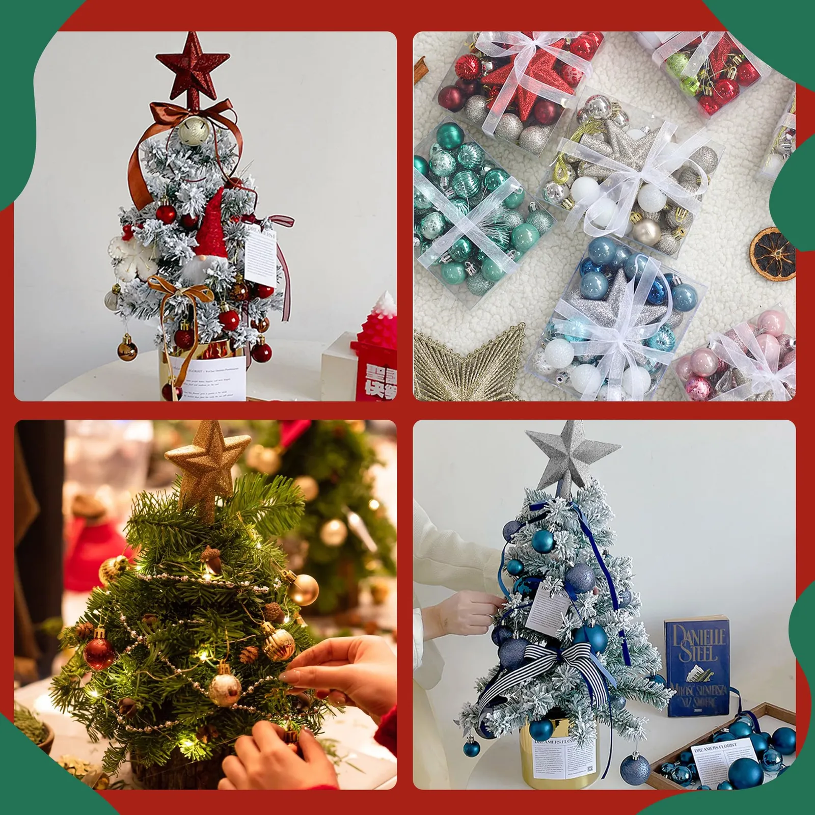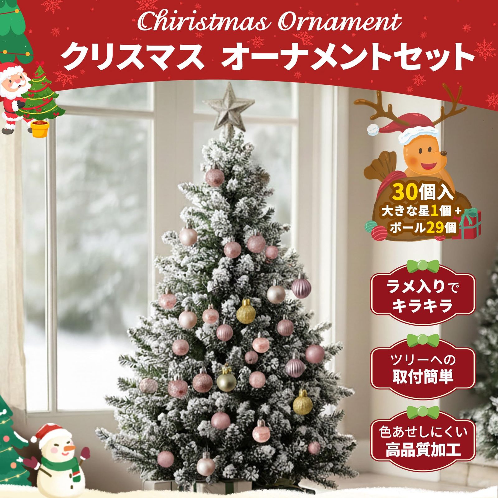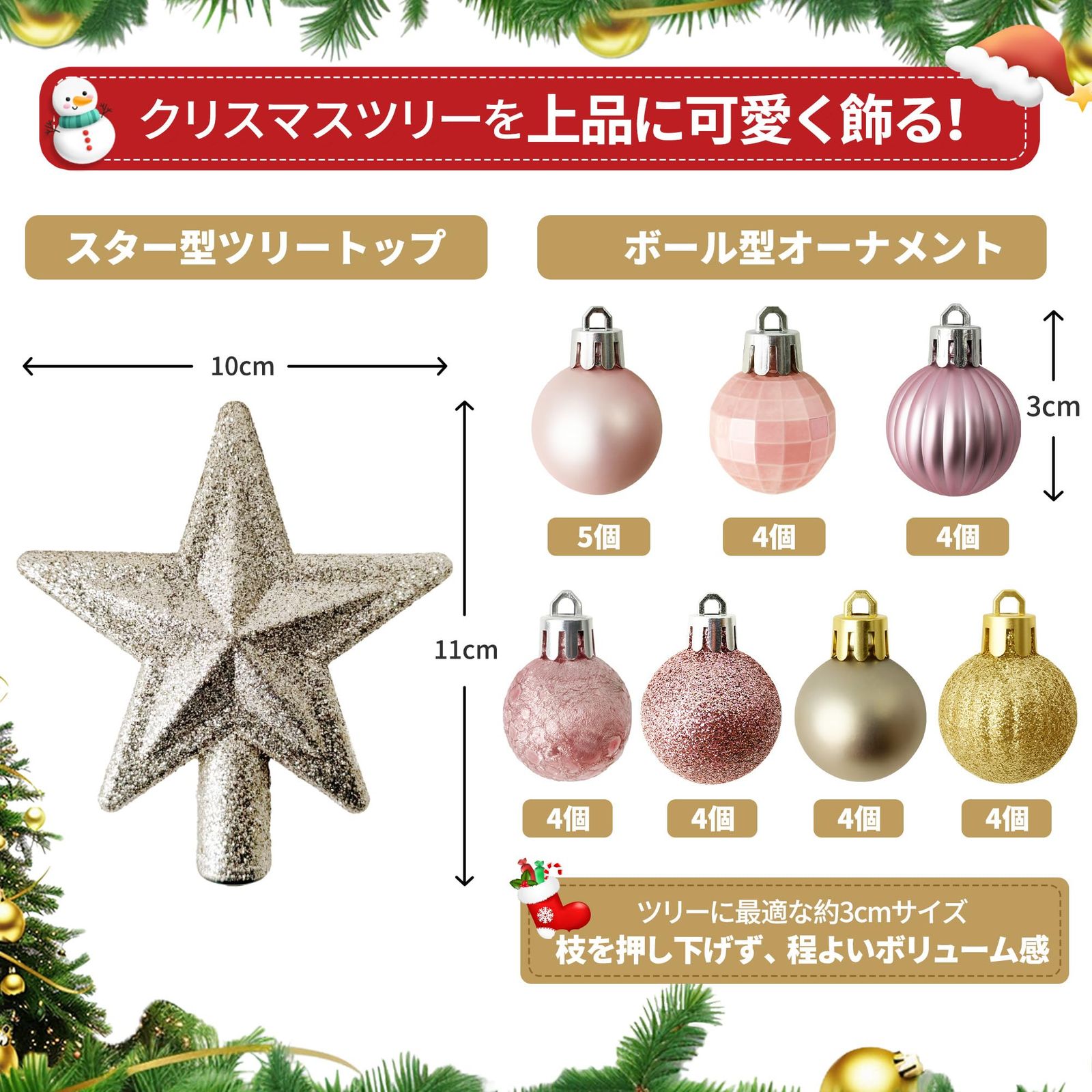 【30個入:ボール×29個 + 星×1個】 30個セットの内容は「大きな星形ツリートップ×1個 + ボール型オーナメント×29個」。より洗練された革新的な製造プロセスを採用しているため、長期間色あせしにくい特徴があります。各ボールには取り付け用のストラップロープが付属。サイズは、スター型ツリートップ:約11cm×10cm、ボール型オーナメント:直径約3cmです。