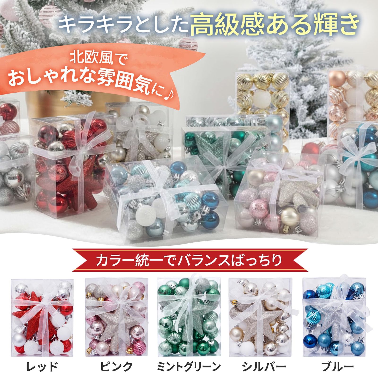【ツリーへの取付簡単】 「すぐ飾れる!」手間いらずで、箱から出してすぐ簡単に飾り付けられます。高級感のあるオーナメントをイルミネーションとともに飾れば、クリスマスツリーがキラキラと輝き、さながら美しい氷雪の景色のよう。北欧風のオーナメントセットで、お手持ちのツリーが可愛らしくかつ華麗に大変身!色合いに統一感があるので、バランス良く飾りやすいのもポイントです♪