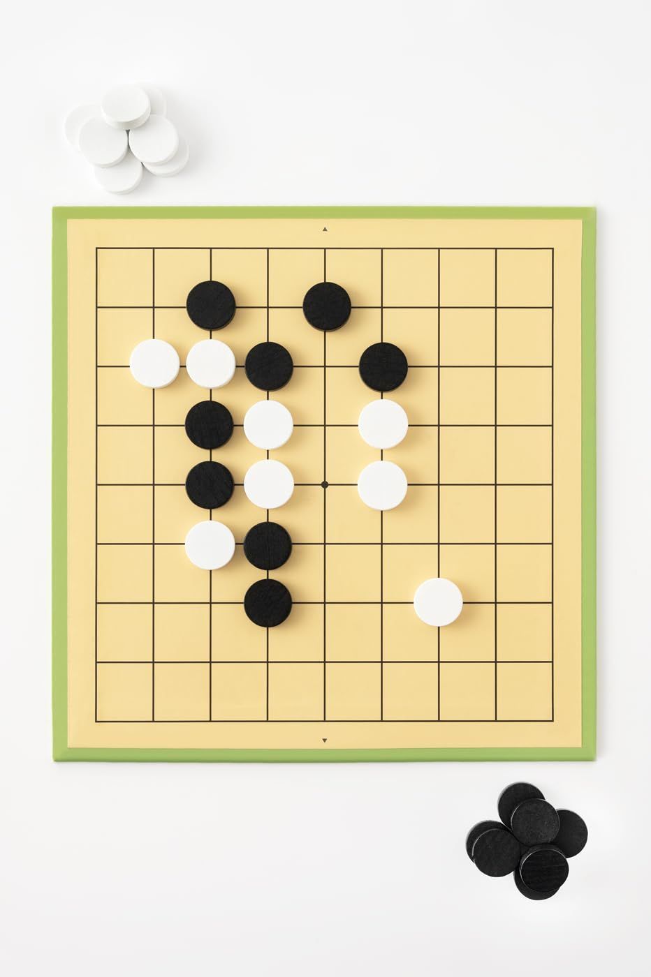 セット内容: 碁石84個(黒い馬42個/白い馬42個) 碁盤1枚(両面使用) あそびかたブック1冊(16ページ)