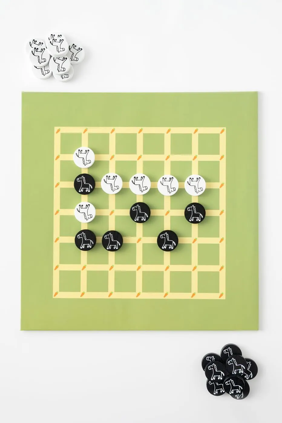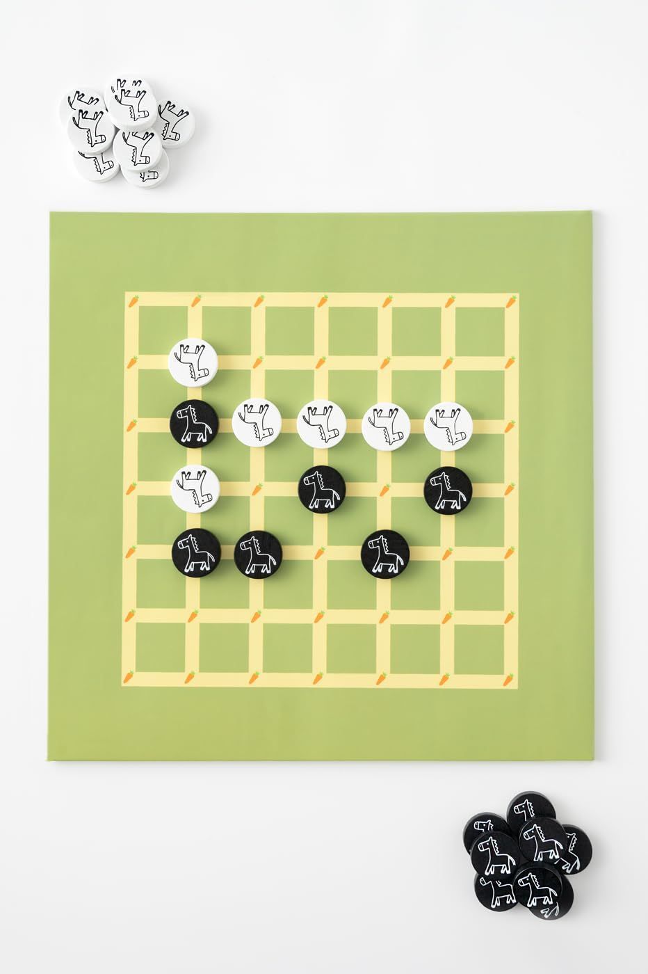 黒と白の碁石を馬に、碁盤をニンジンの草原に見立て、黒い馬と白い馬を交互に置いて草原のニンジンを囲んでいきます。