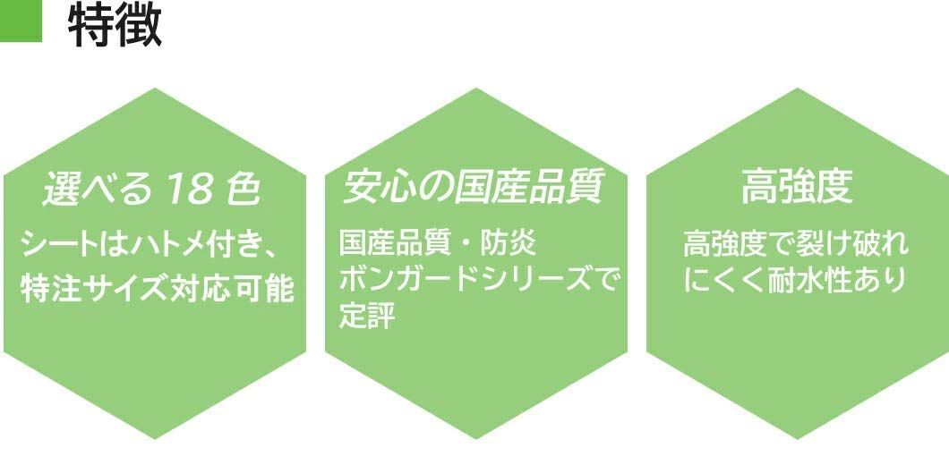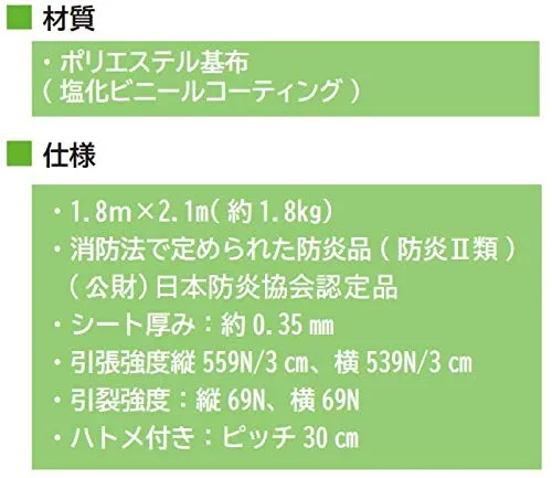 【仕様】周囲ハトメ(約30cmピッチ)取付済。消防法で定められた防炎品(防炎2類) (公財)日本防炎協会認定品。引張強度縦559N/3cm 横539N/3cm。引裂強度縦69N、横69N。