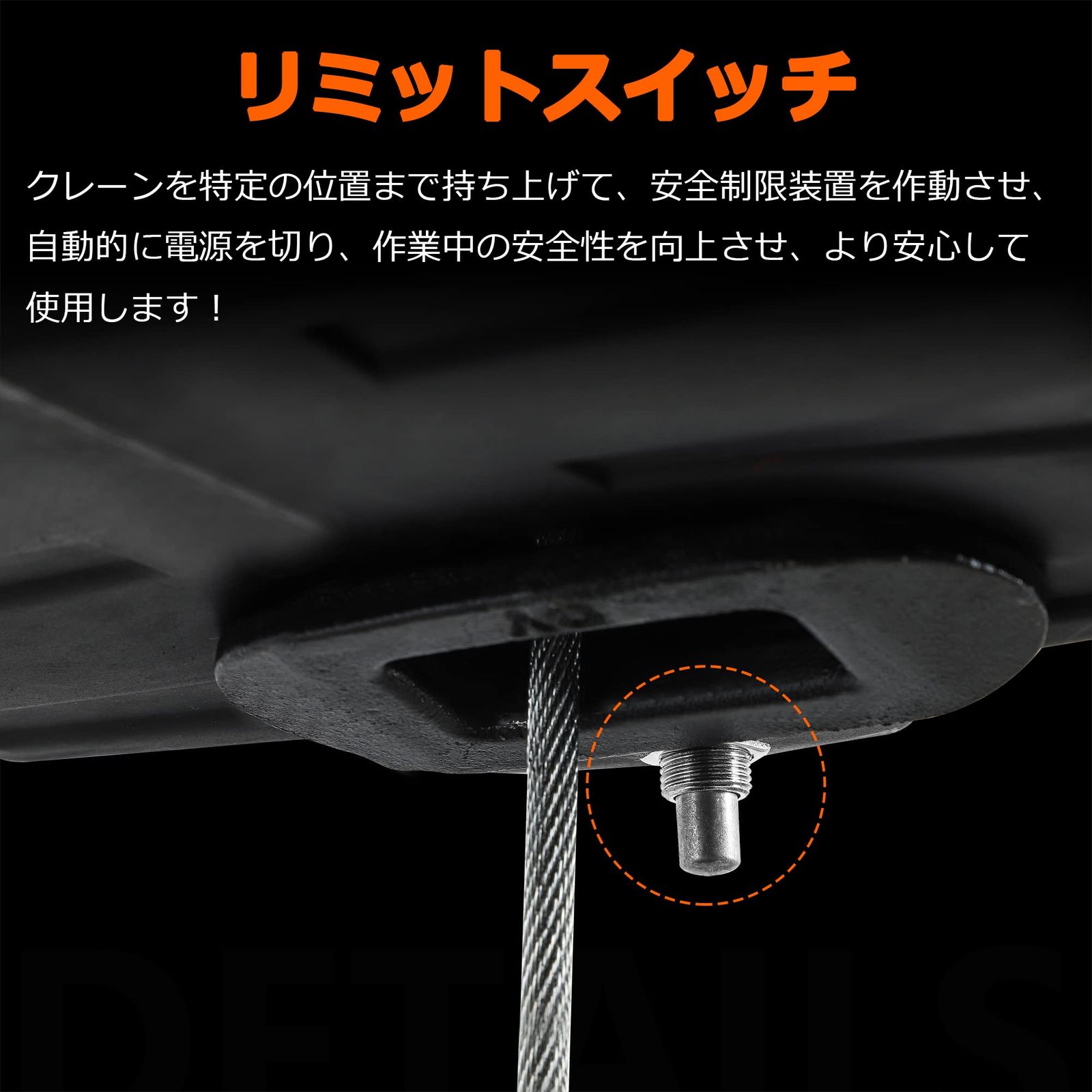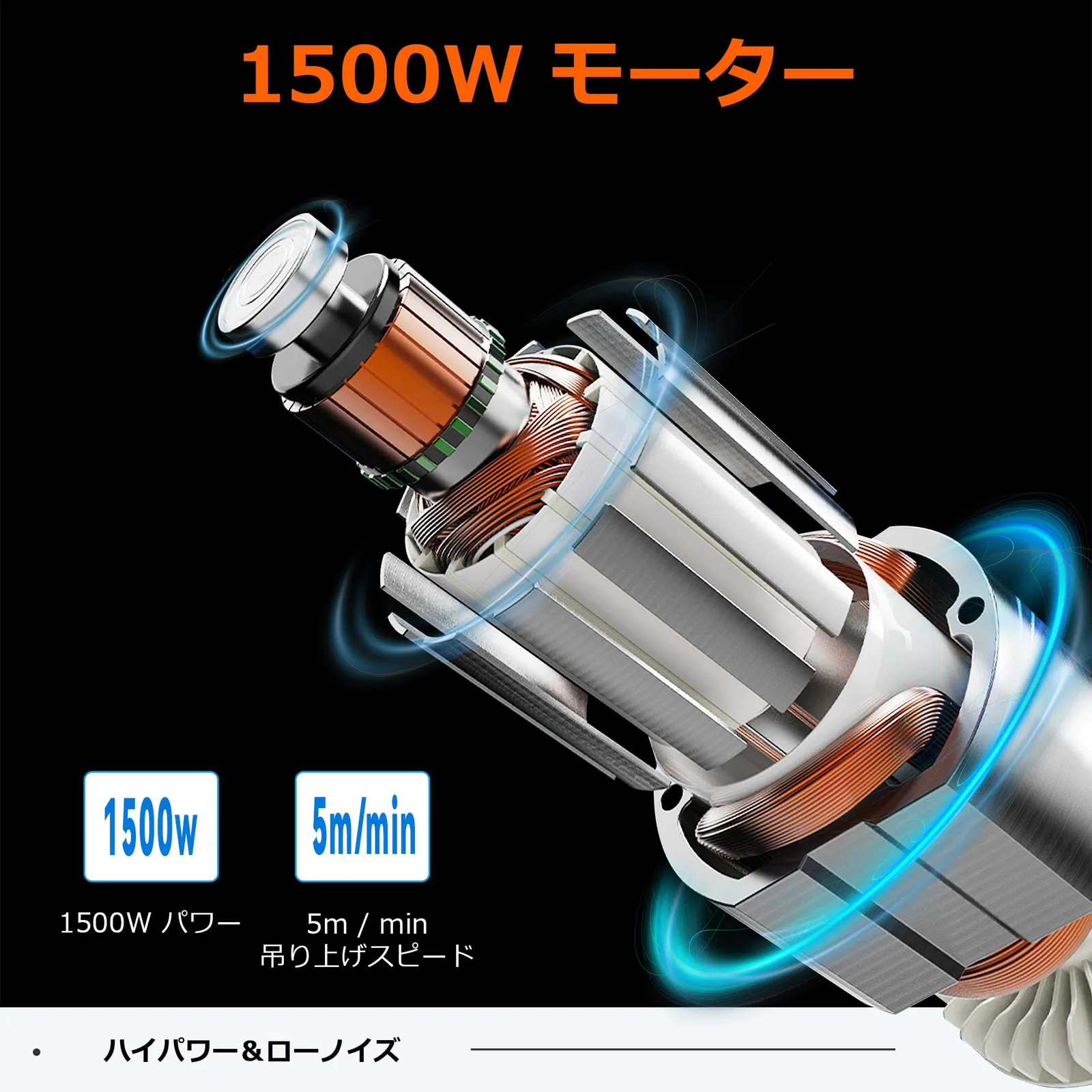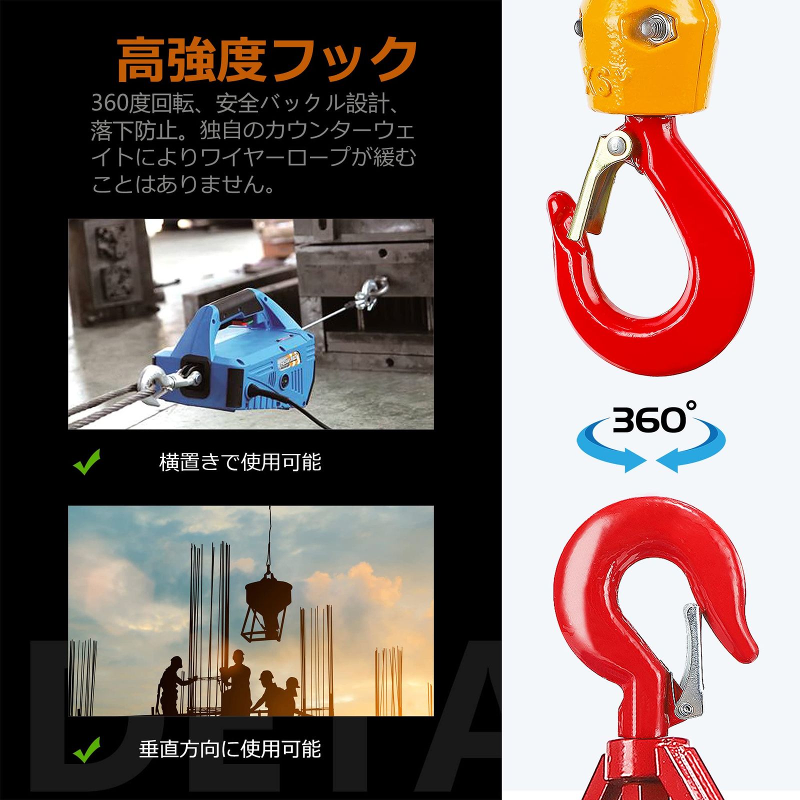 【デザイン】:放熱率よいアルミ製ギア箱;巻き込み防止機能;強動力全銅モーター;360°回転できる脱落防止フック。