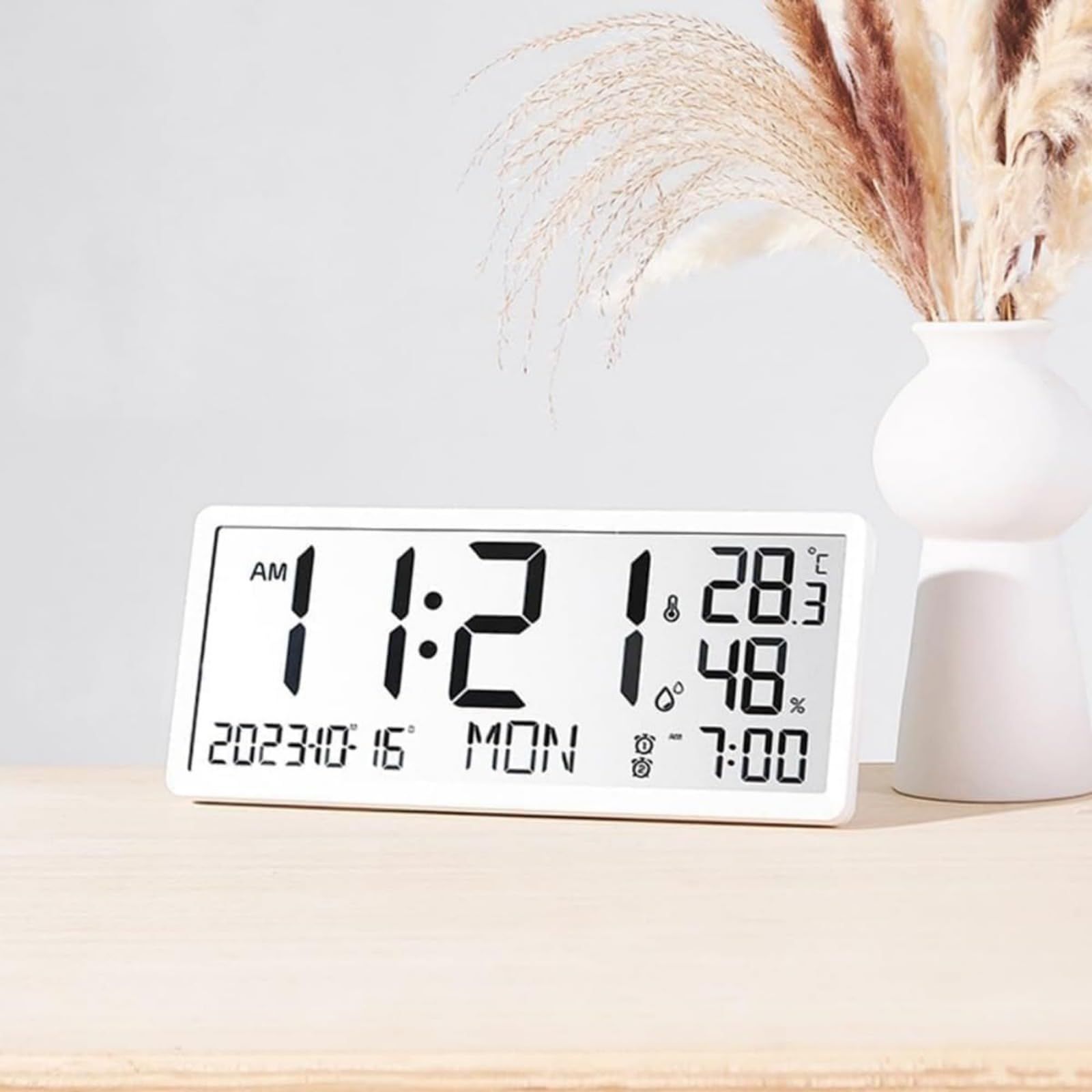 JBJSHHY大型ディスプレイデジタル壁掛け時計、日付と週、2つのアラーム、12/24時間、温度湿度表示、ホームオフィス高齢者向けLCD多機能デジタル目覚まし時計