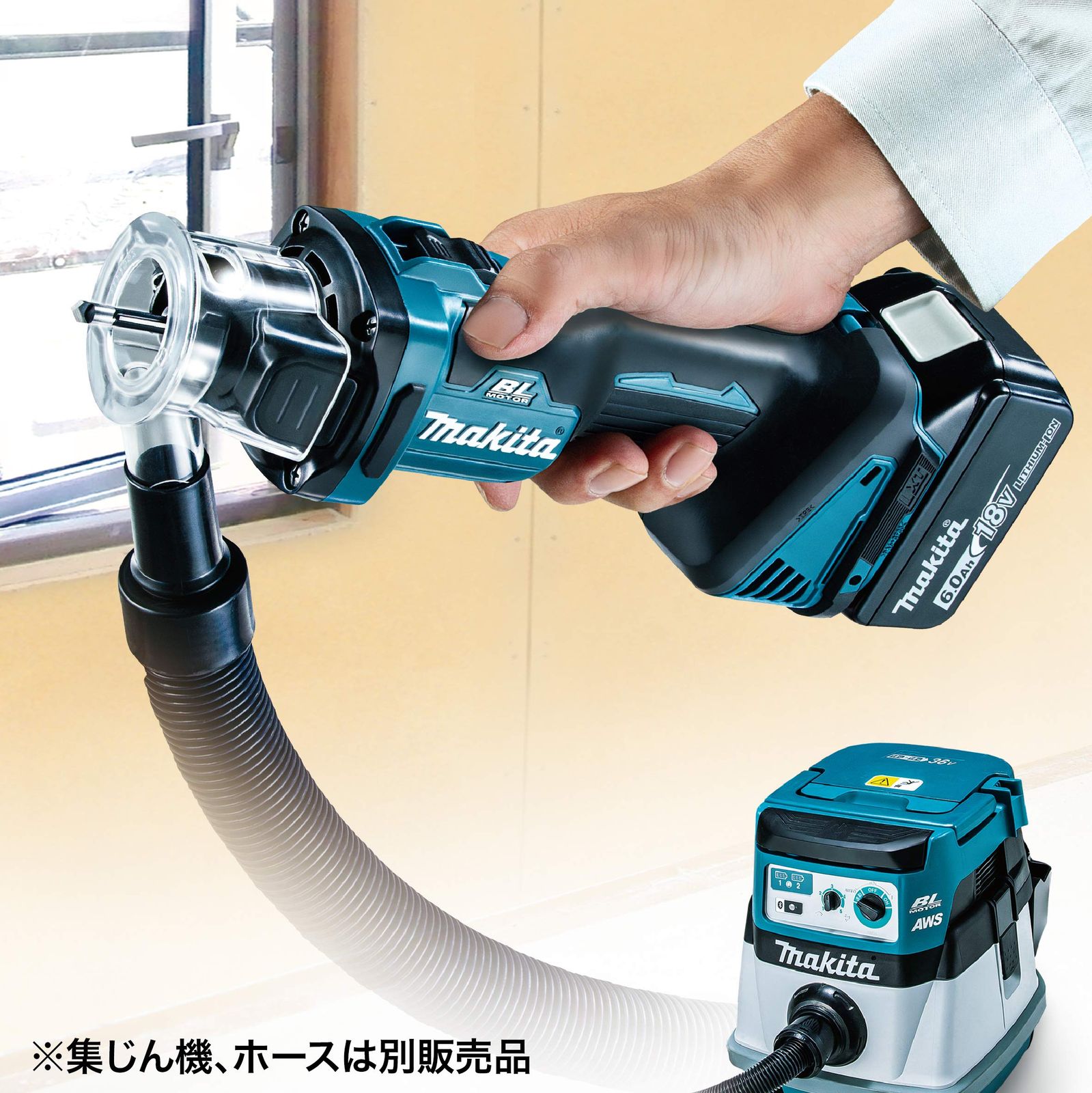 無線連動対応(Bluetooth)。充電式工具のスイッチONで集じん機も起動(集じん機、ワイヤレスユニット別売)。連動集じんで作業環境クリーン。