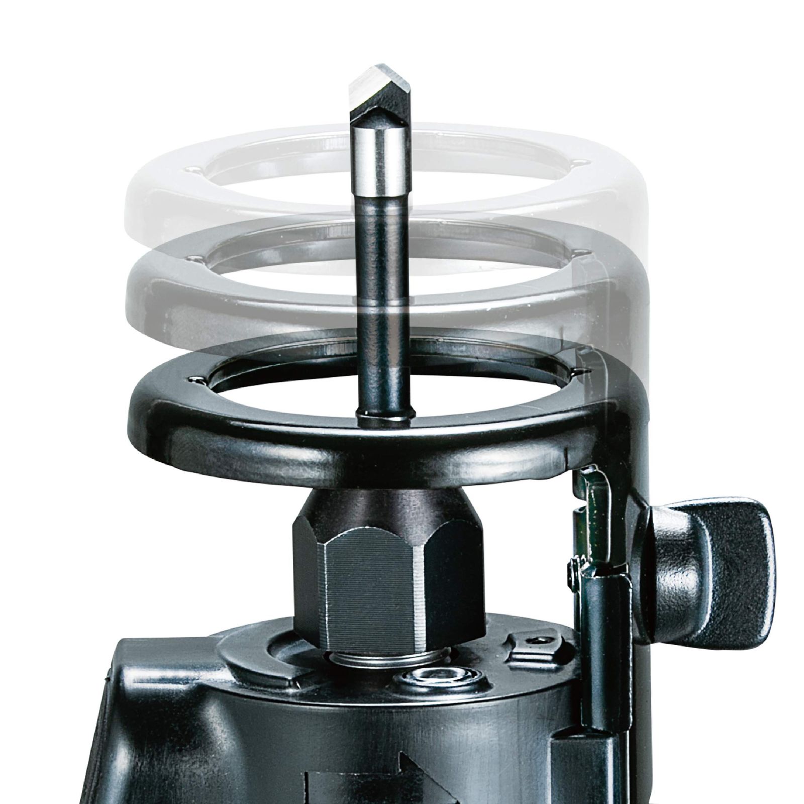 工具レス切込み深さ調整。ツマミネジをゆるめて、シュープレートの位置を素早く調整可能。