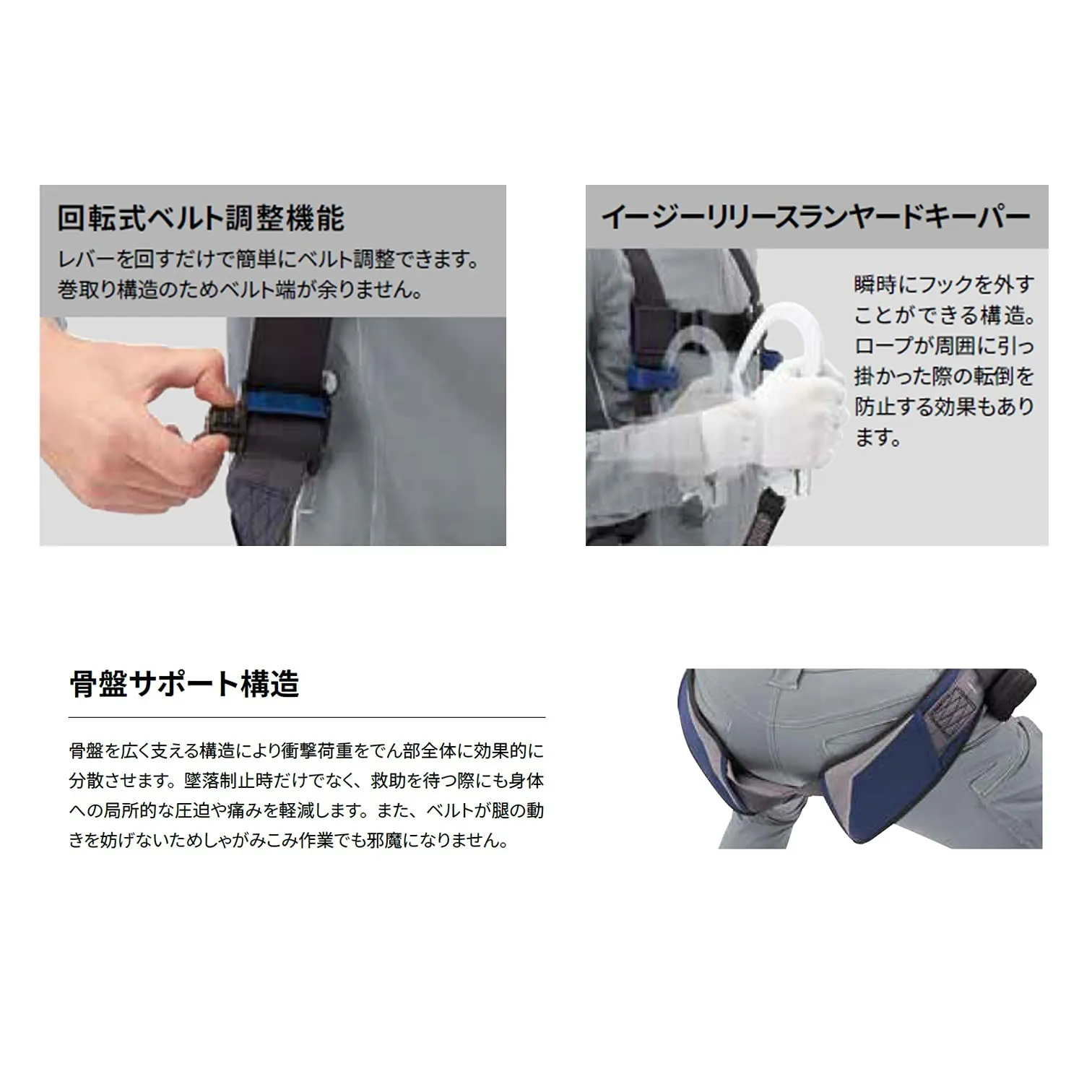 墜落防止時に骨盤全体に荷重が分散する、快適かつ安全な設計です。