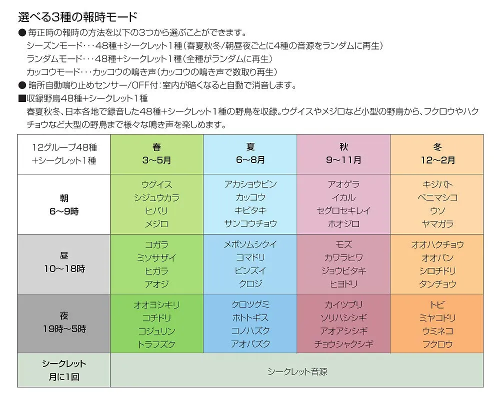 【選べる3種の報時モード】毎正時の報時方法をA~Cから選択。音量調節機能付き。A.シーズンモード(48種+シークレット1種から春夏秋冬/朝昼夜ごとに4種の音源をランダムに再生)B.ランダムモード(全49種がランダムに再生)C.カッコウモード(カッコウの鳴き声で数取り再生)