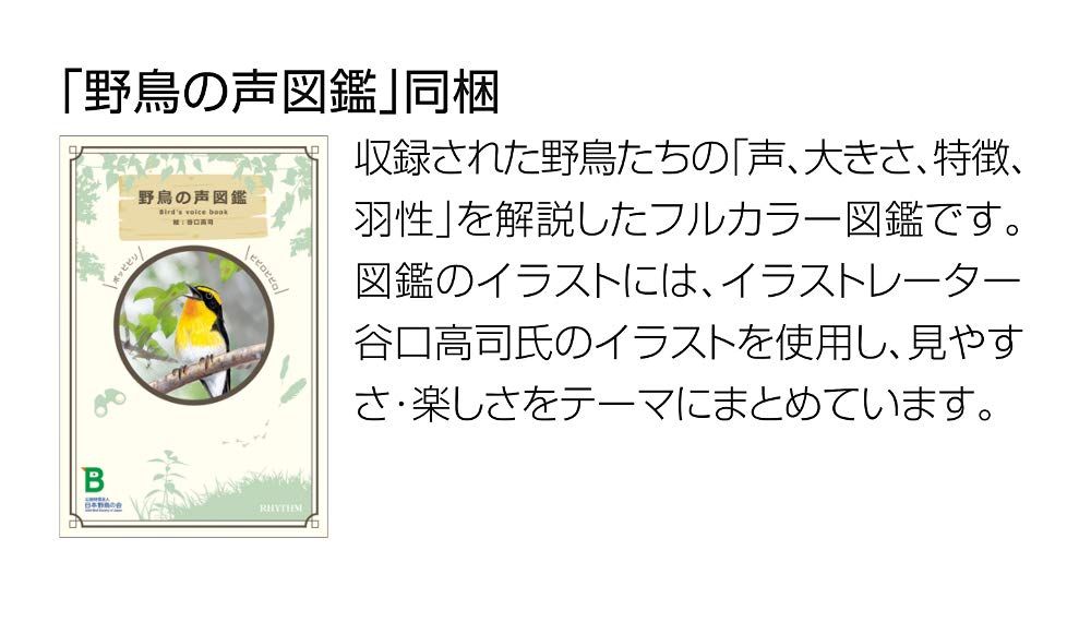 【「野鳥の声図鑑」同梱】収録された野鳥たちの「声、大きさ、特徴、習性」を解説したフルカラー図鑑です。図鑑のイラストには、野鳥図鑑画家谷口高司氏の図版を使用し、見やすさ・楽しさをテーマにまとめています。