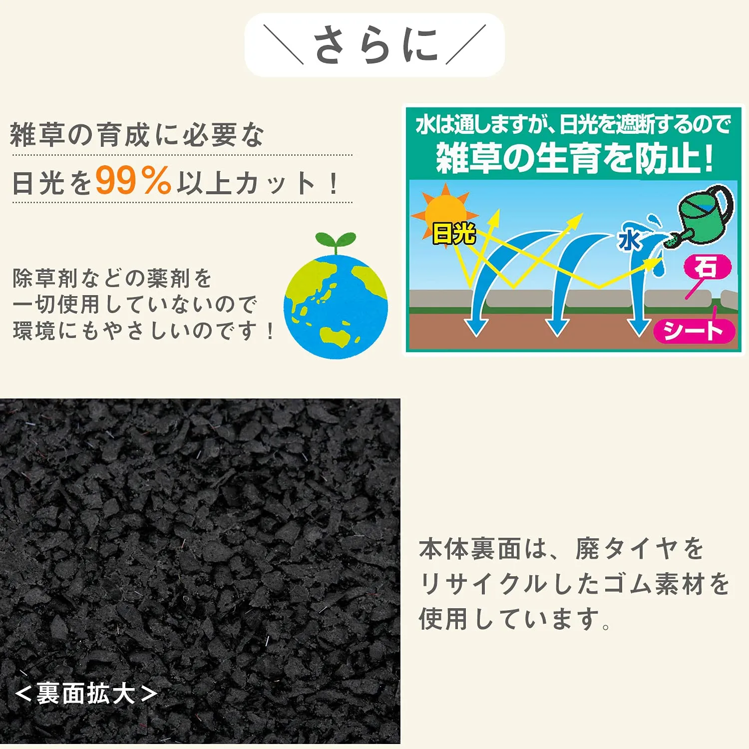 雑草の育成に必要な日光を99%カットし、育成を防止。面倒な草引きの手間を省きます