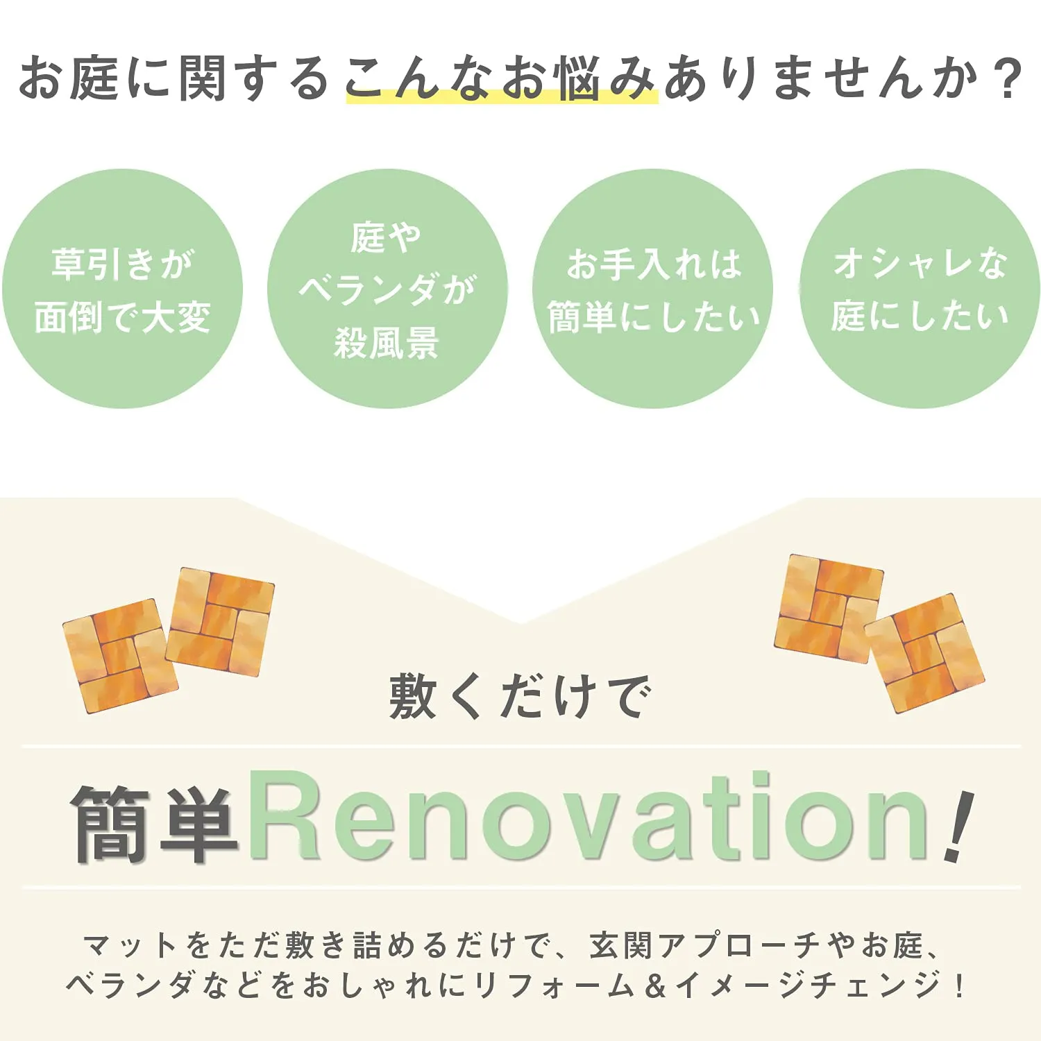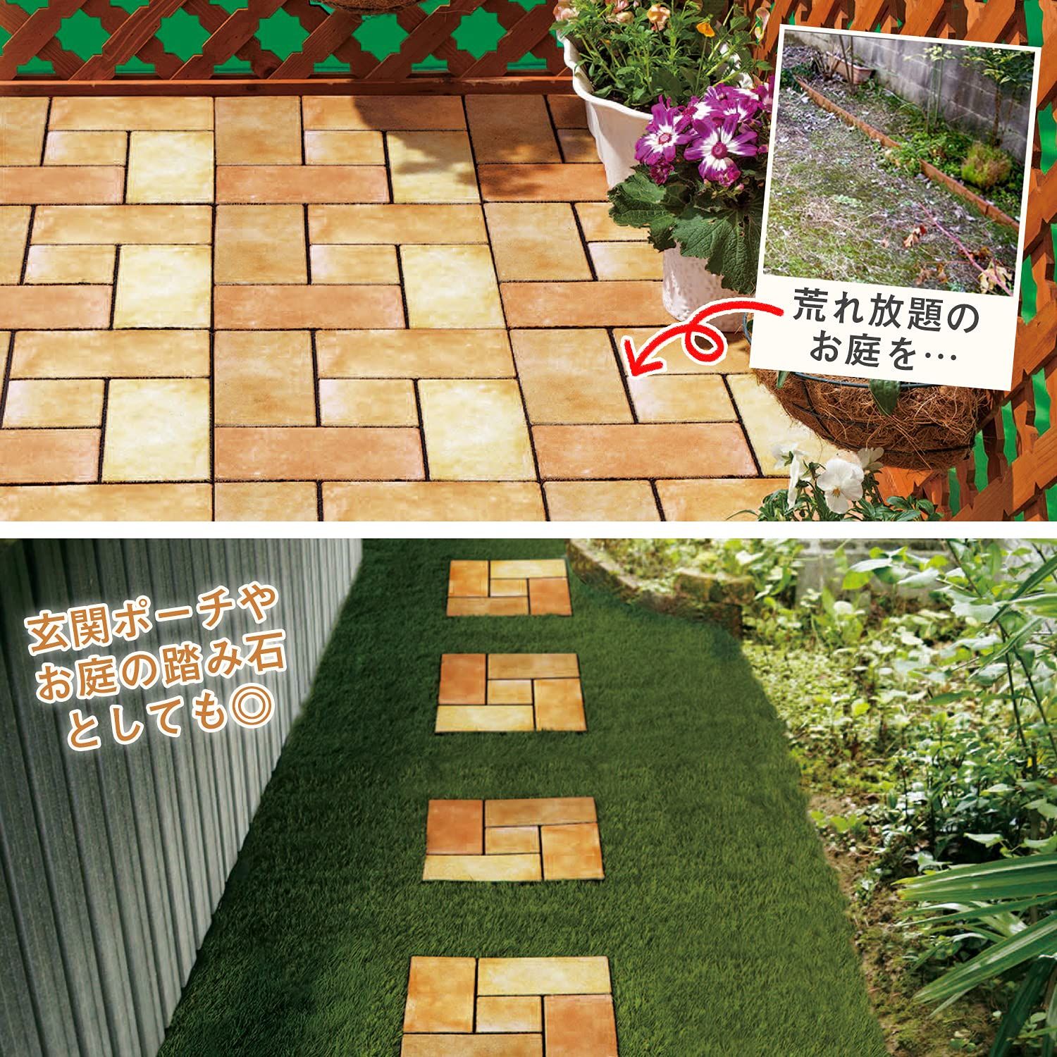 マットを敷き詰めるだけで玄関や庭、ベランダを簡単リフォーム。雑草の防止にもなります