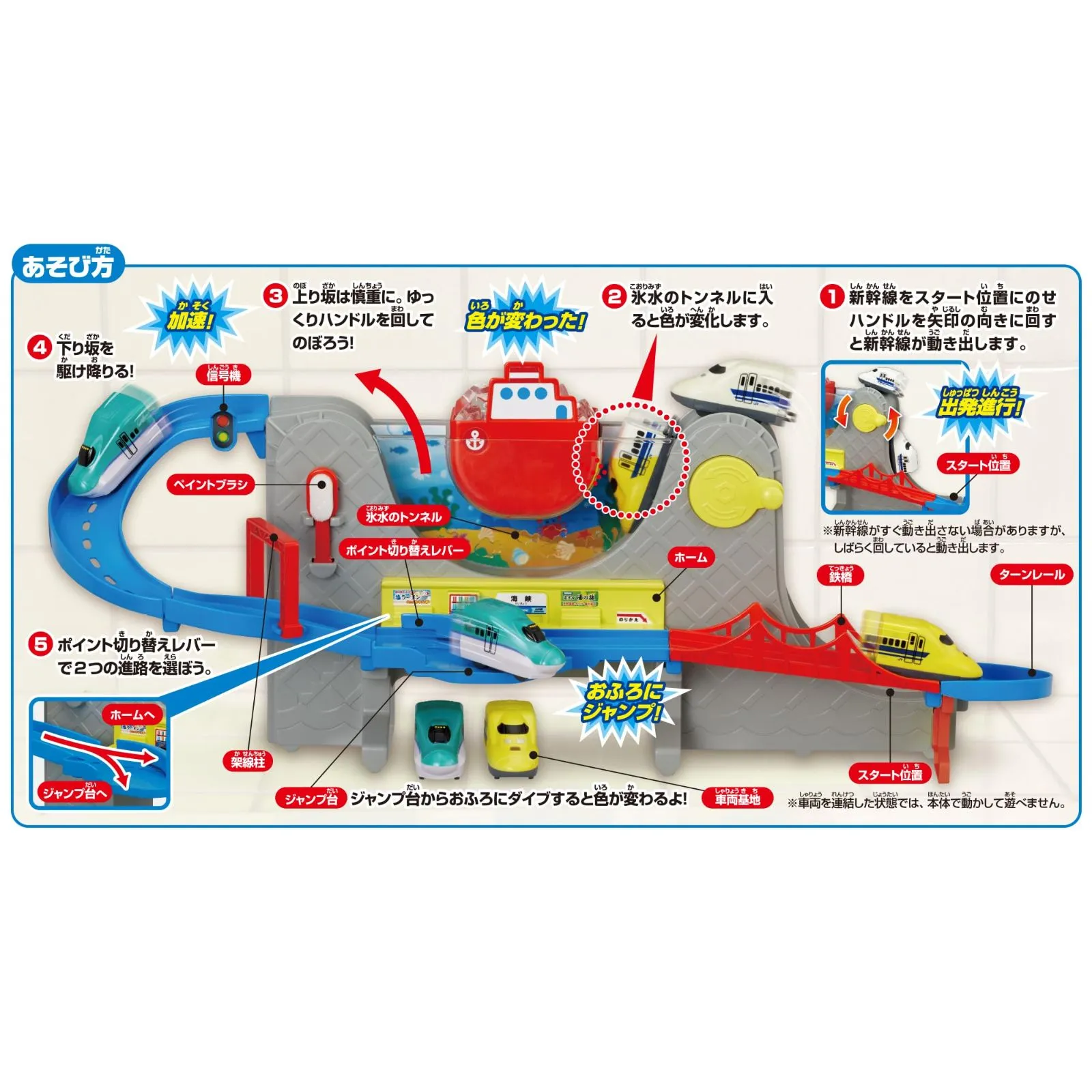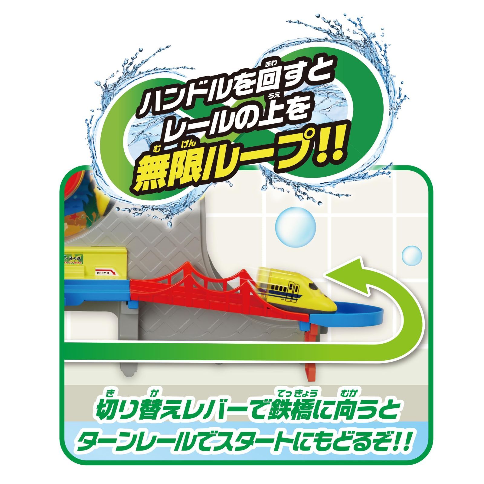 おふろのお湯と氷水で何度でも繰り返し色が変わる不思議なミニカーとレールのセット。ハンドルを回すと新幹線(はやぶさ、ドクターイエロー)がおふろのレールを走り、氷水のトンネルを通ると色が変わるよ。電池不要で、おふろでもお部屋でも遊べます。