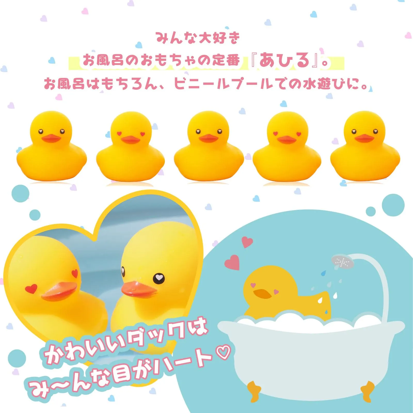 デザインは2種類。5羽のかわいいダックはよく見ると全員目がハートです♪ラブラブダックがお子様のお風呂タイムを楽しくしてくれます。