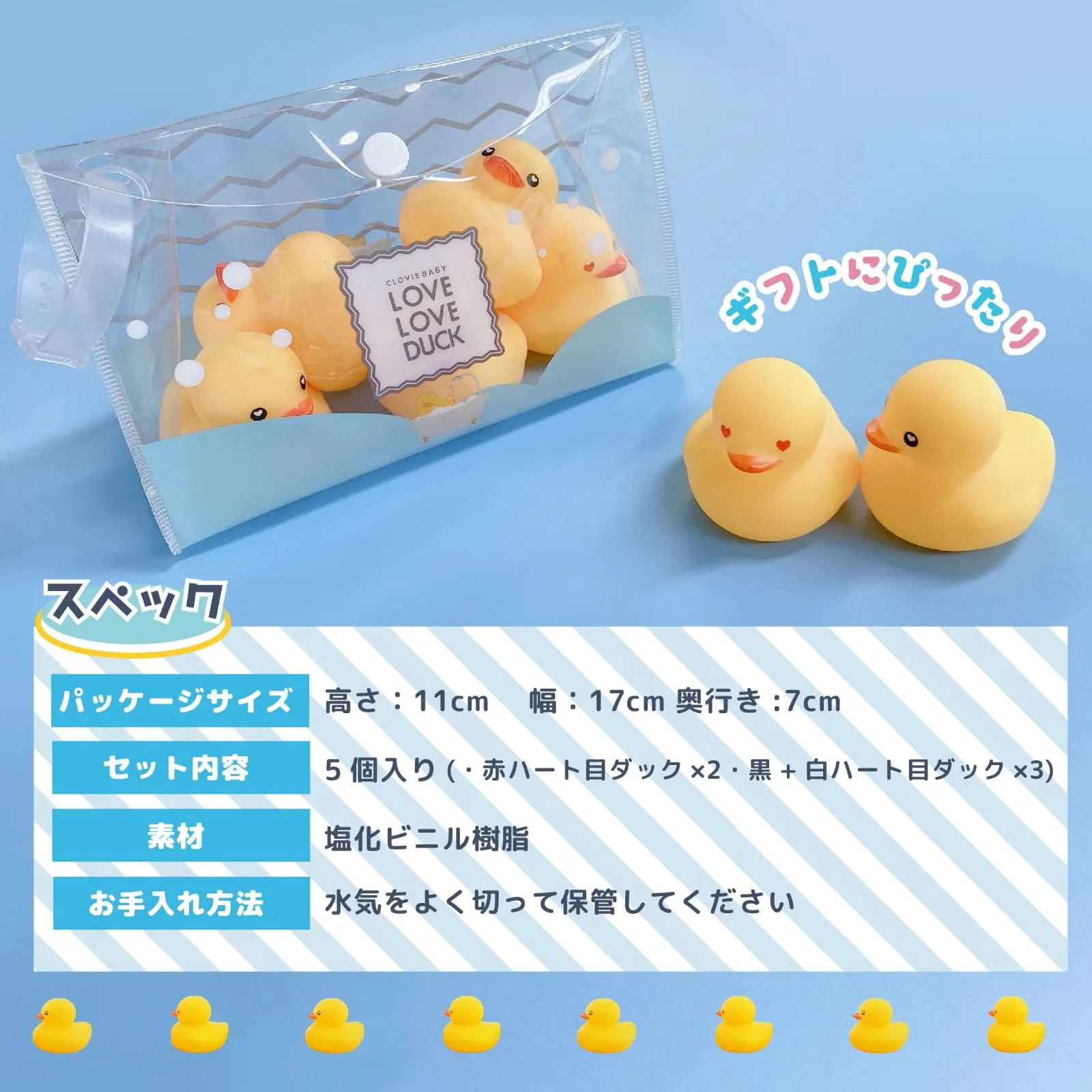 クロビスベビー ハートのお目目の可愛いアヒル ラブラブダック in ポーチ お風呂やプールで遊べる 空気穴無し 5個入り CB-LLD-B イエロー