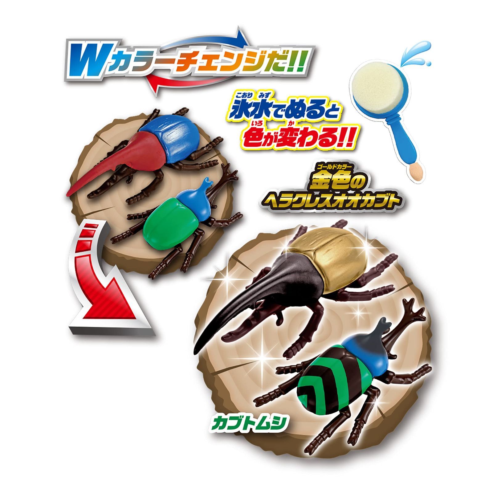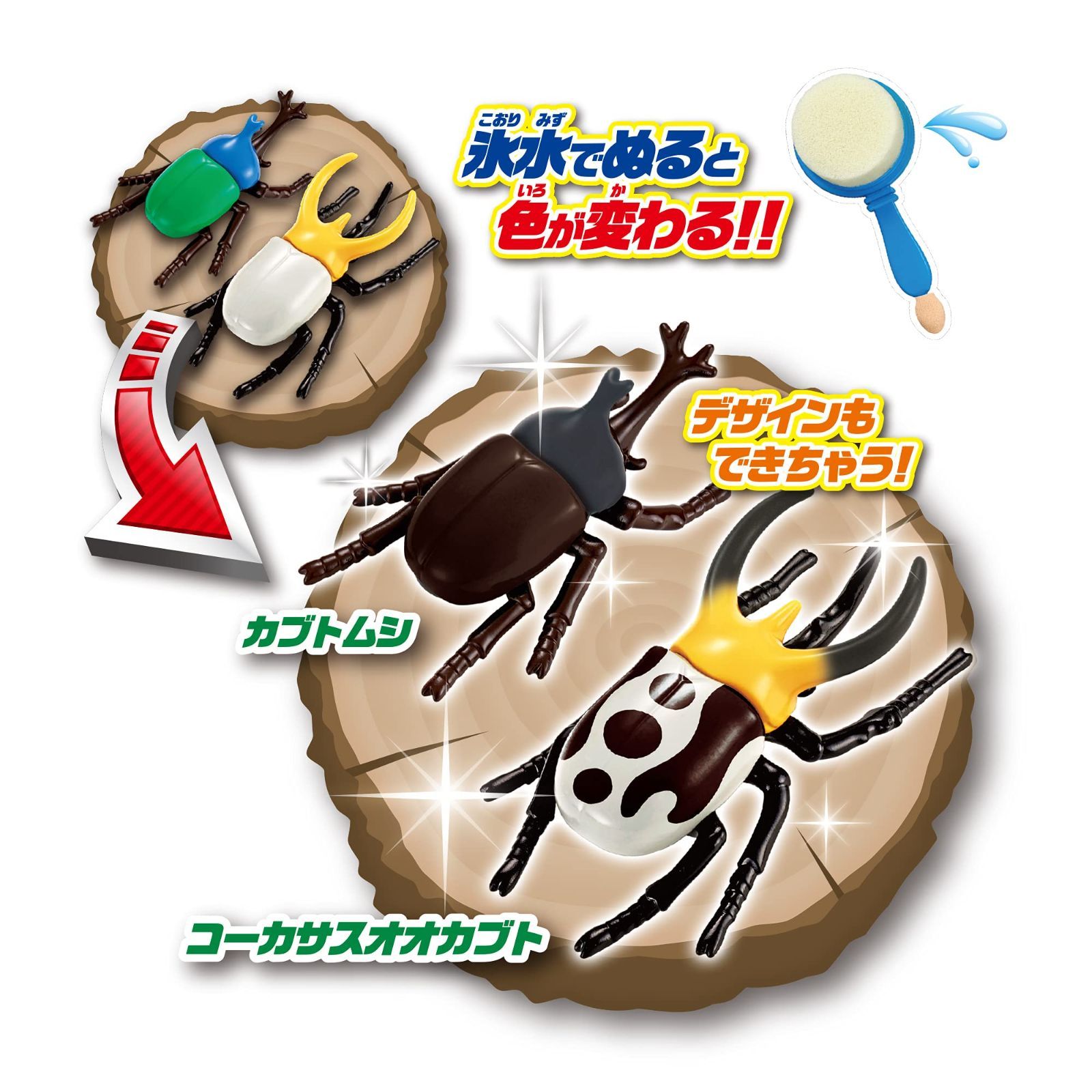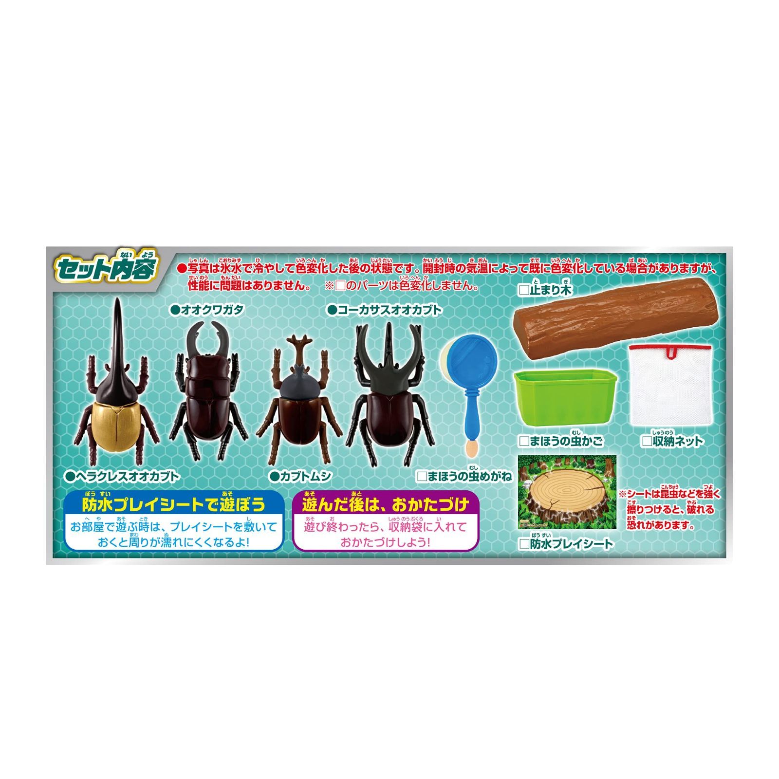 おふろでもお部屋でも遊べるカブトムシとクワガタのセット。お湯と氷水で色が変わり、何度でも繰り返し遊べるよ。ヘラクレスオオカブト、カブトムシ、コーカサスオオカブト、オオクワガタの色を変えて、止まり木の上で対戦して遊ぼう。