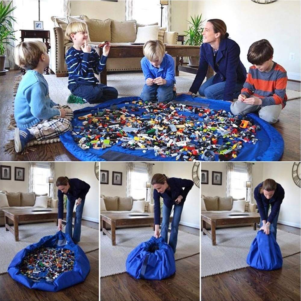片付け簡単:シートのようになっている収納袋です。この上で遊べて、遊び終わったあと紐をキュッと絞めるだけでお片付け完了!おもちゃ箱よりとても簡単です。特におもちゃブロック等の細かいパーツのおもちゃの片付けが快適に。