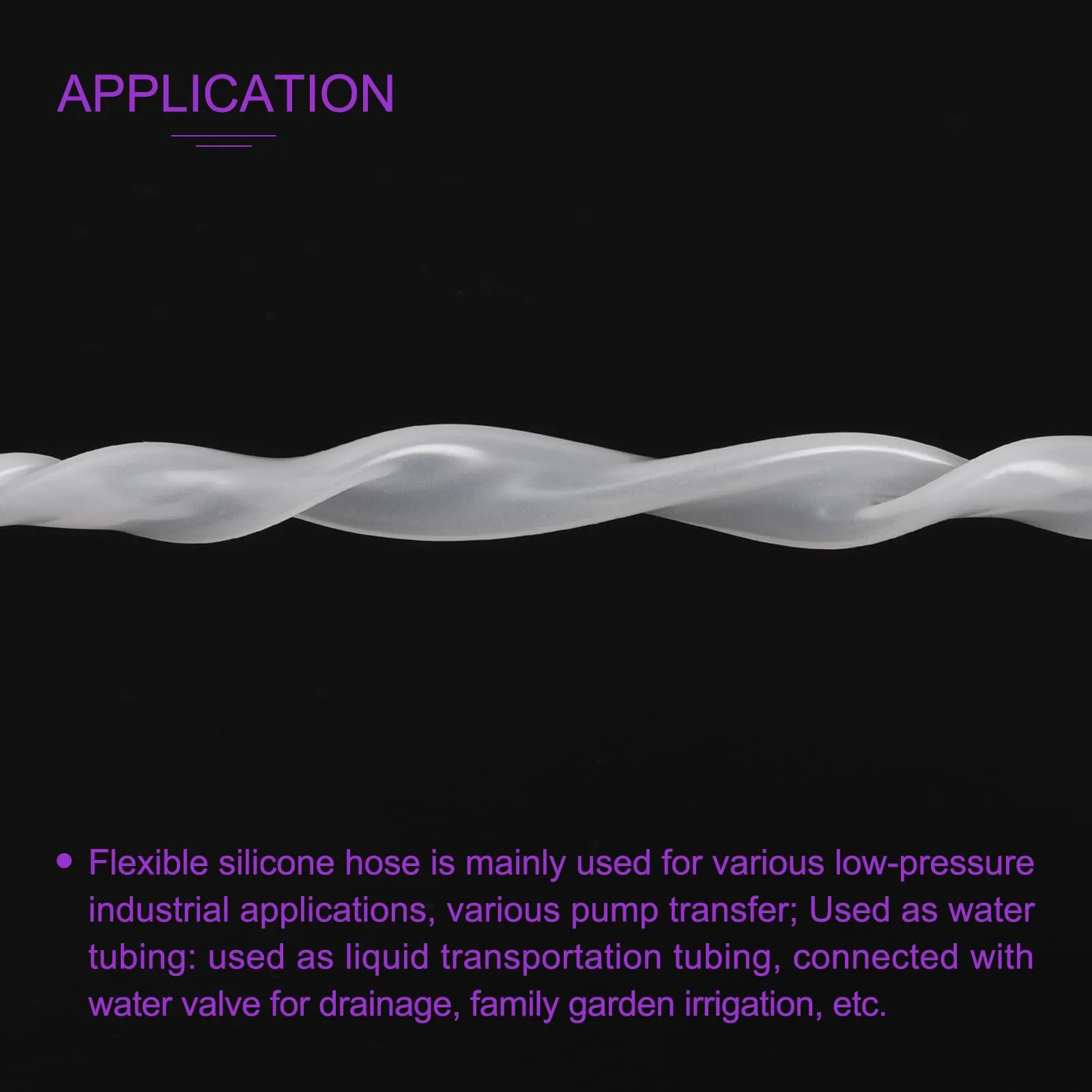 用途: 柔軟シリコンホースは主に各種低圧工業用途、ポンプ輸送用に使用されます。水配管として使用可能:液体輸送用チューブ、排水用バルブ接続、家庭用庭園灌漑などに使用できます。