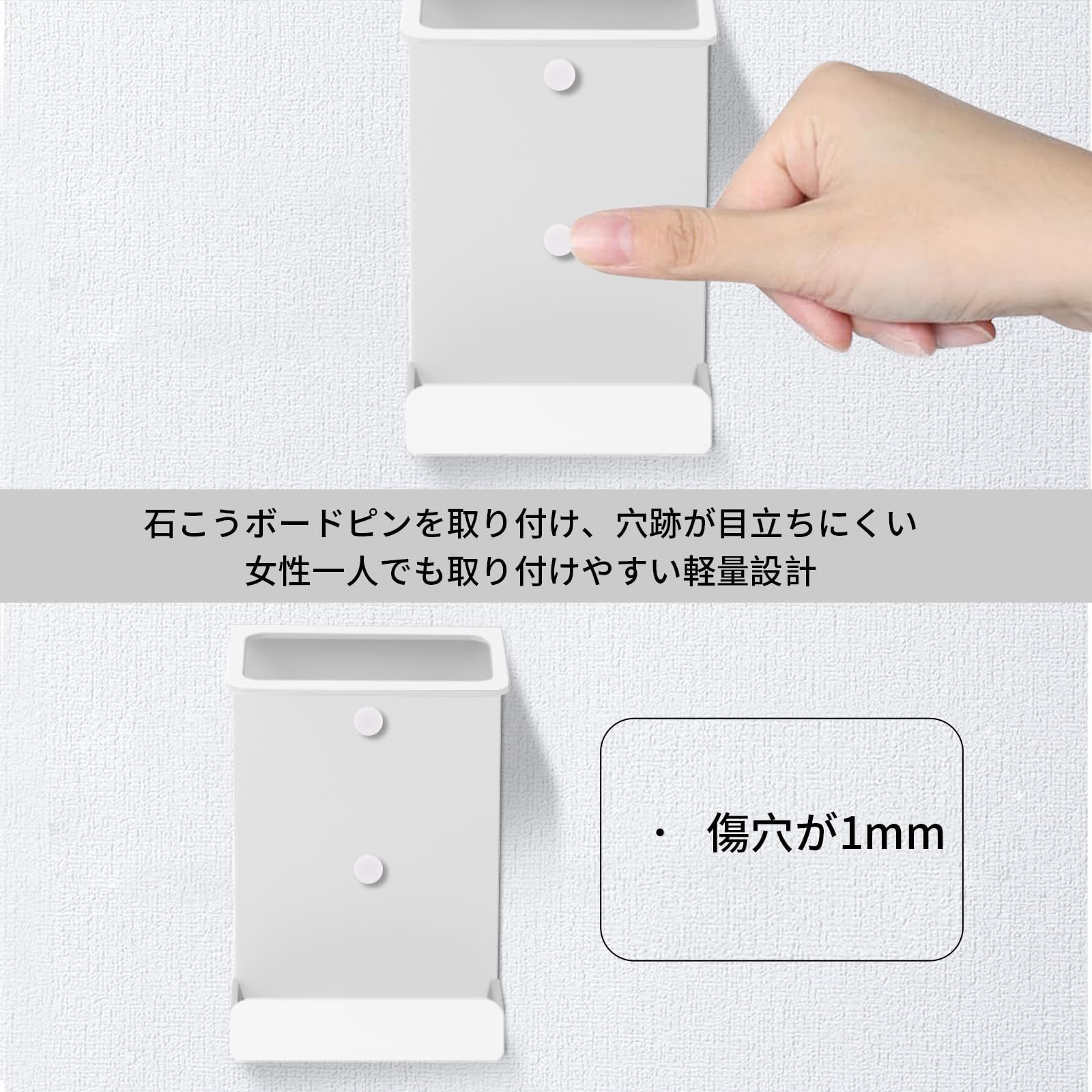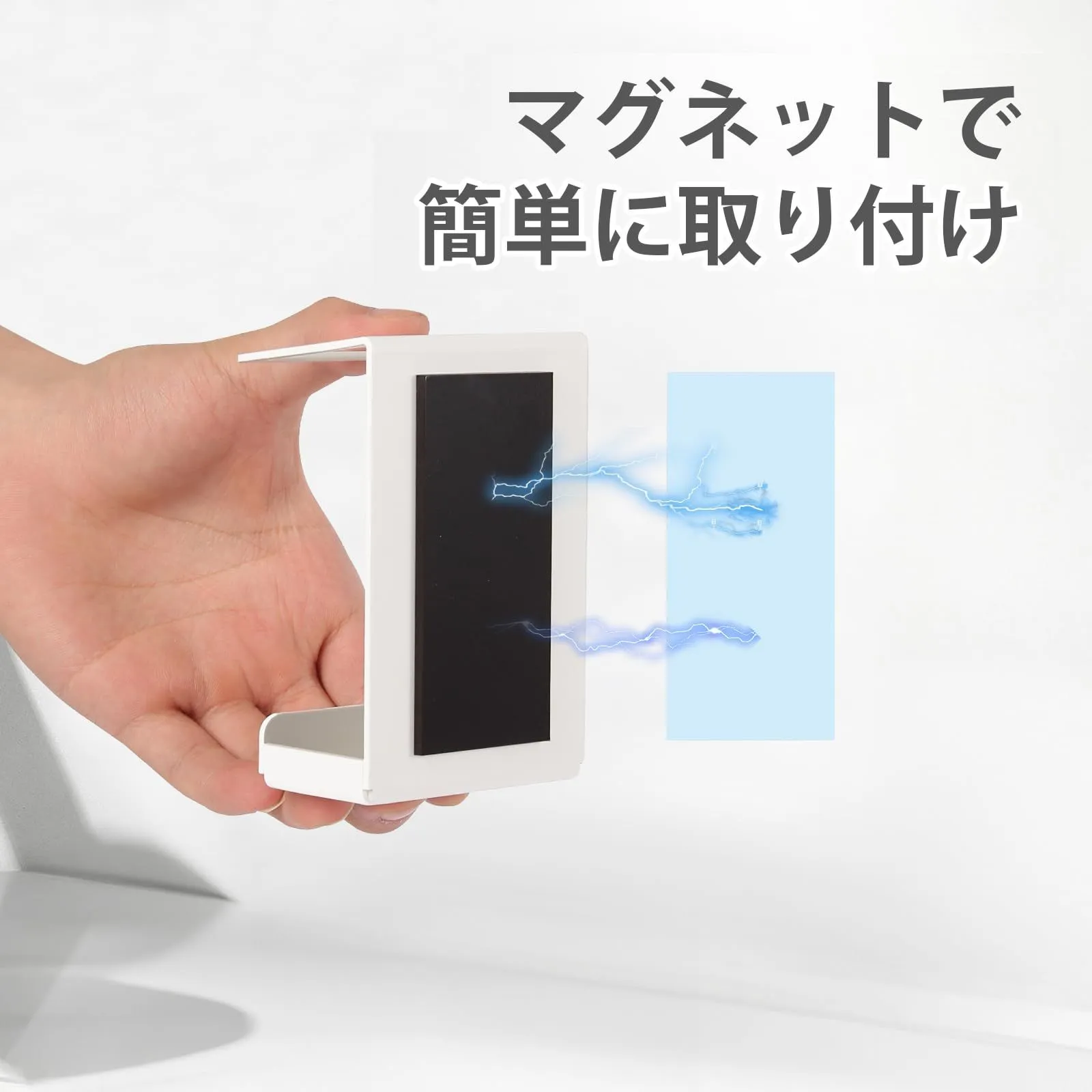 取り付け簡単: 壁の穴が目立ちにくい、石こうボードピンで取り付けベースを壁面にセットし、本体をはめ込みます。付属のマグネットプレートでも設置が可能。