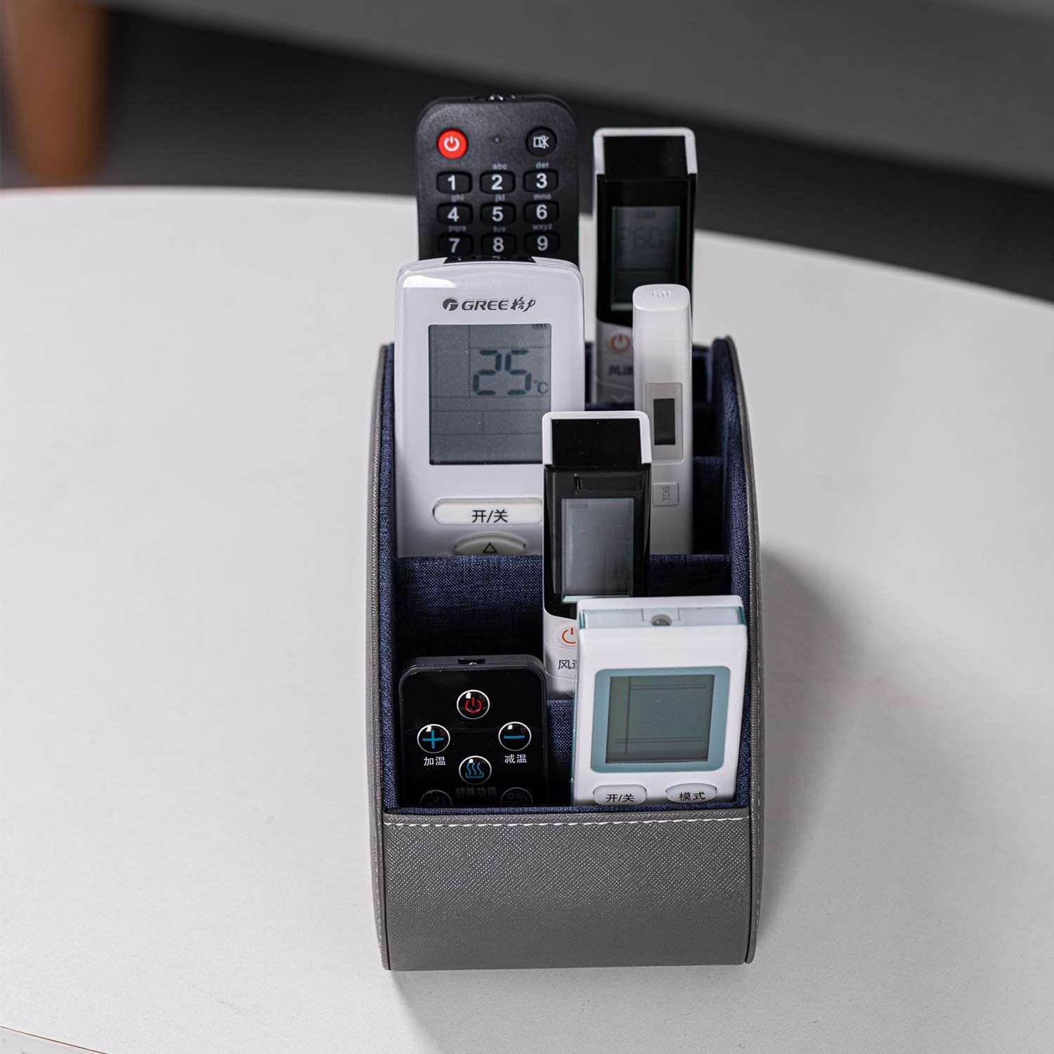 リモコンラック PUレザー 大きいサイズ リモコン収納 テーブル 5格仕切り リモコンスタンド おしゃれ 防水 多機能収納ボックス 大容量 文房具 卓上小物 (グレー, ベーシックモデル)