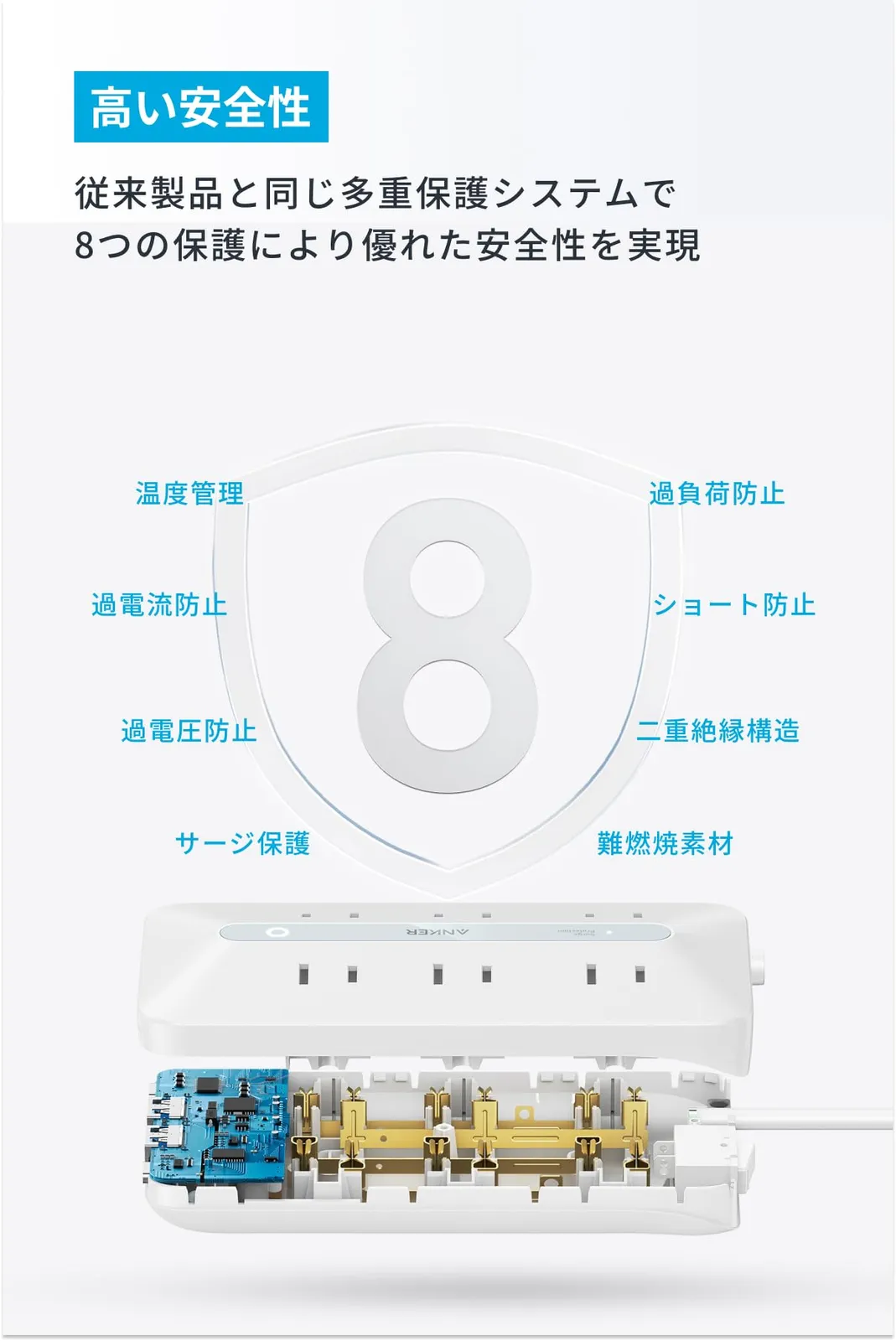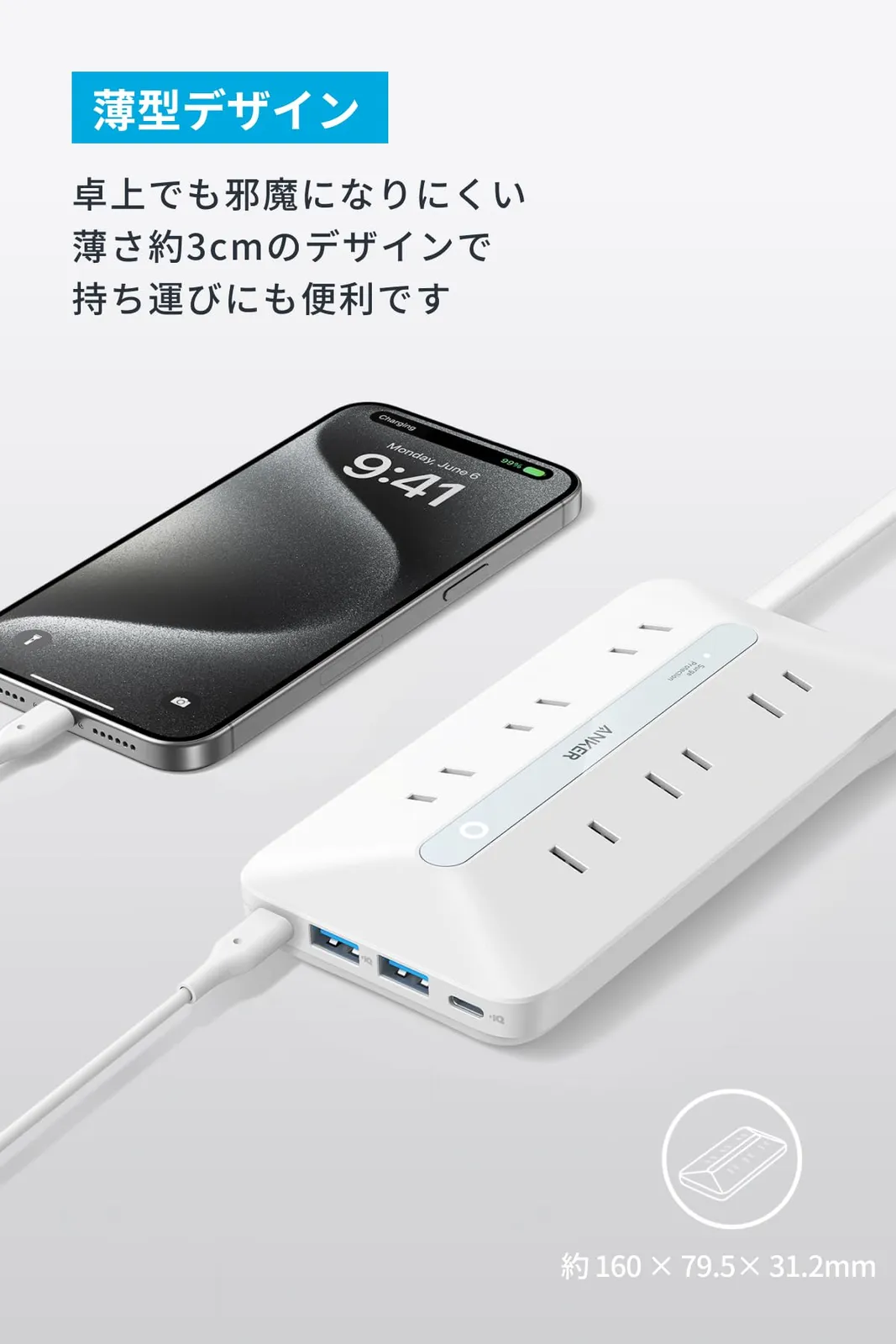 【PSE技術基準適合/USB Power Delivery対応 】MacBook PD対応 Windows PC iPad iPhone Galaxy Android スマートフォン ノートPC 各種 その他機器対応 薄型でコンパクト設計:卓上でも邪魔になりにくい薄さ約3cmのコンパクトデザインで設計されており、持ち運びにも便利です。 10台の機器を同時充電可能:USB-Cポート (×2)、USB-Aポート (×2) コンセント差込口 (×6)を搭載し、最大10台の機器に同時へ充電可能です より使いやすいデザイン:コンセント差込口部分には15度の傾斜を採用。プラグの抜き差しがより簡単になりました。 絡まりにくいケーブル内蔵:絡まりにくいフラットタイプのコードを採用し、薄くコンパクトにまとめられるため、 持ち運びにも便利です 高い安全性:従来製品と同じ多重保護システムに加え、ActiveShield? 2.0により優れた安全性を実現。独自の温度管理と接続端末の保護システムでお使いの機器を24時間守ります。 パッケージ内容:Anker USB Power Strip (10-in-1, 20W)、ネジ (2本)、取扱説明書、カスタマーサポート ブランド Anker 色 ホワイト 電源コンセントの総数 10 電圧 125 ボルト 特徴 USBスロット, 持ち運びやすい 最後までご確認頂き誠にありがとうございました。 ご確認頂き、ご購入いただけましたら幸いです。 何かご不明点などがございましたらお気軽にメッセージからお問い合わせ下さい。