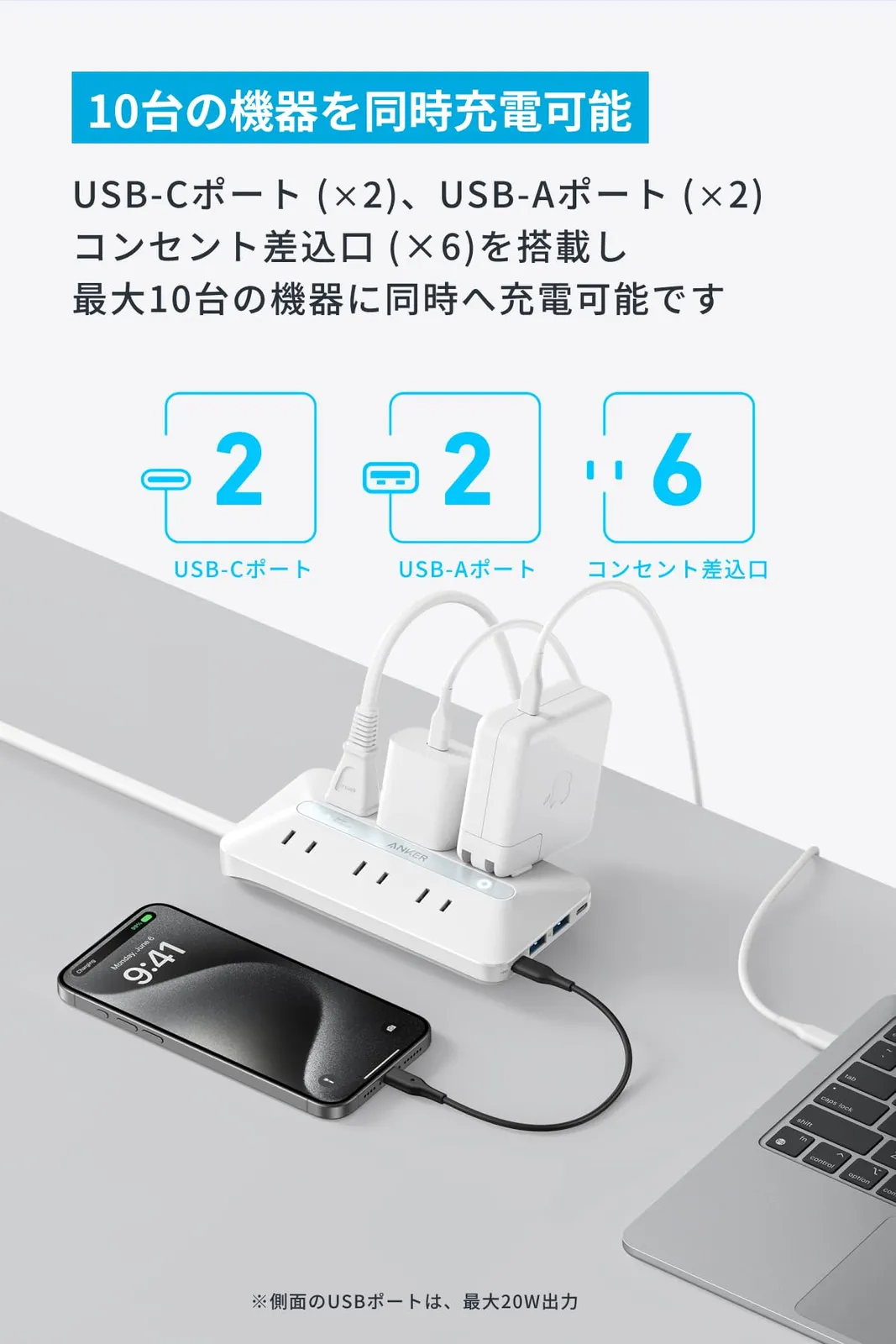 Anker USB Power Strip (10-in-1 20W) (電源タップ 6個口 延長コード1.5m USBタップ AC差込口/USB-C/USB-A)