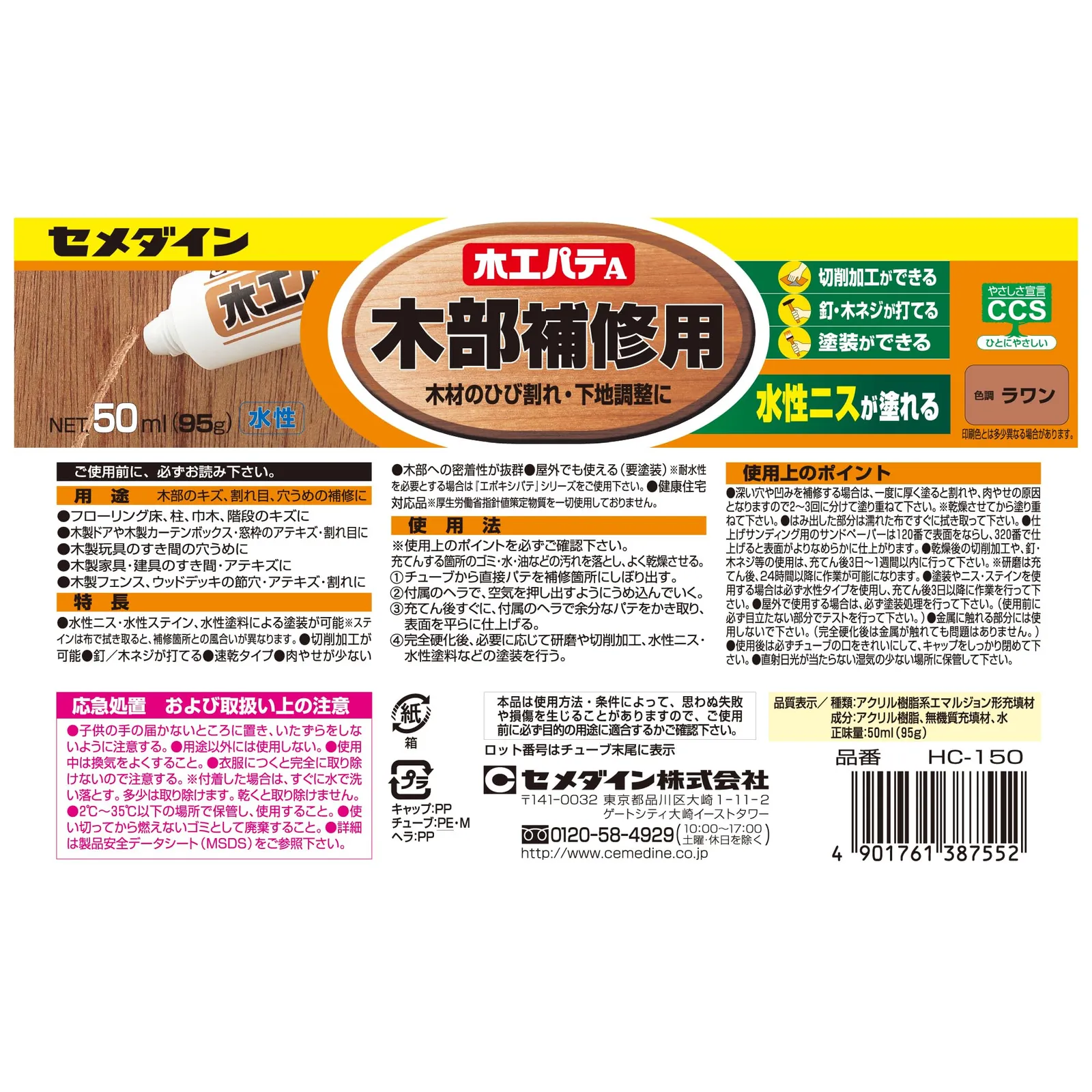【特価セール】ラワン 木工パテA 50ml 木部補修用 HC-150 セメダイン(Cemedine)
