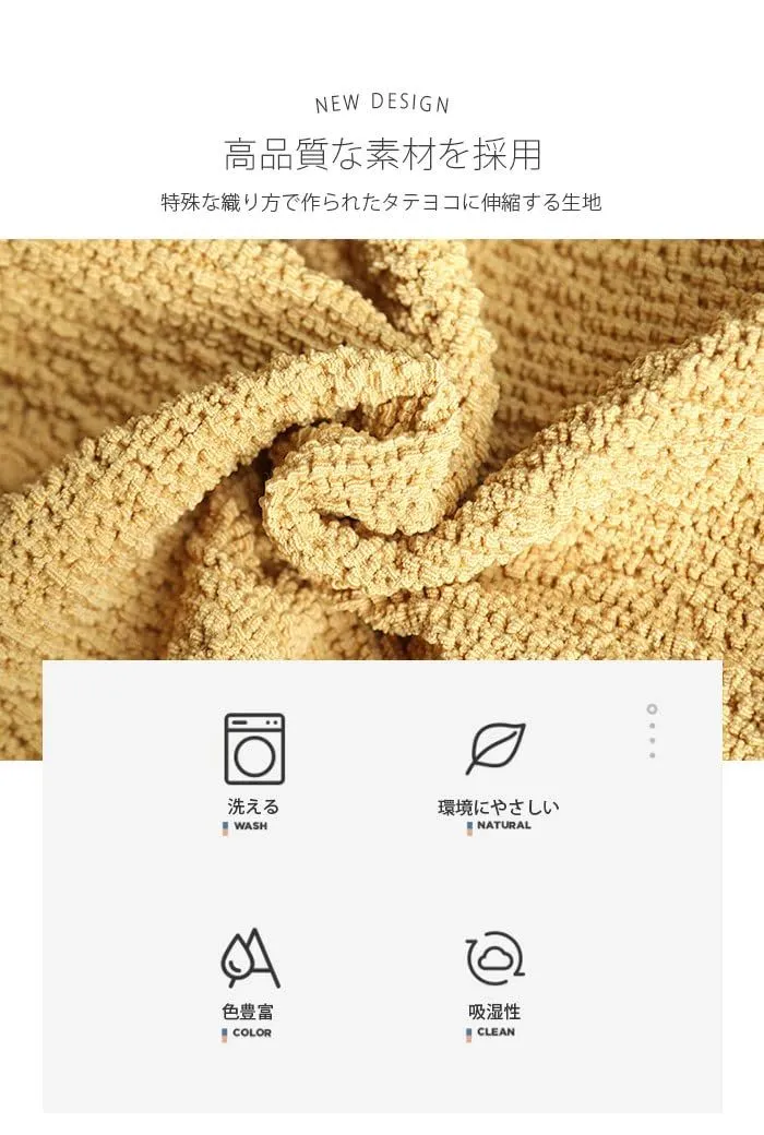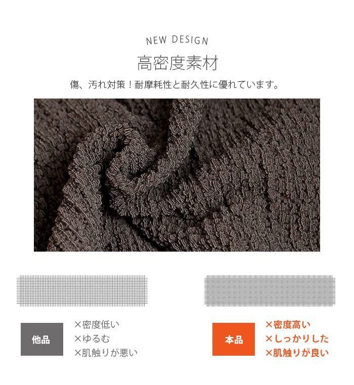 【高級感あるストレッチ素材】 しぼ感がやさしい風合い、伸縮性の高い素材を使用しています。特殊な織り方で作られた縦横に伸縮する生地が椅子にぴったりフィット。 通常のチェアにかぶせるだけで気軽に模様替えができます。綿混素材を採用しており、肌触りがよく季節を問わず、いつでも楽しんで暮らします。