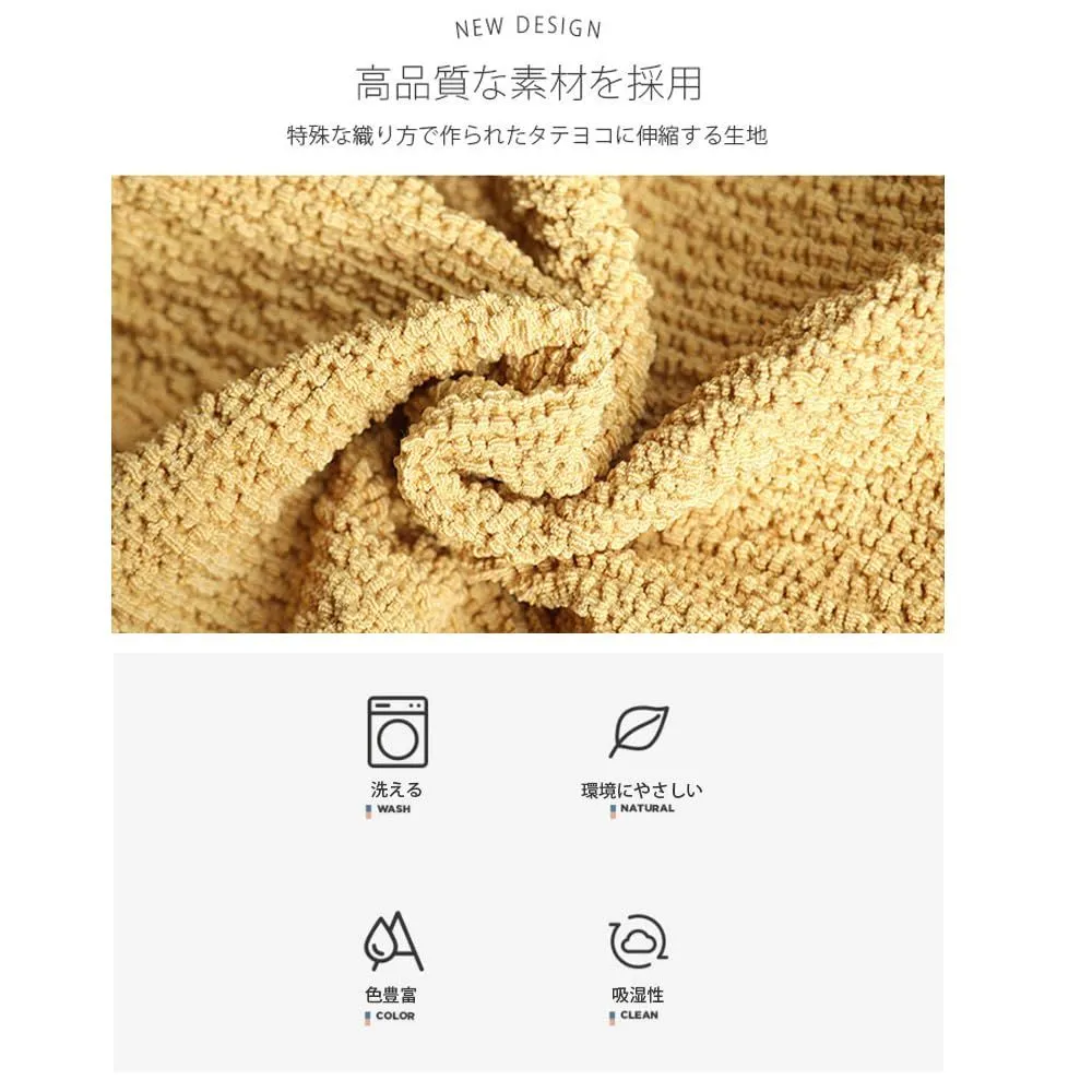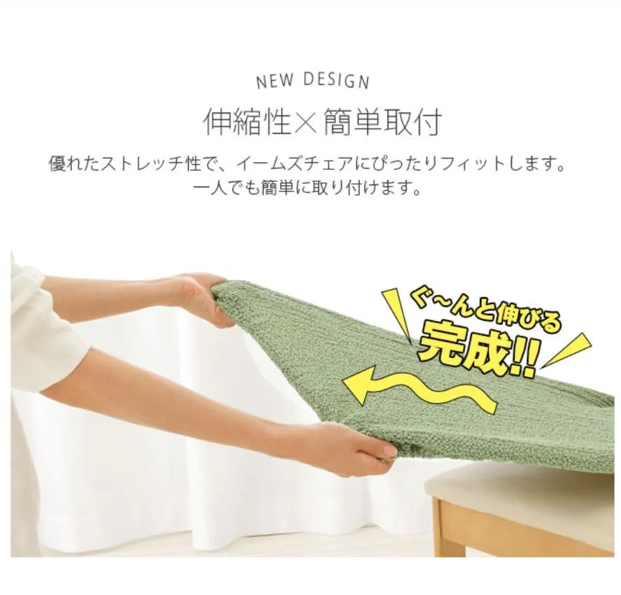 ?ストレッチ素材:しぼ感がやさしい風合い、伸縮性の高い素材を使用しています。特殊な織り方で作られた縦横に伸縮する生地が椅子にぴったりフィット。通常のチェアにかぶせるだけで気軽に模様替えができます。綿混素材を採用しており、肌触りがよく季節を問わず、いつでも楽しんで暮らします。