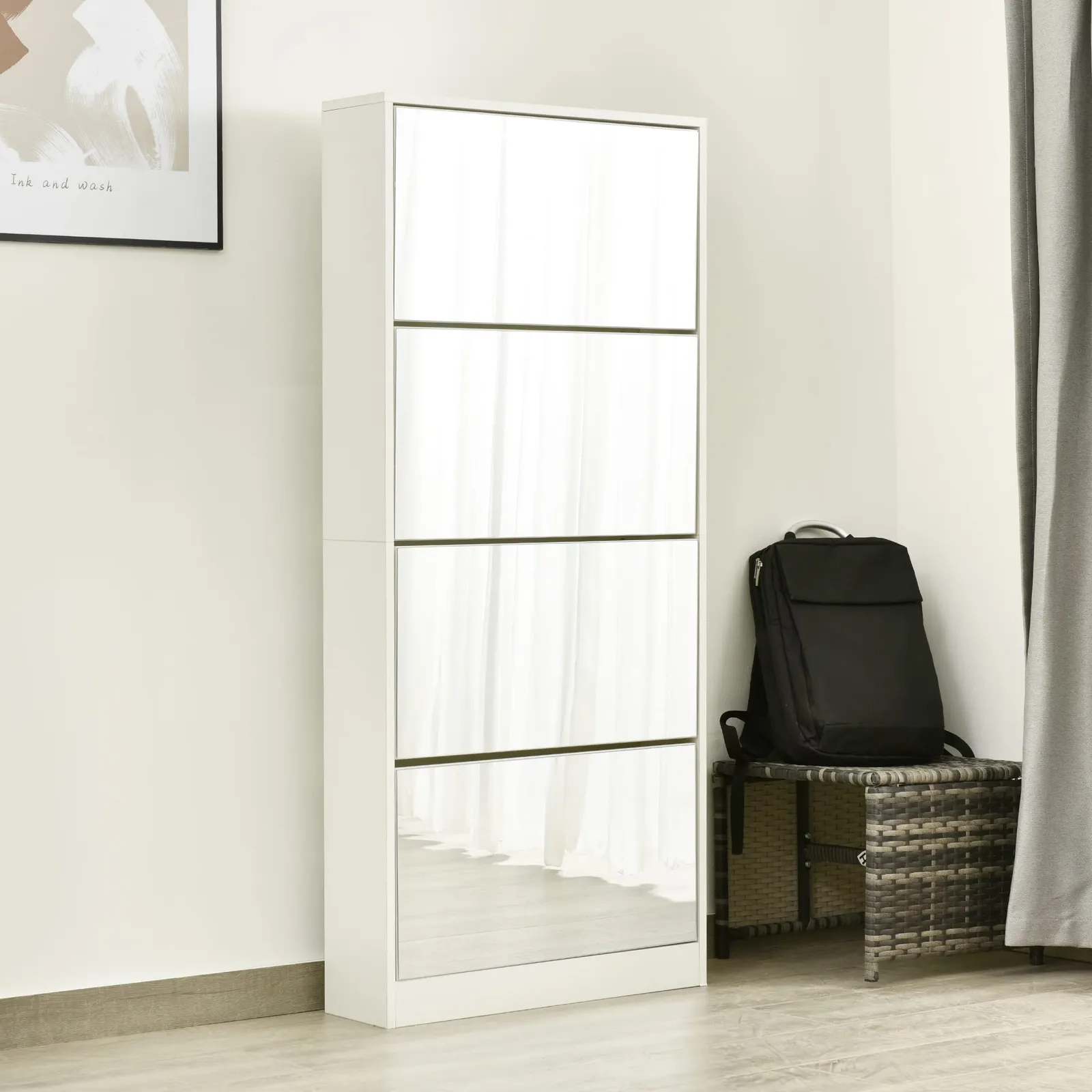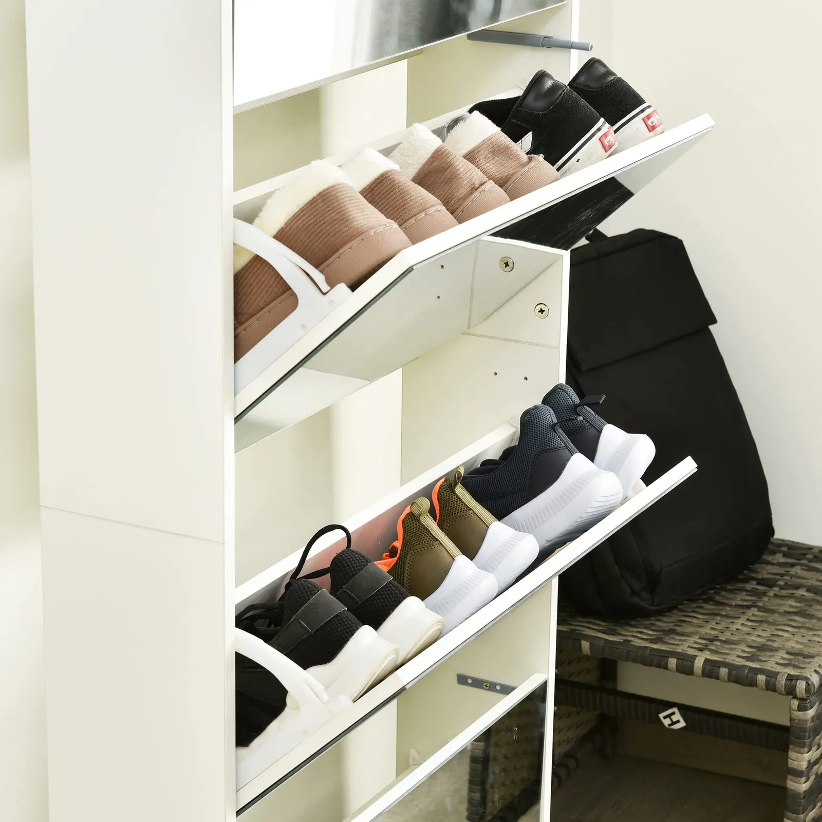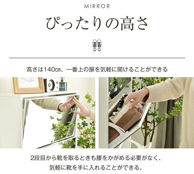 【全身鏡の機能で、自己表現の完成度を向上】出かける前の一瞬を、まるで舞台の幕開けのように演出。シューズラックと全身鏡が一体となり、日々のスタイルチェックに華やかさをプラスします